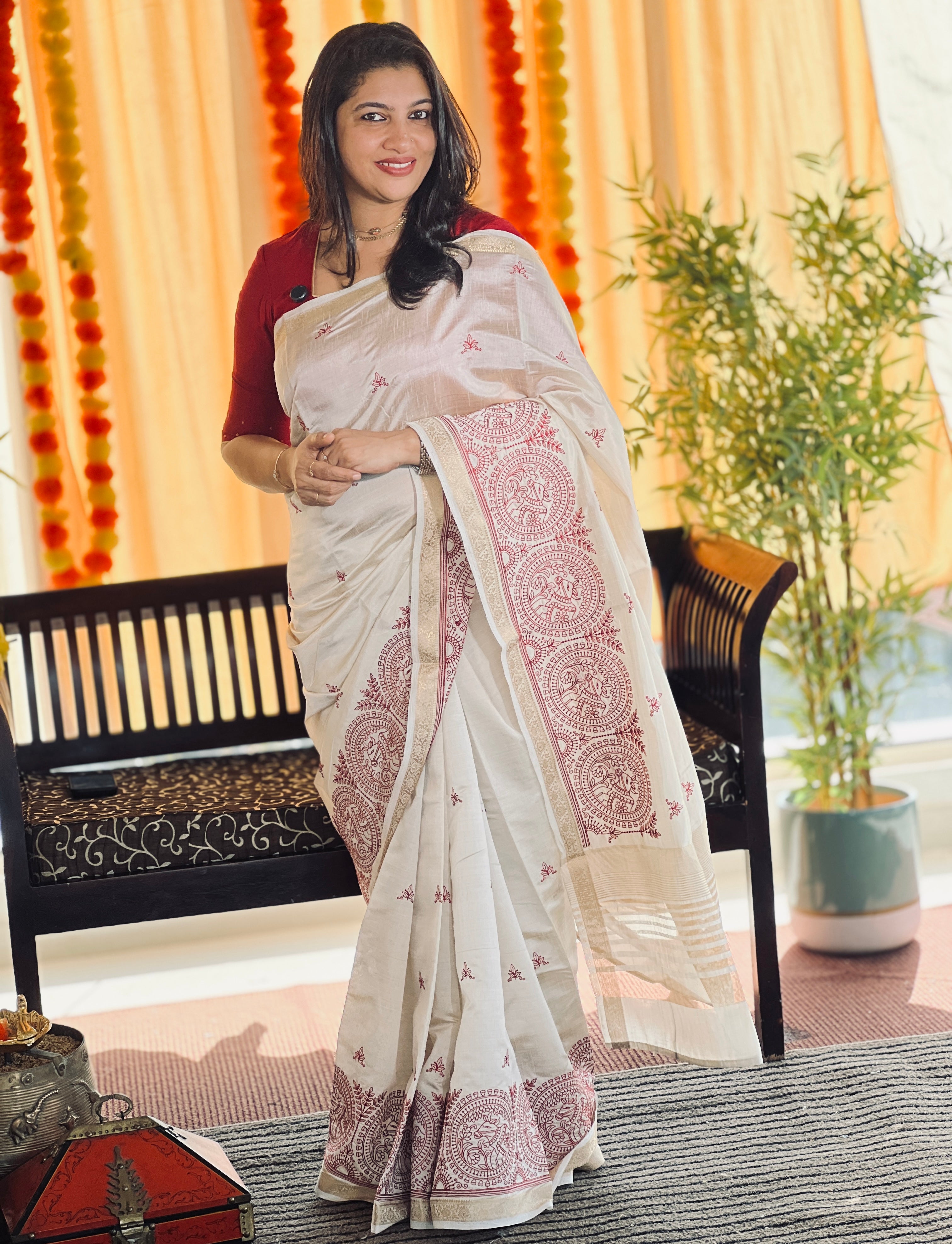- Style: Circular Pattern Madhubani Inspired Computerized Machine Kantha Embroidery Detailing, Scattered Butta, Banarasi Weaved Border Detailing, Stripes Weaving Patterned Pallu