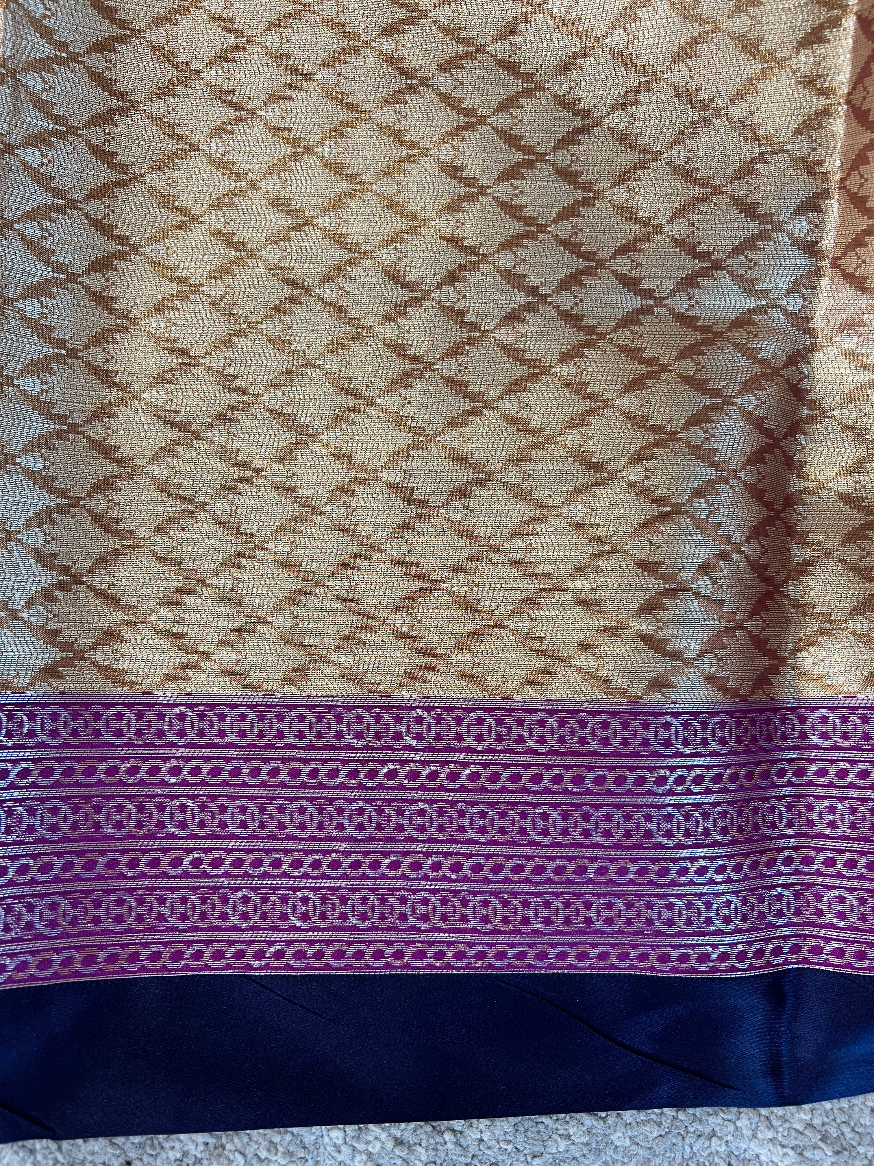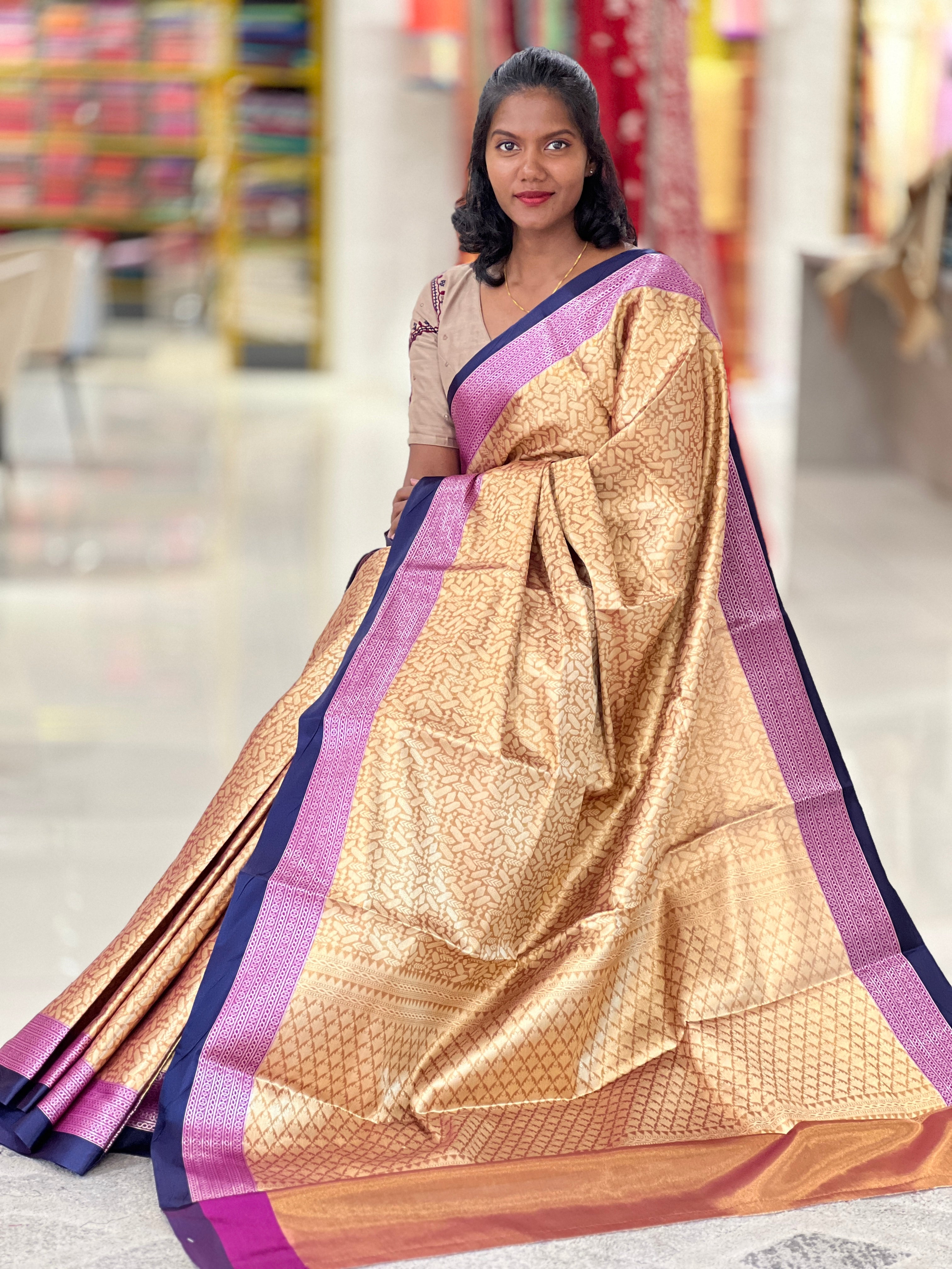 - Style: Copper Tinted Golden Zari Woven, Double Contrast Satin Weaved Borders, Brocade Patterned Pallu