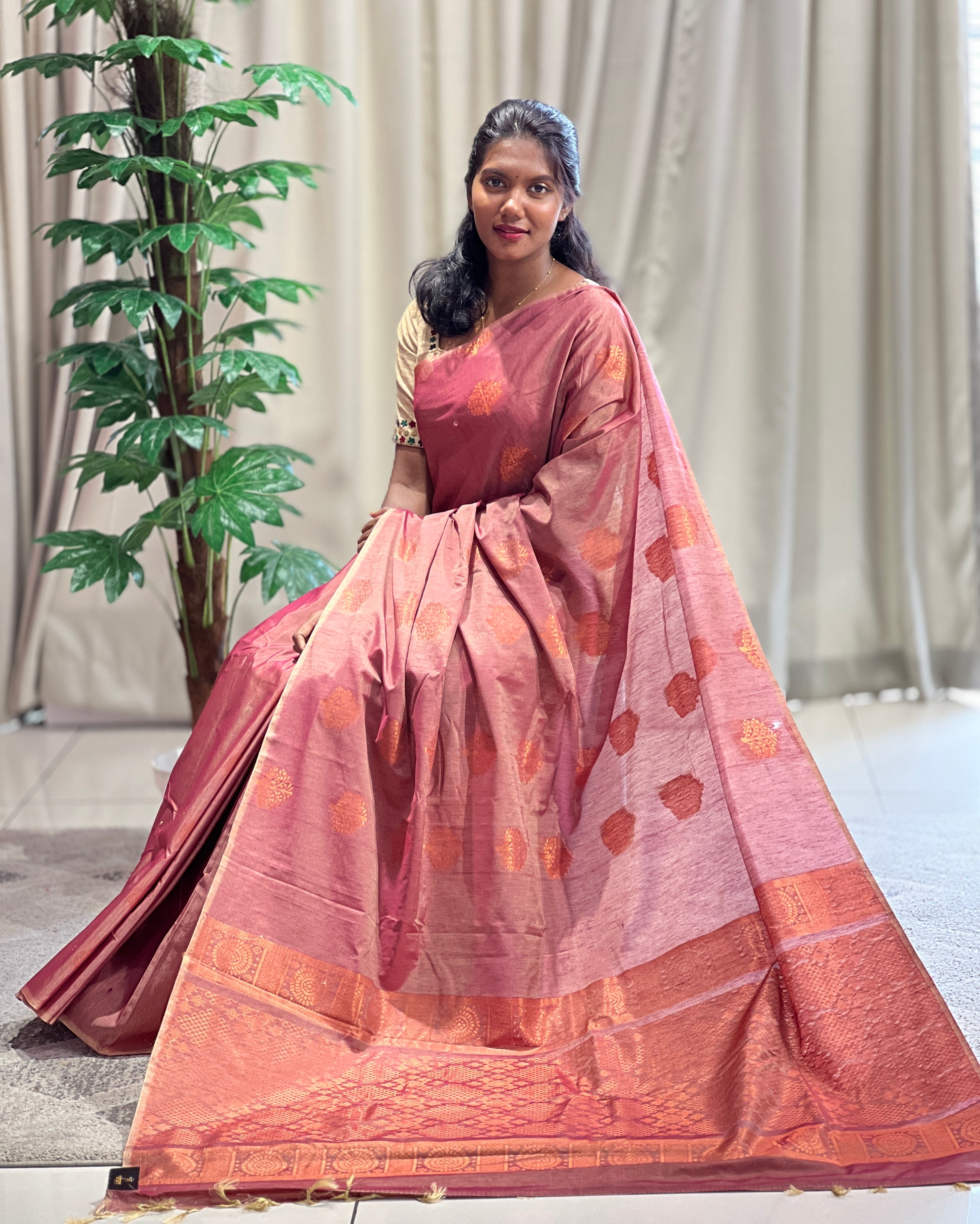 - Style: Copper Zari Weaved Scattered Butta Detailing, Brocade Pallu