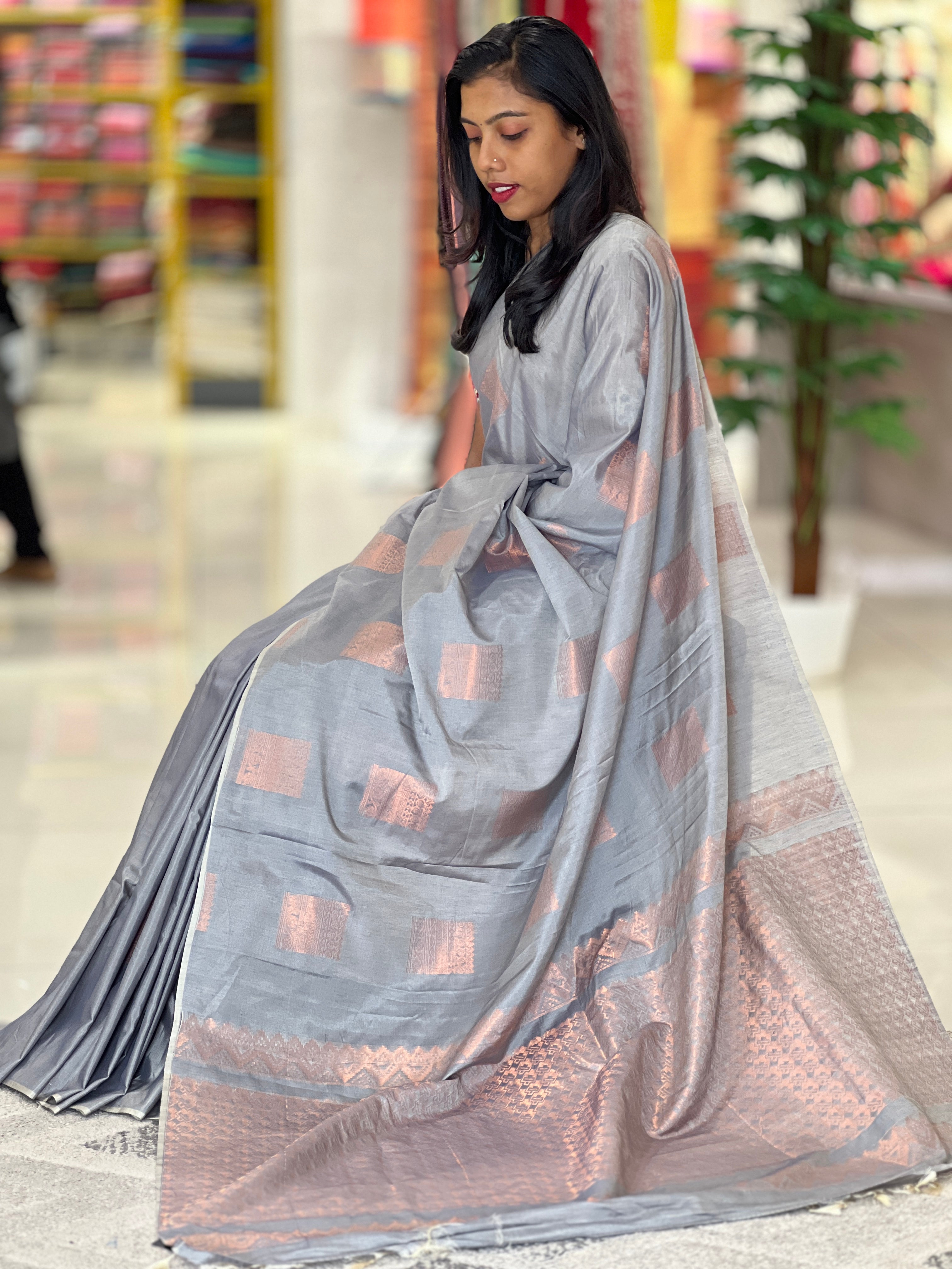 - Style: Copper Zari weaved Scattered Geometric Butta Detailing, Brocade Pallu