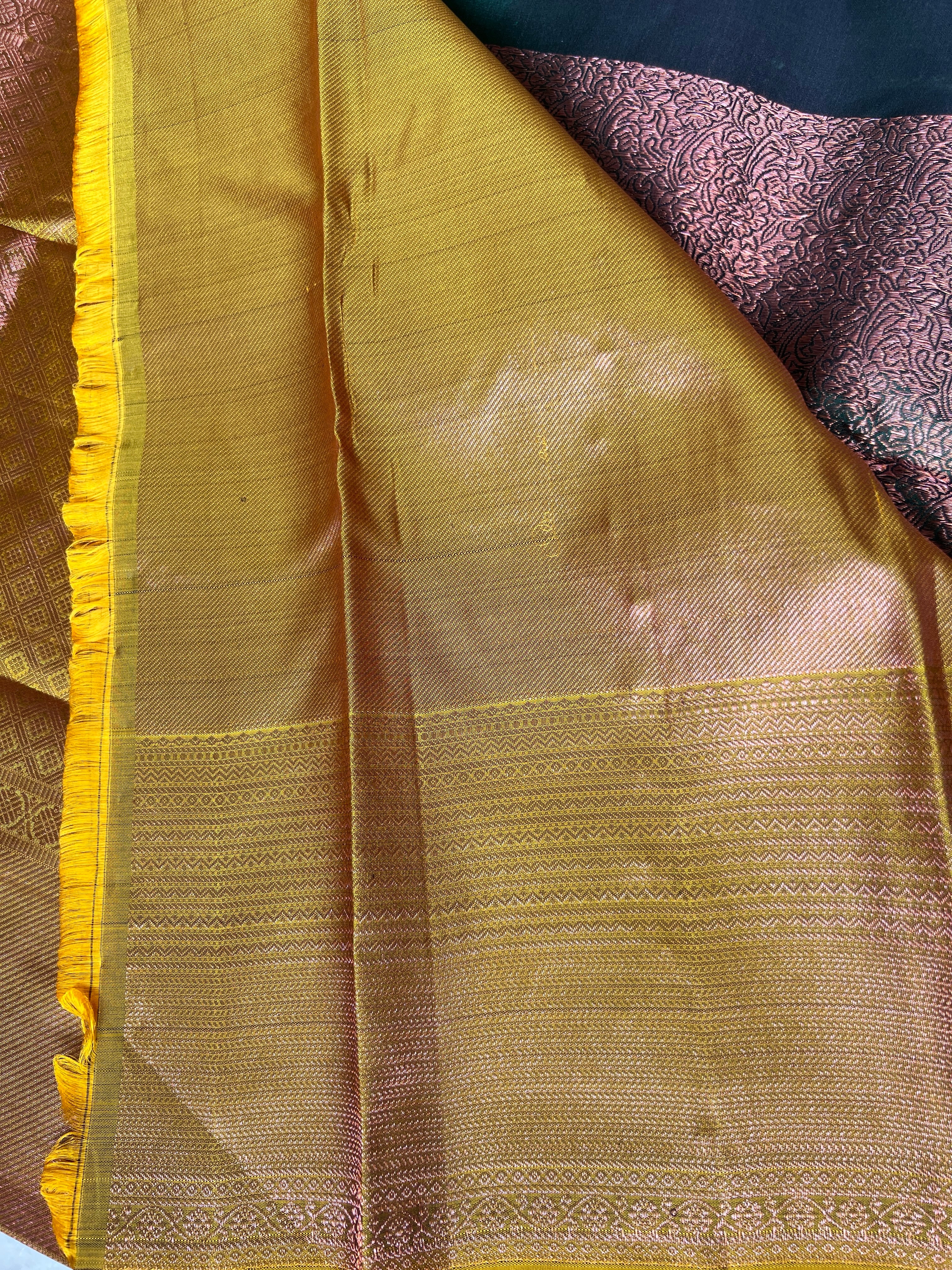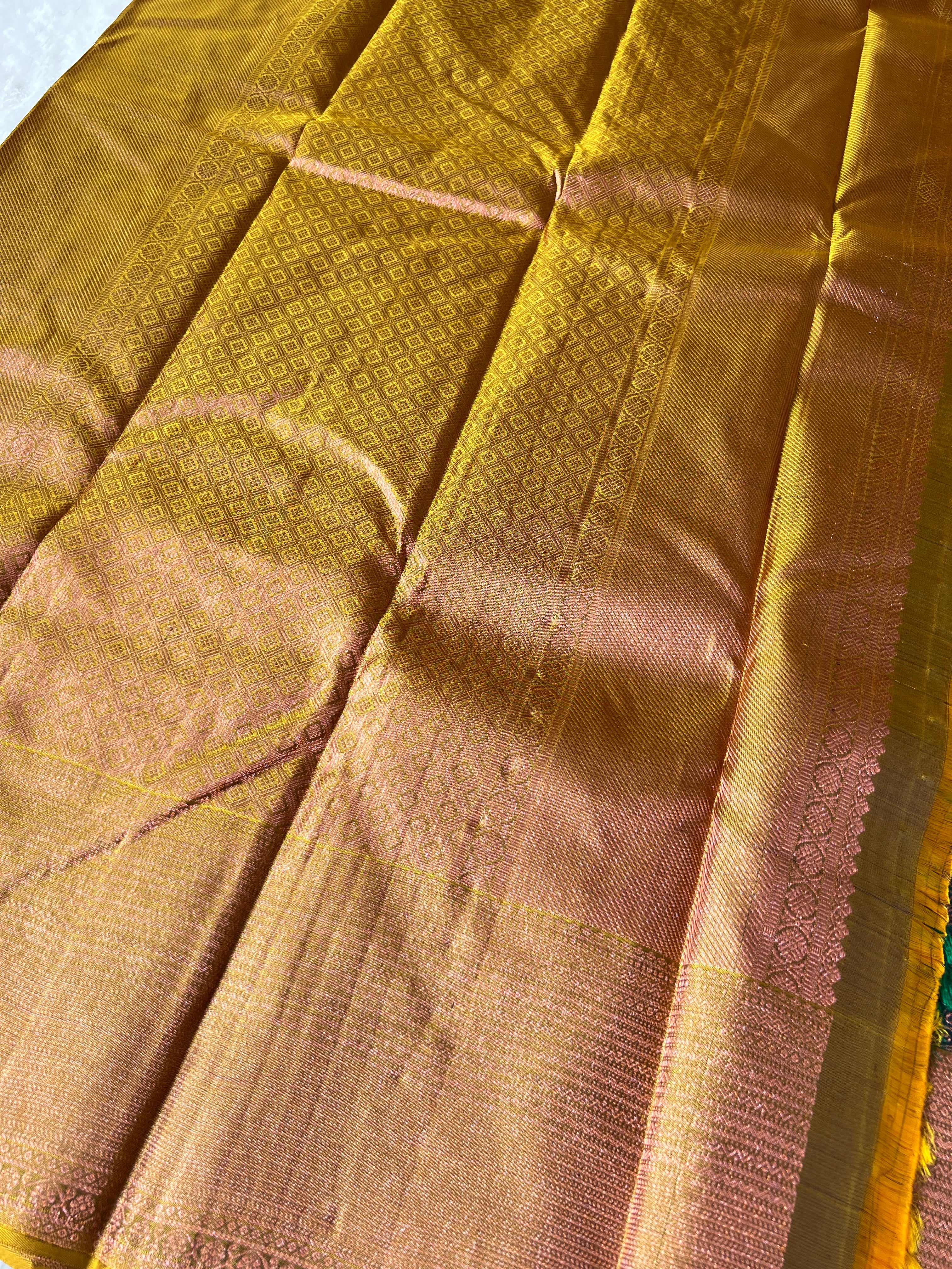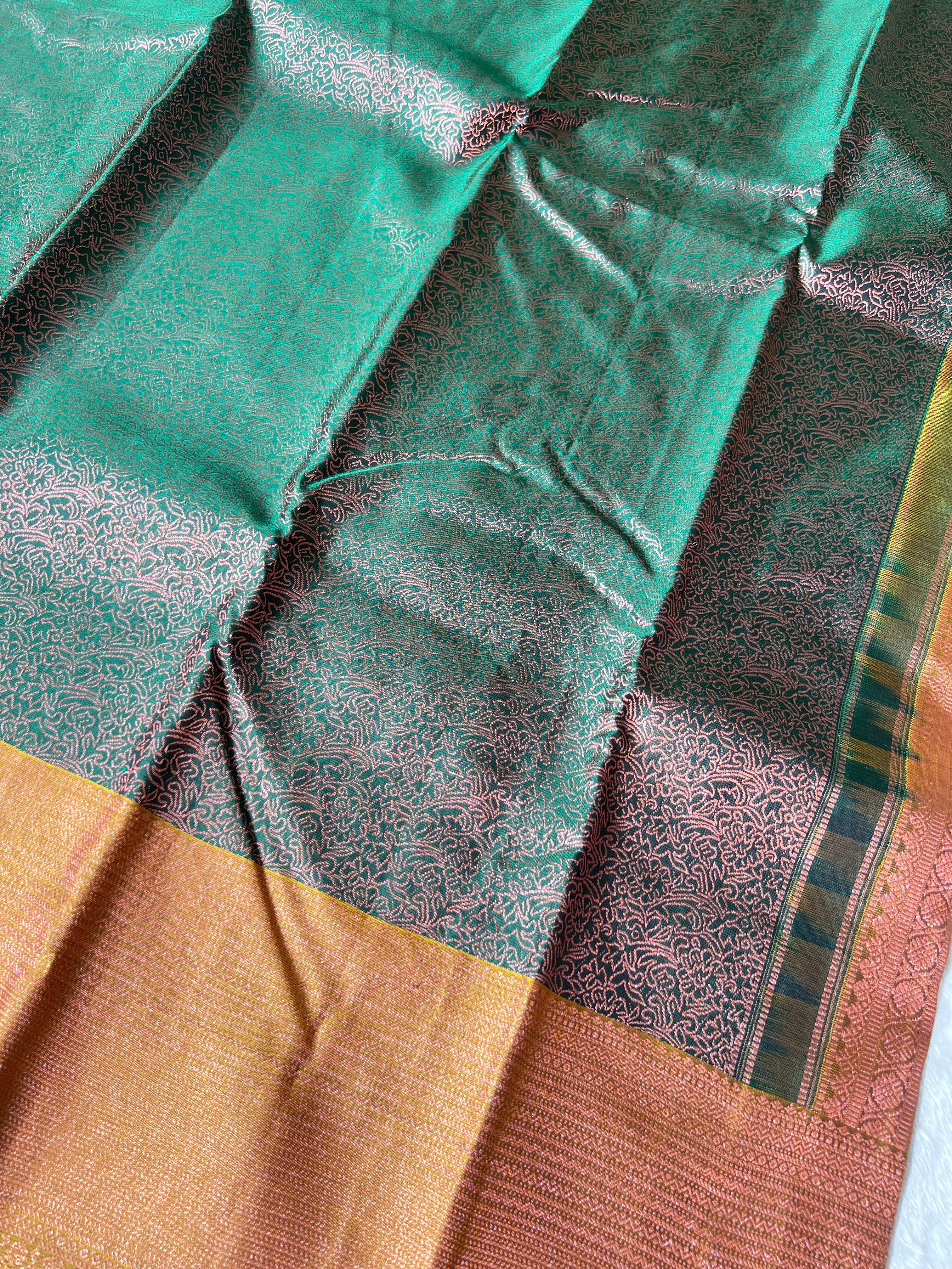 - Style: Floral Jaal Pattern, Copper Zari Woven, Handloom, Contrast Diamond Patterned Pallu, Contrast Borders