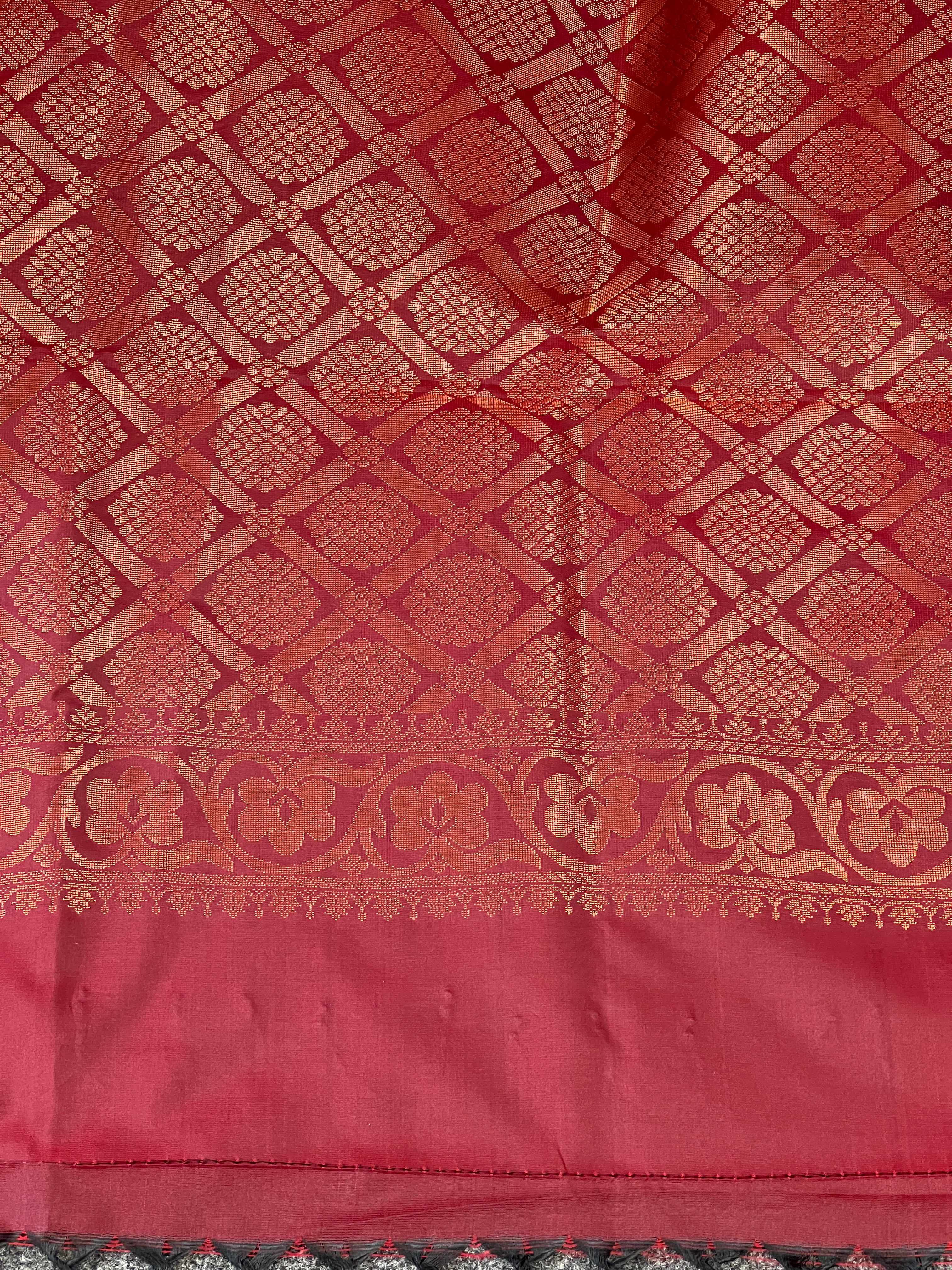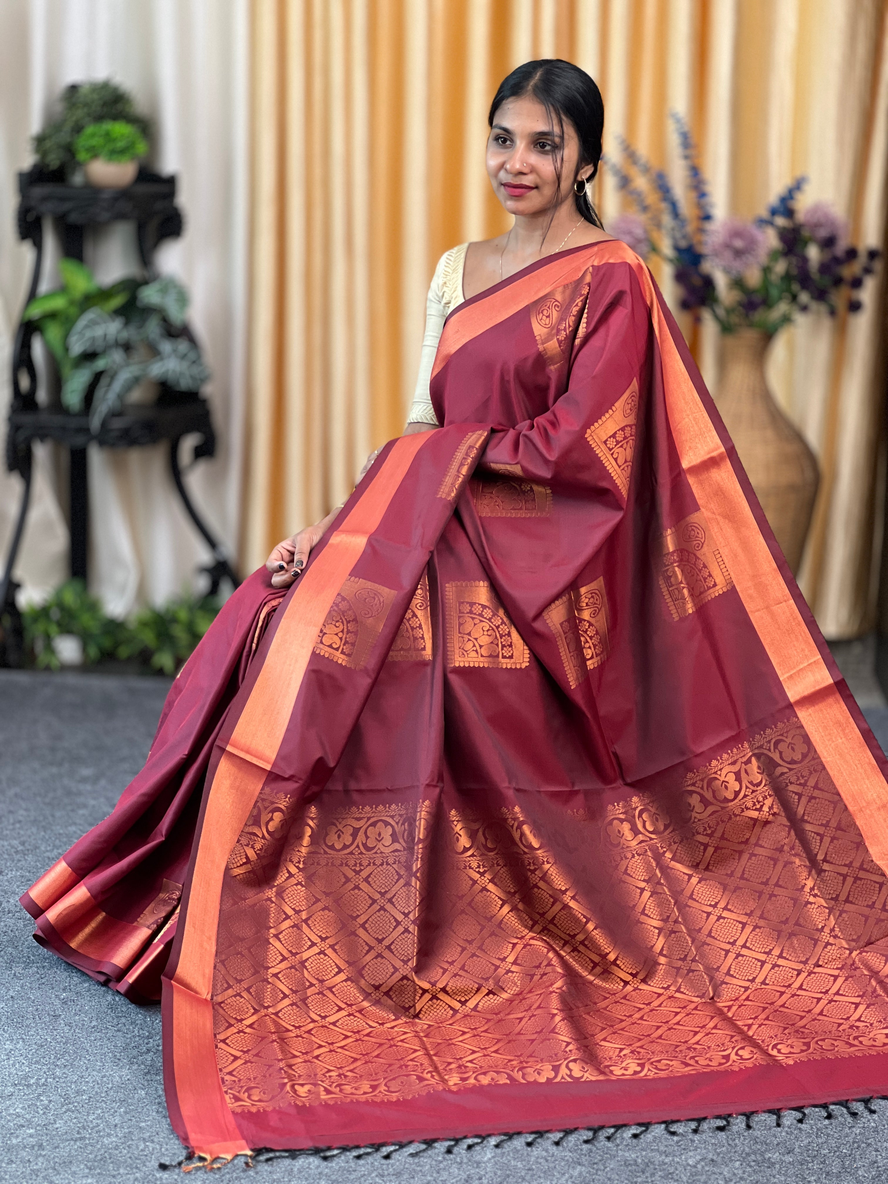 - Style: Copper Zari Woven Borders & Square Motis, Diagonal Patterned Pallu