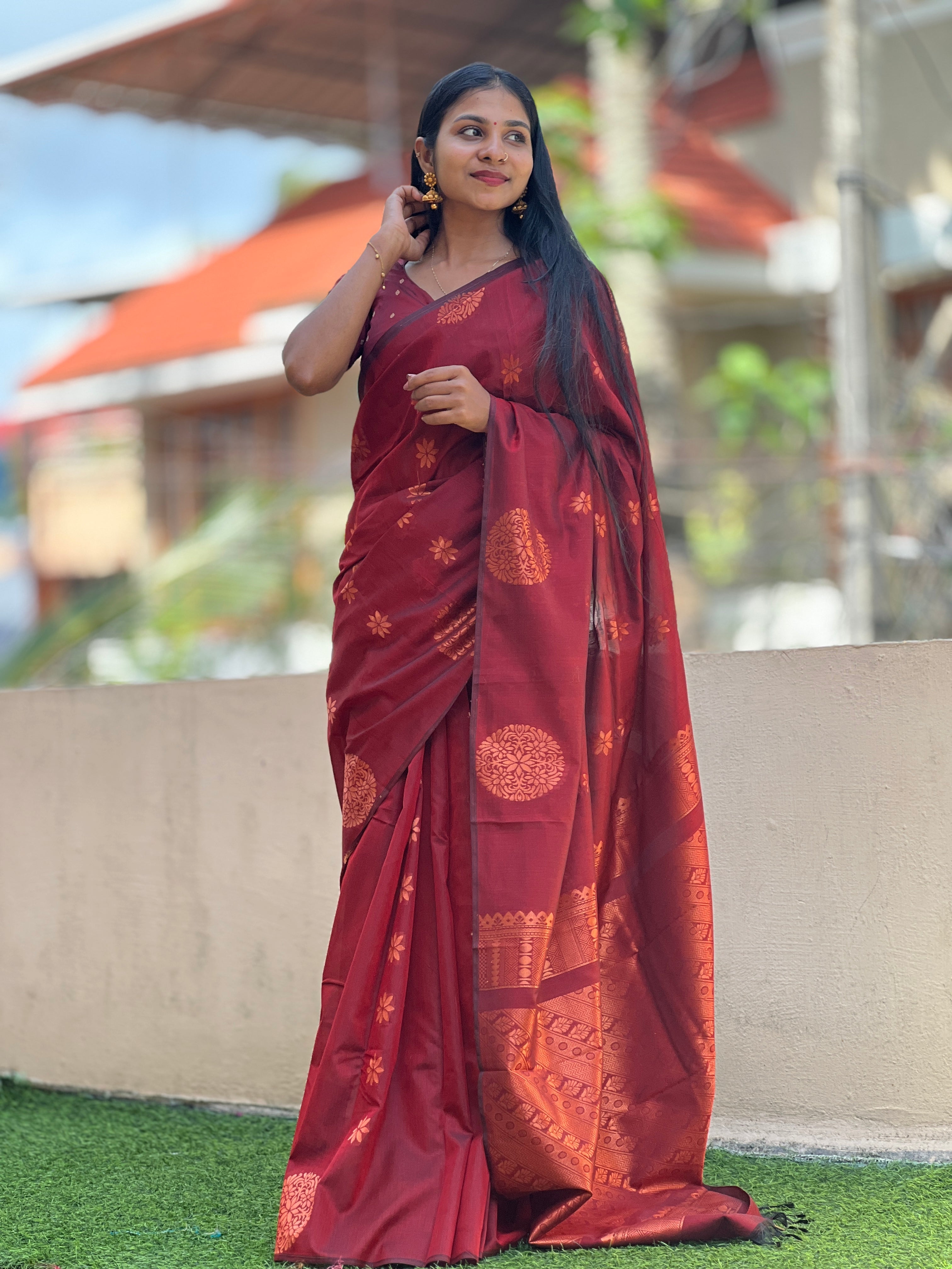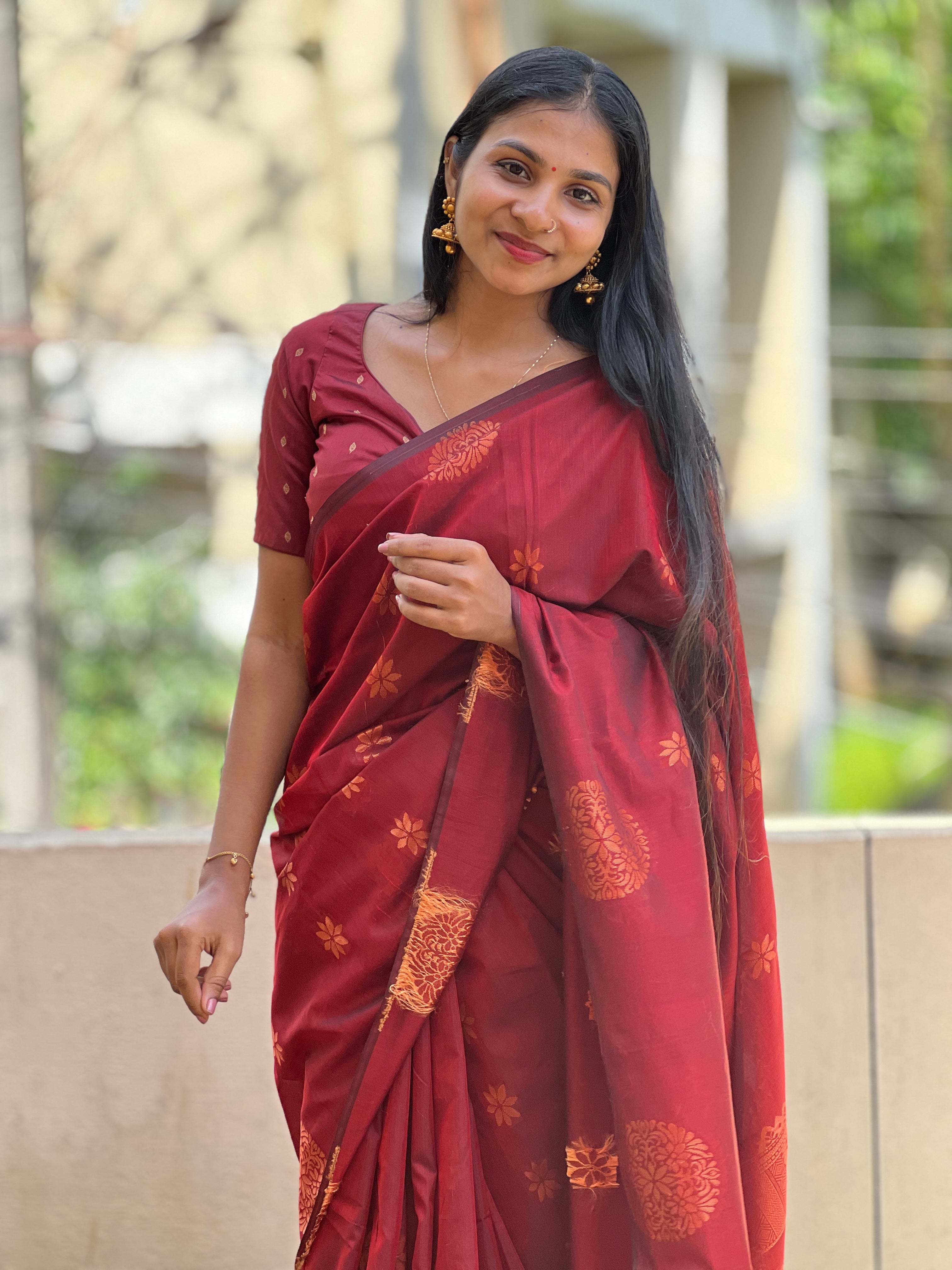• Style: Copper Zari Weaving Pattern, Traditional Floral Butas, Zari Woven Geometric & Floral Patterned Pallu