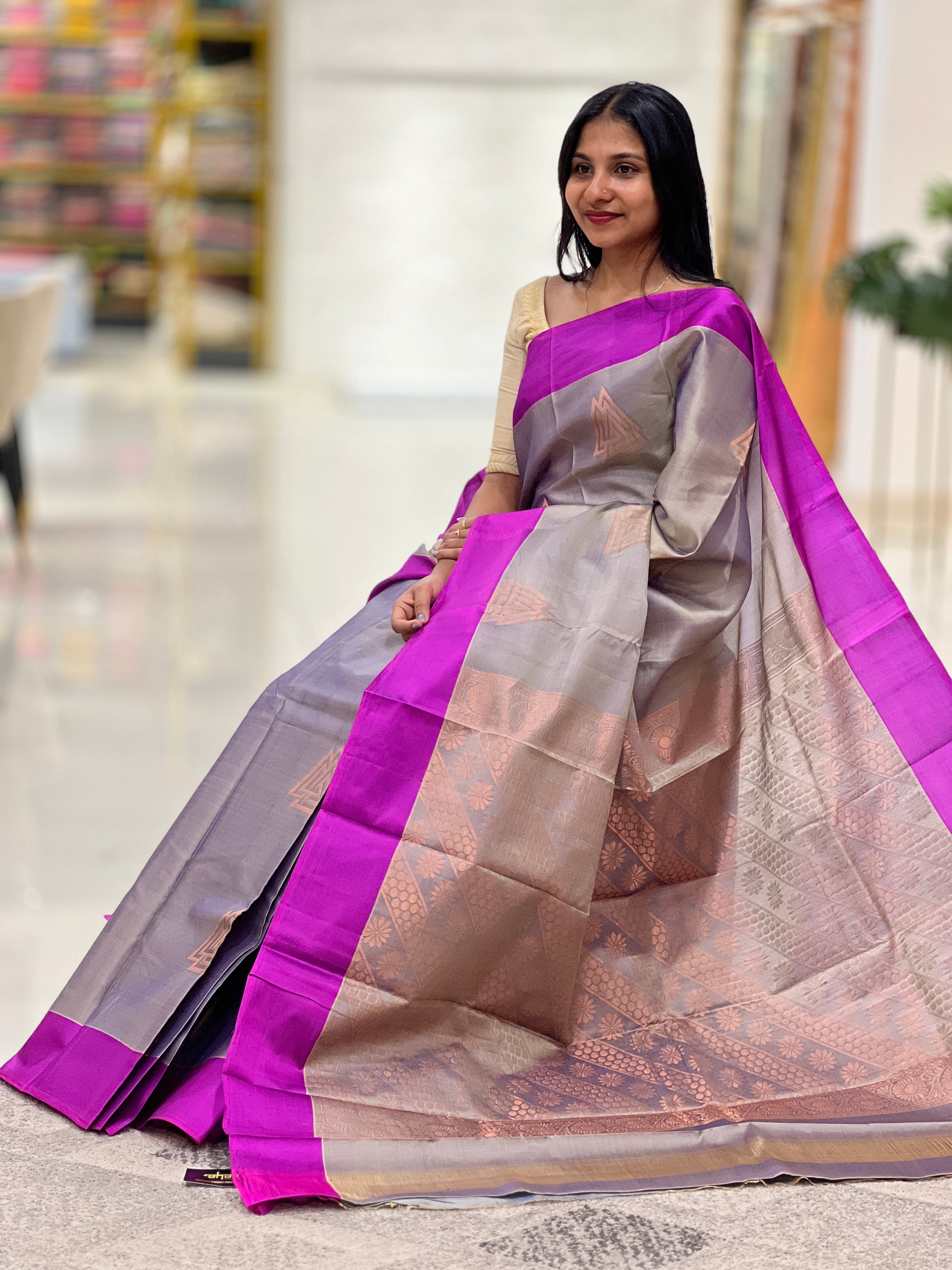• Style: Copper Zari Weaved Geometric Patterned Butas, Floral & Diagonal Patterned Pallu, Contrast Solid Borders