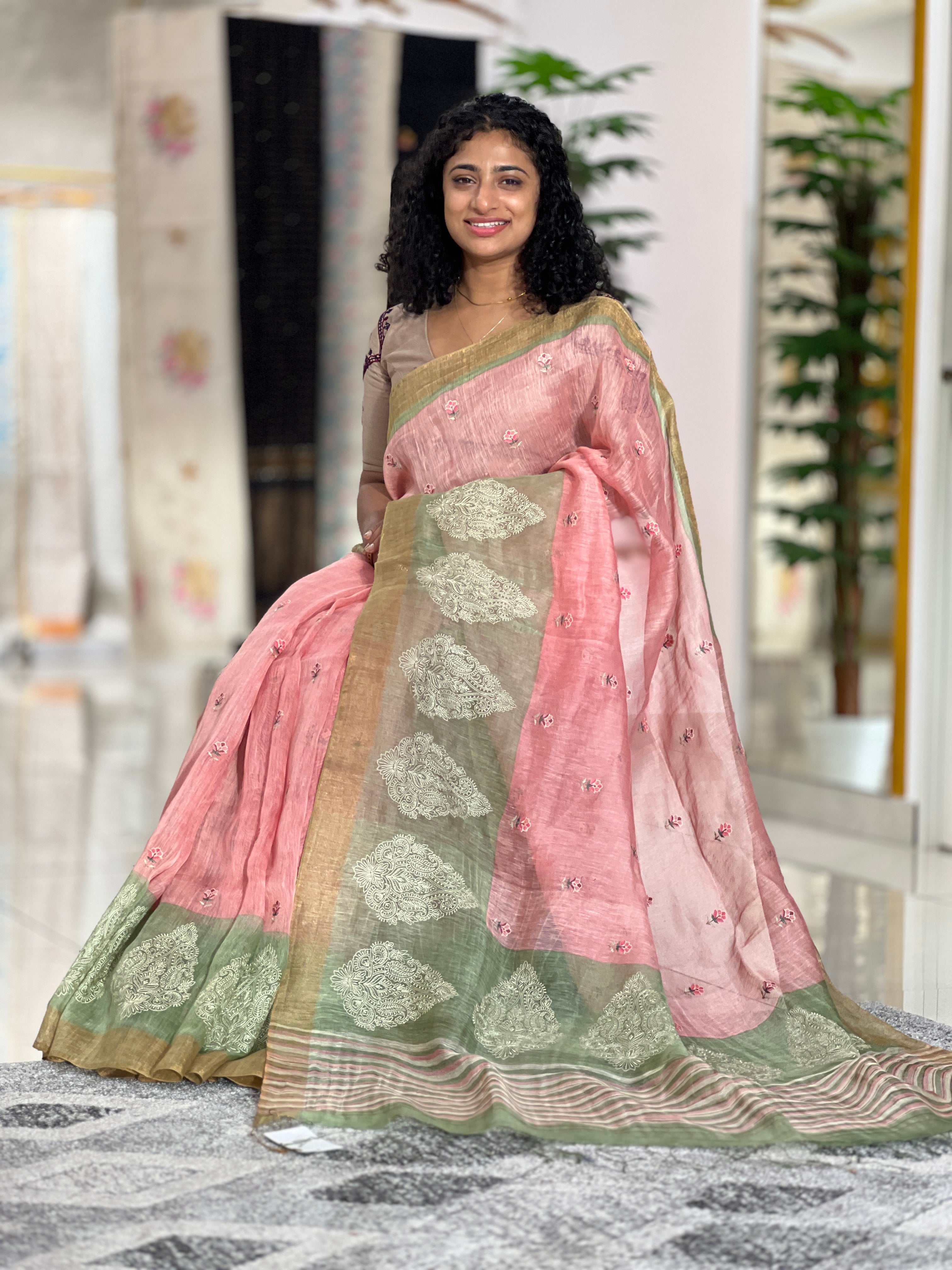 - Style: Floral Cross Stitch Machine Embroidery Detailing, Zari Border, Traditional Motifs On Lower Border & Pallu, Stripe Patterned Pallu