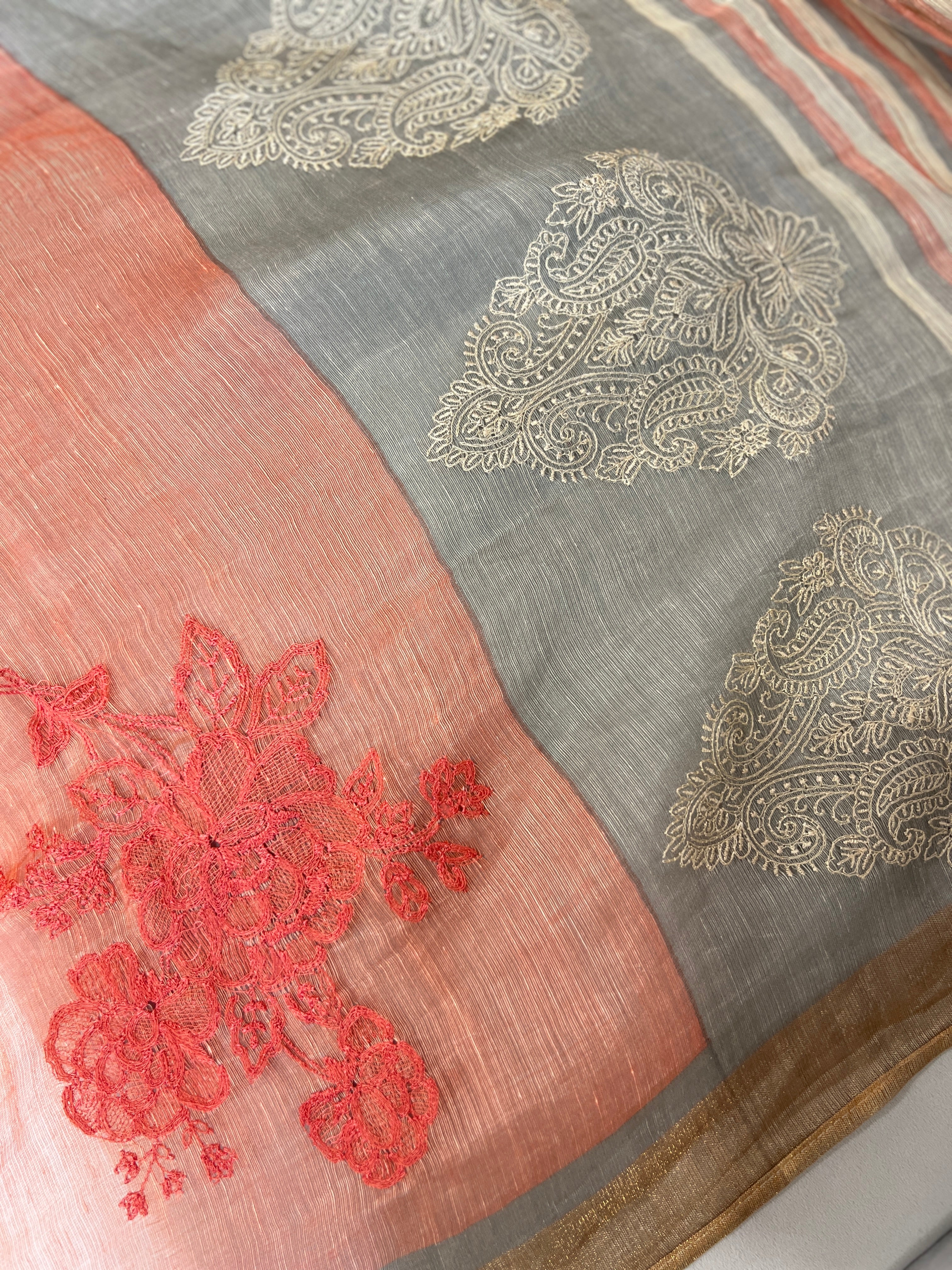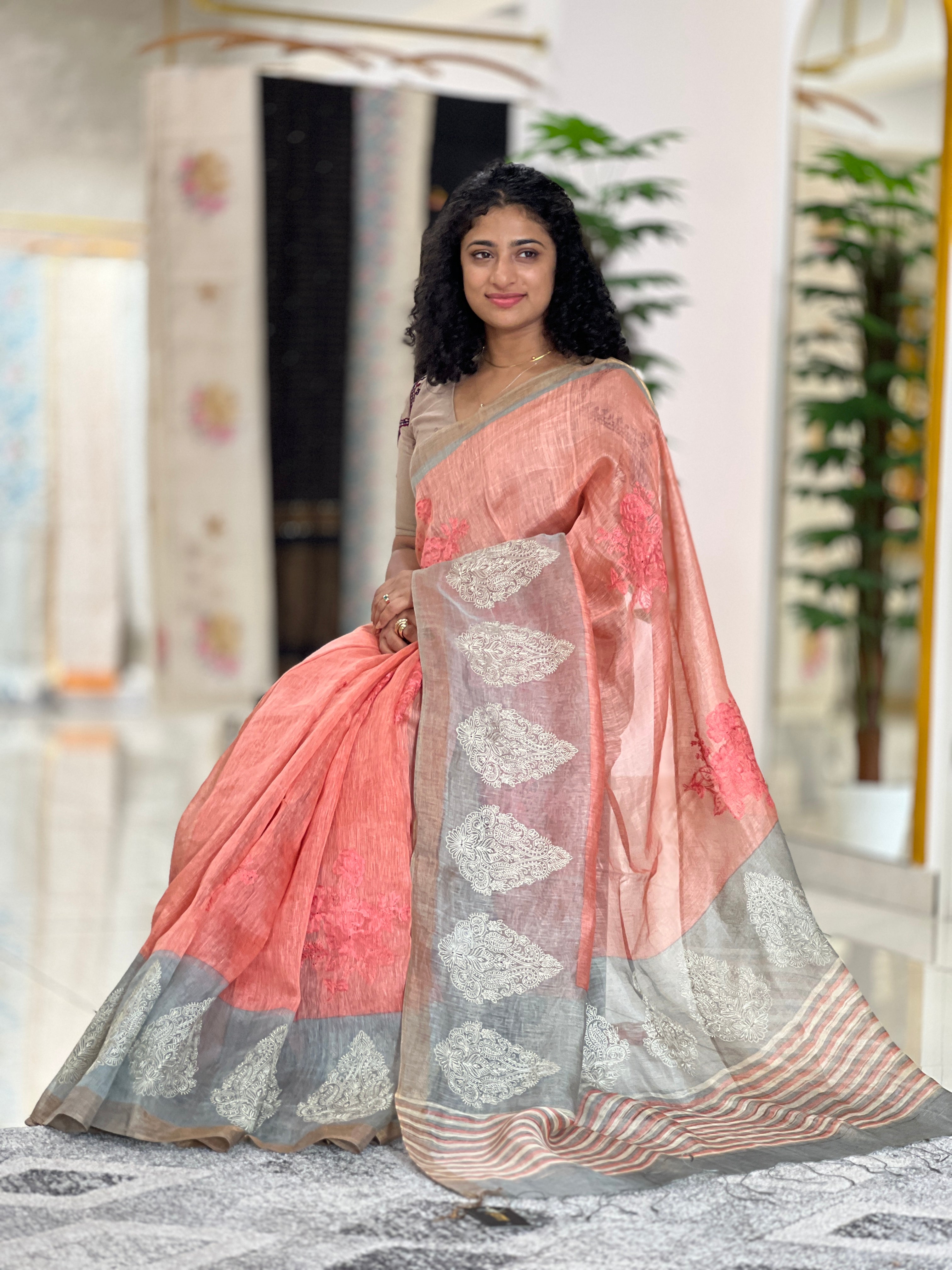 - Style: Floral Cross Stitch Machine Embroidery Detailed Motifs, Double Border, Traditional Motifs On Lower Border, Stripe Patterned Pallu