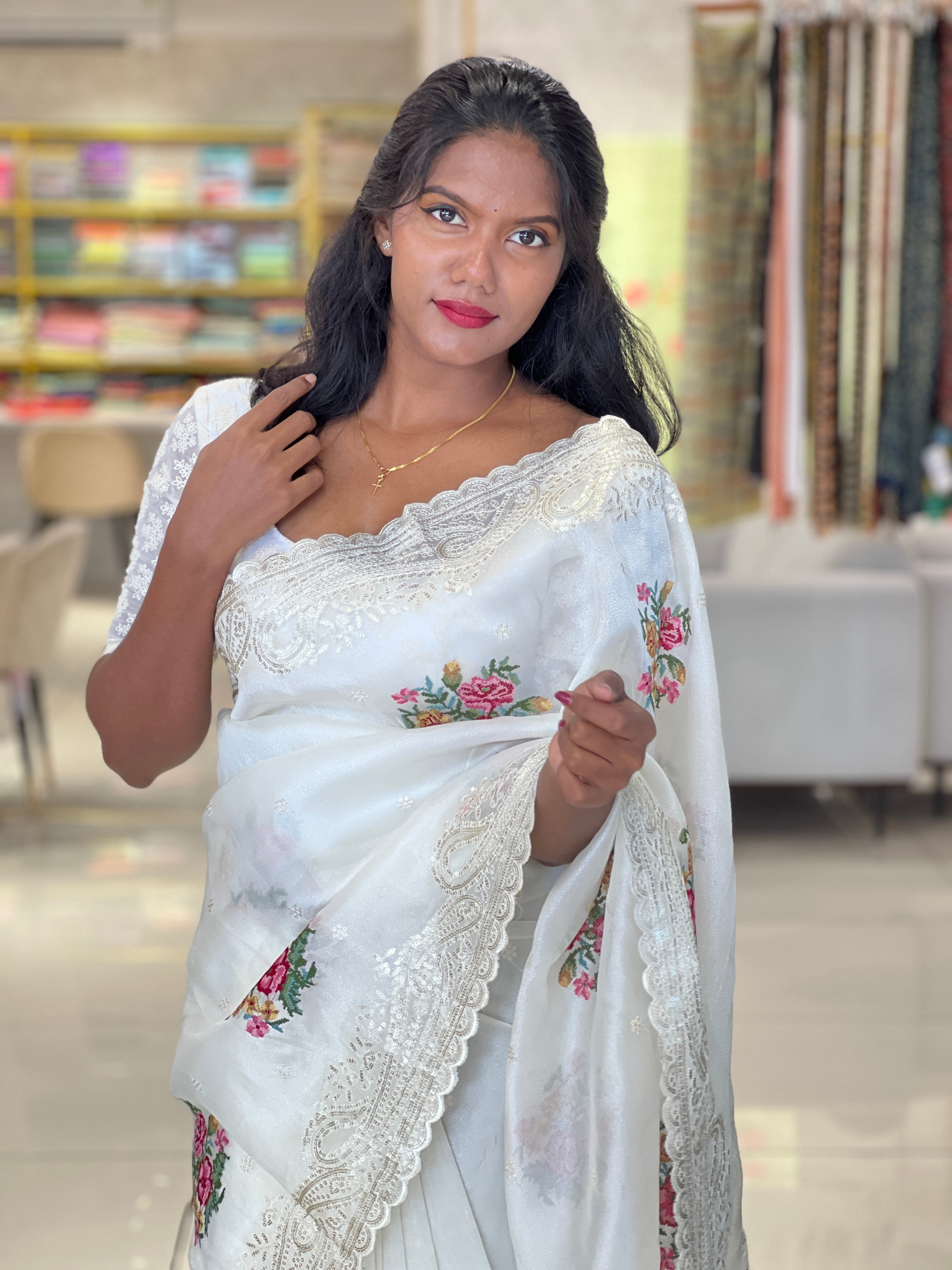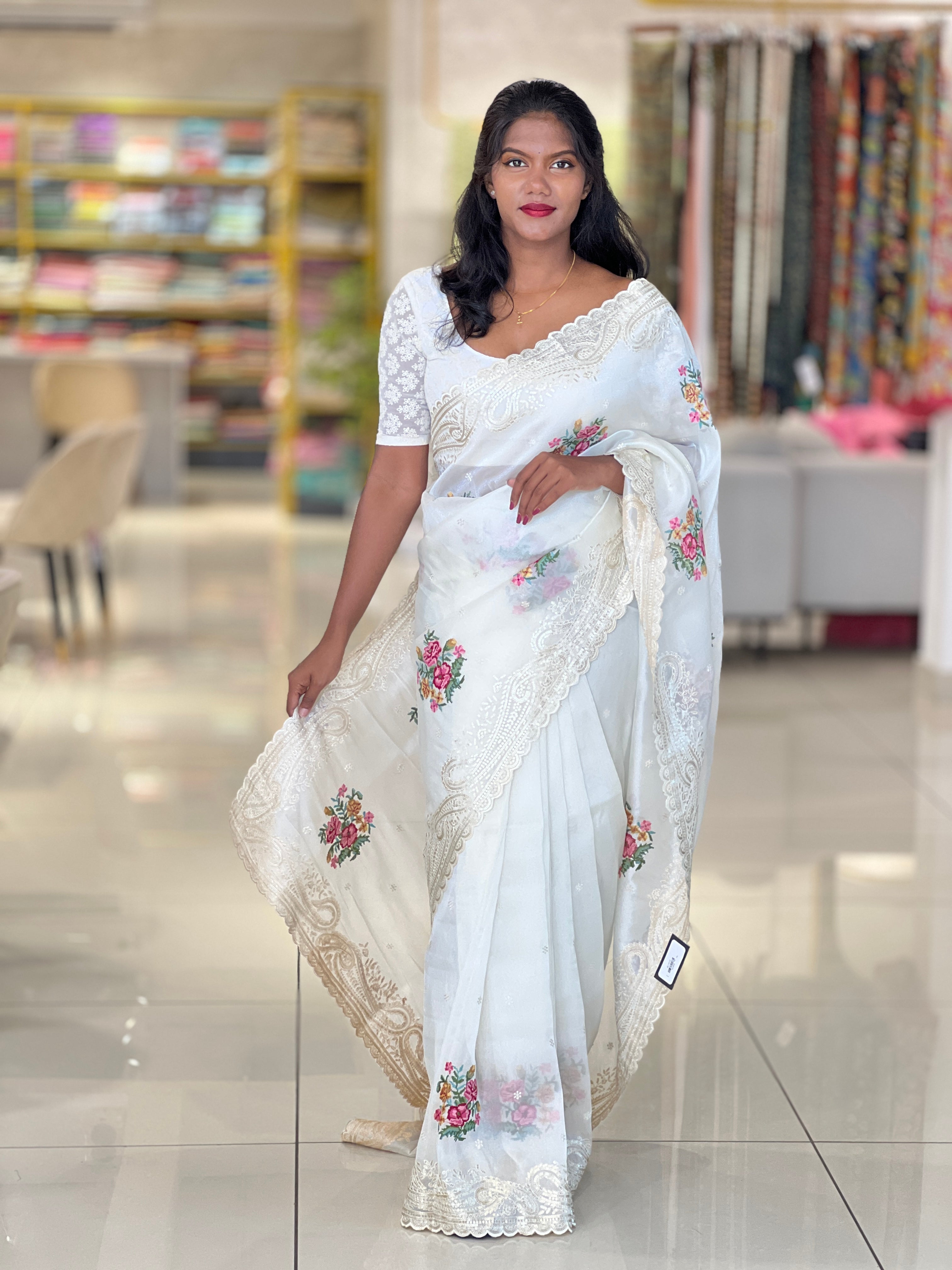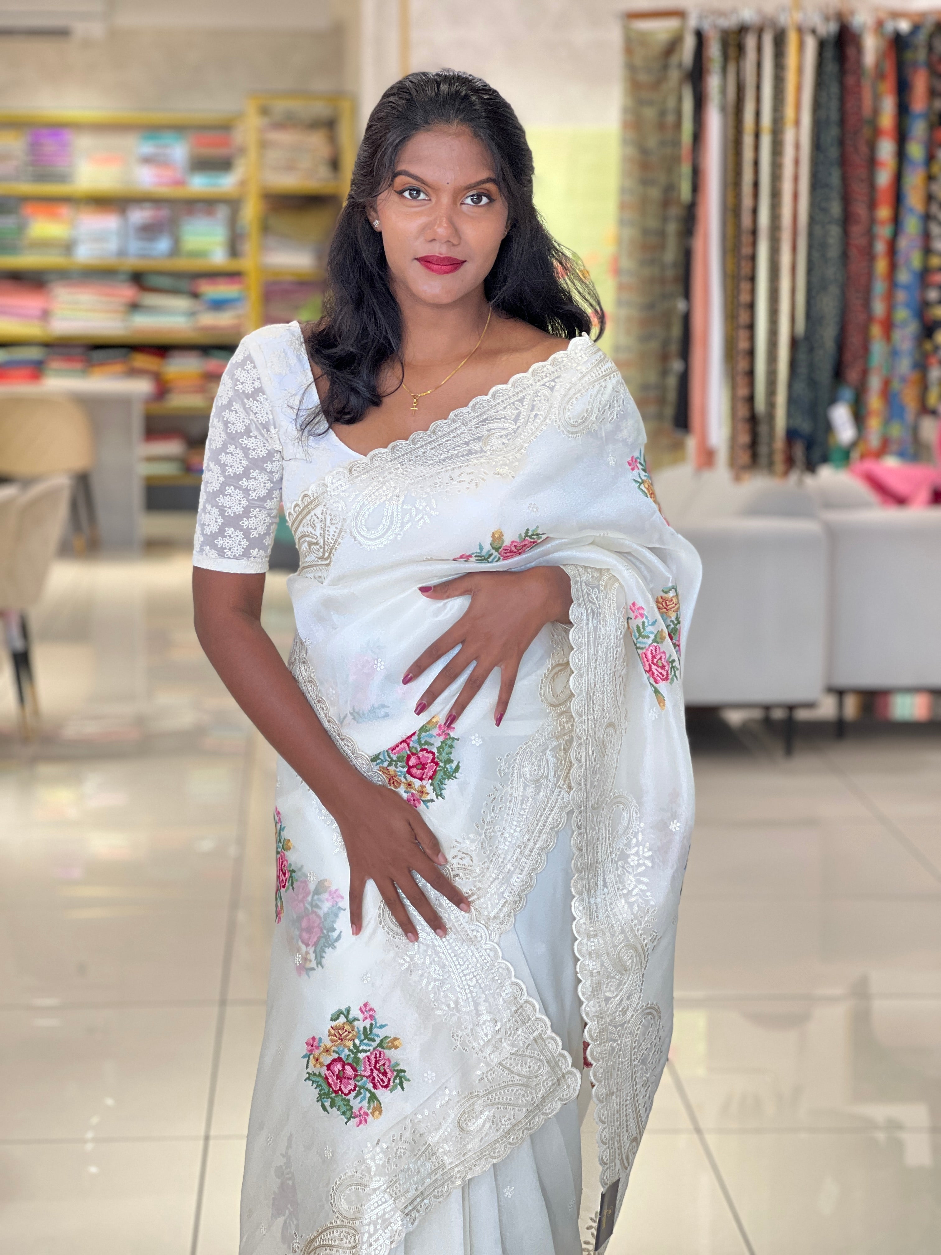 - Style: Scattered Sequins Detailing, Floral Cross Stitch Embroidery, Scallop Edges, Paisley Embroidery With Sequins Detailed Borders