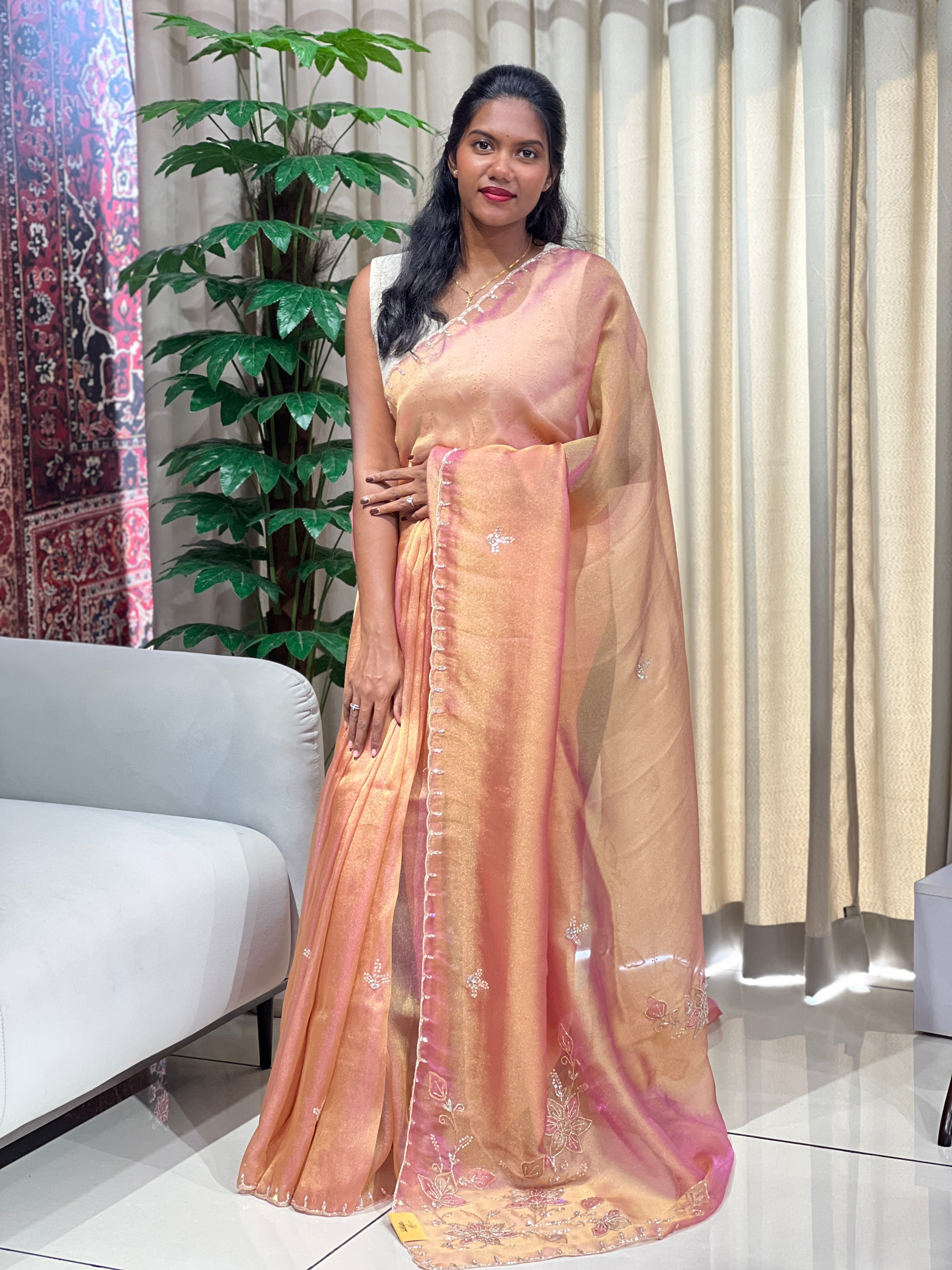 - Style: Applique Pattern On Pallu, Cut Beads And Sticky Stone Detailing,Scallop Finish