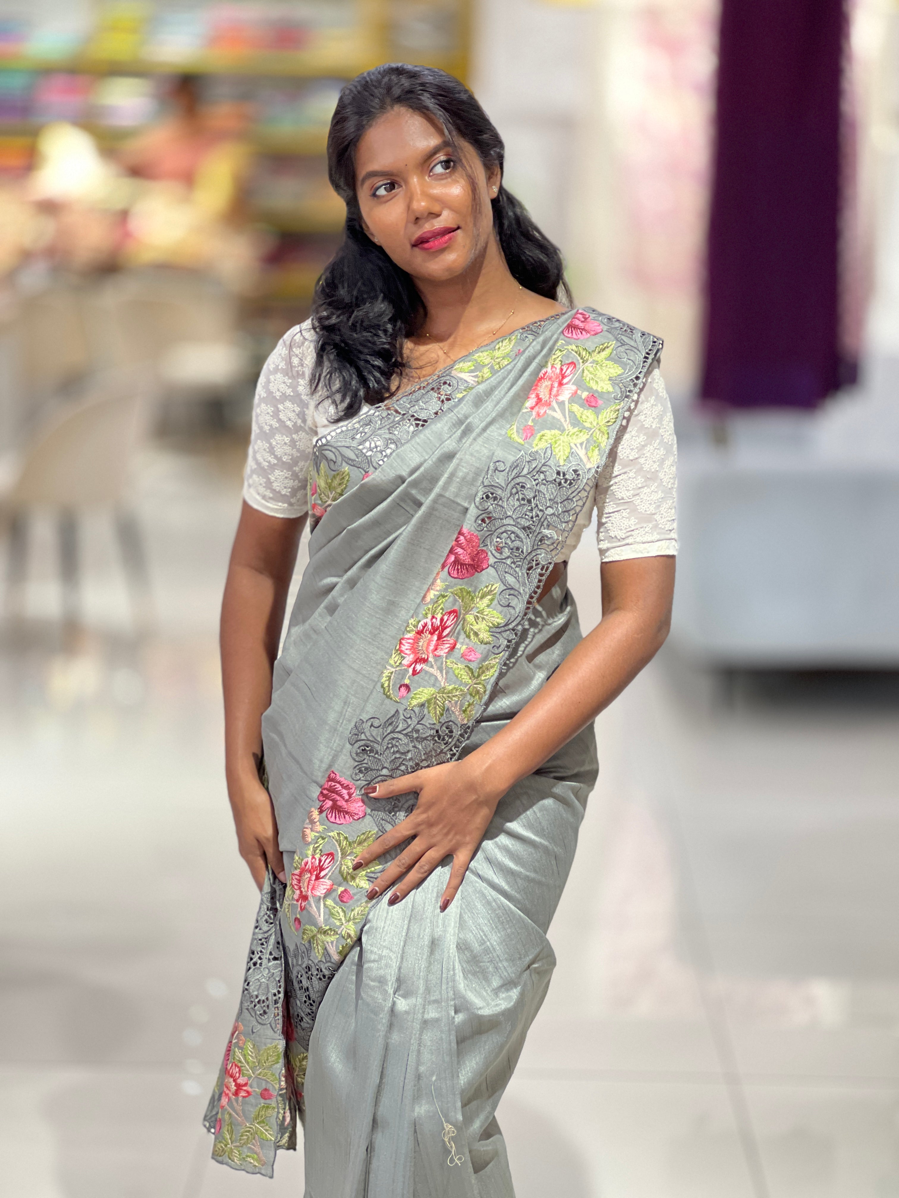 Cut Work With Floral Embroidered Semi Tussar Saree | SUN437