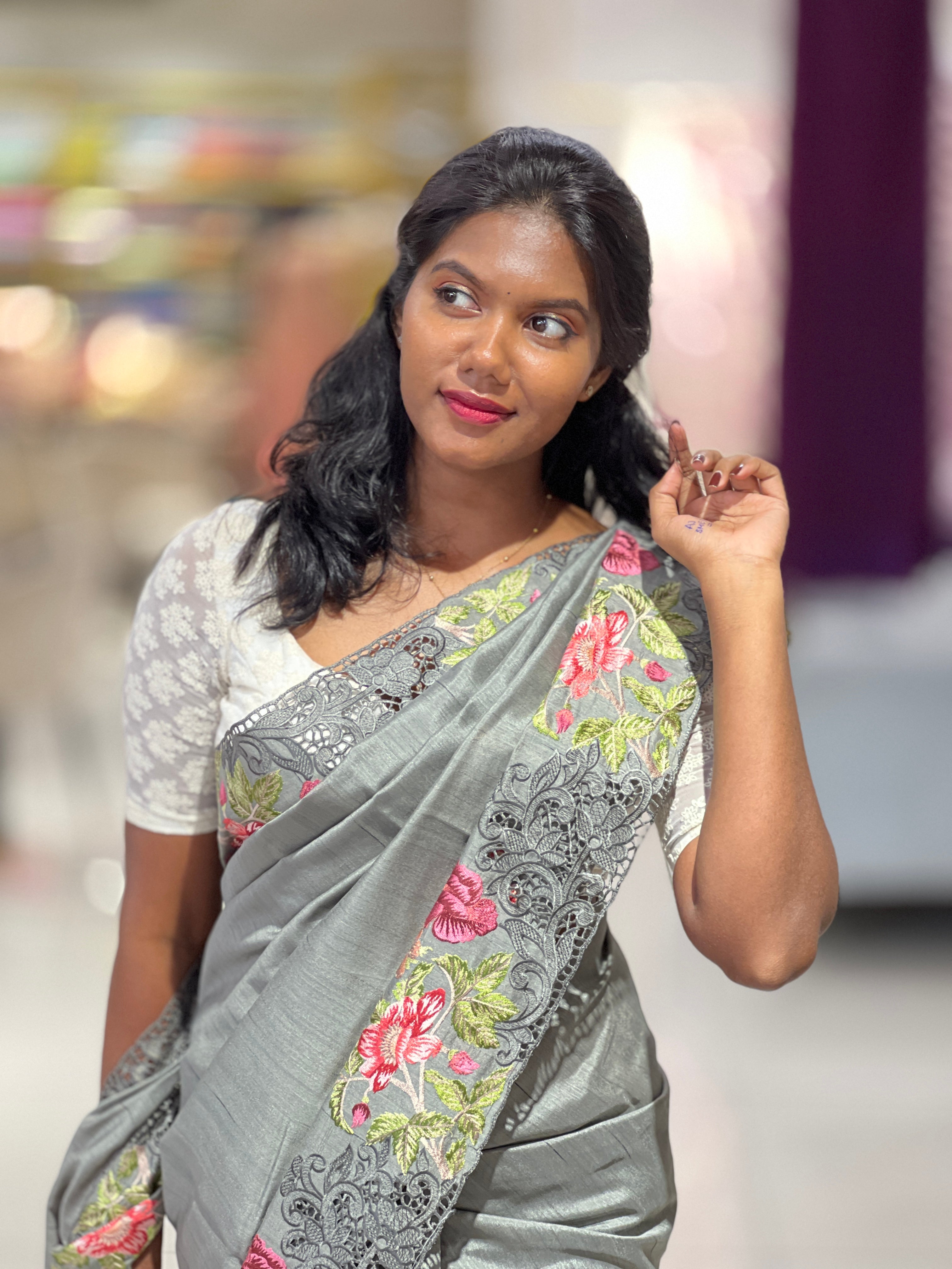 • Cut Work With Floral Embroidered Semi Tussar Saree | SUN437