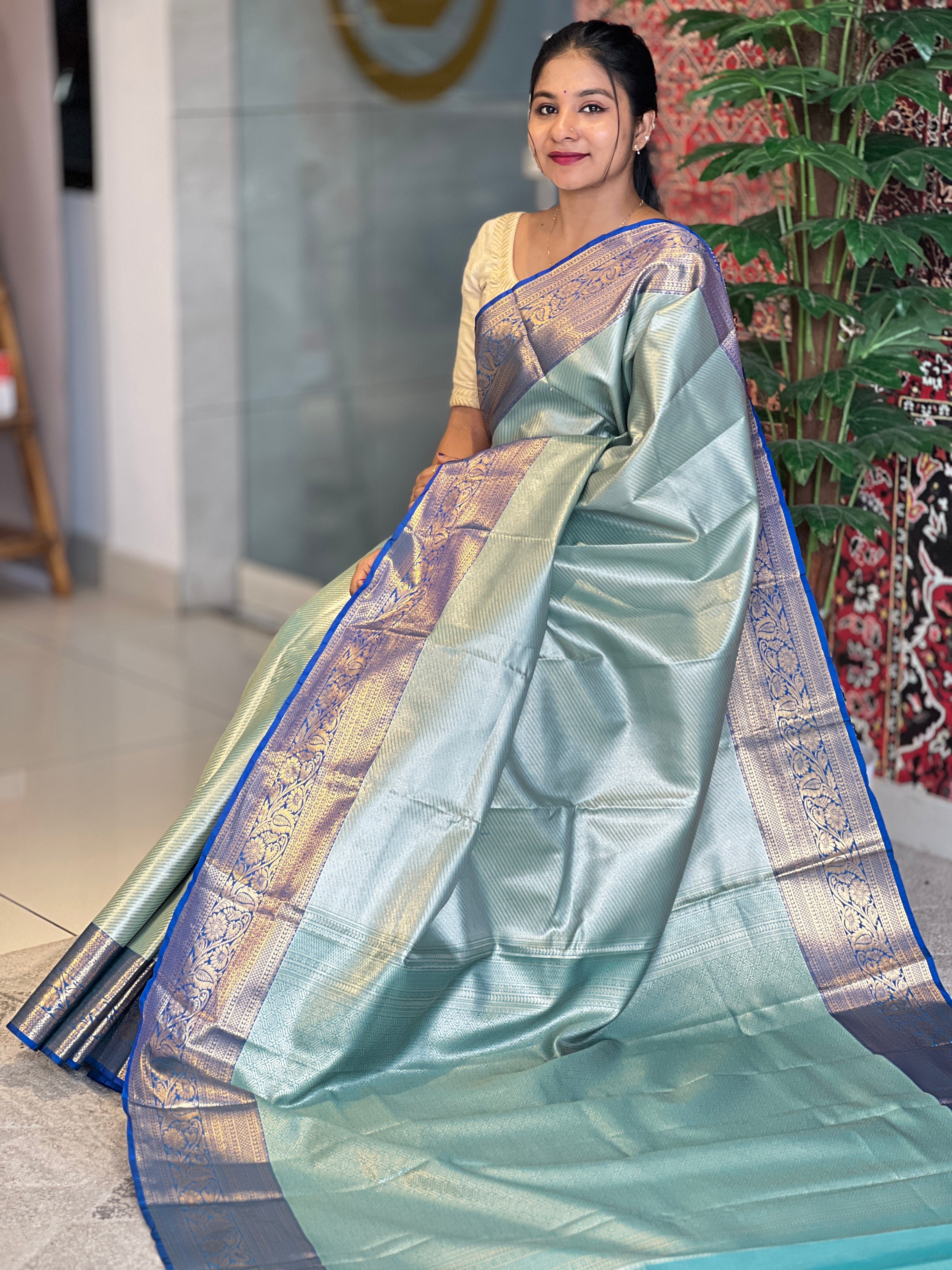 - Style: Contrast Traditional Floral Patterned Borders, Diagonal Patterned Body, Geometric Patterned Pallu, Tissue Weaved