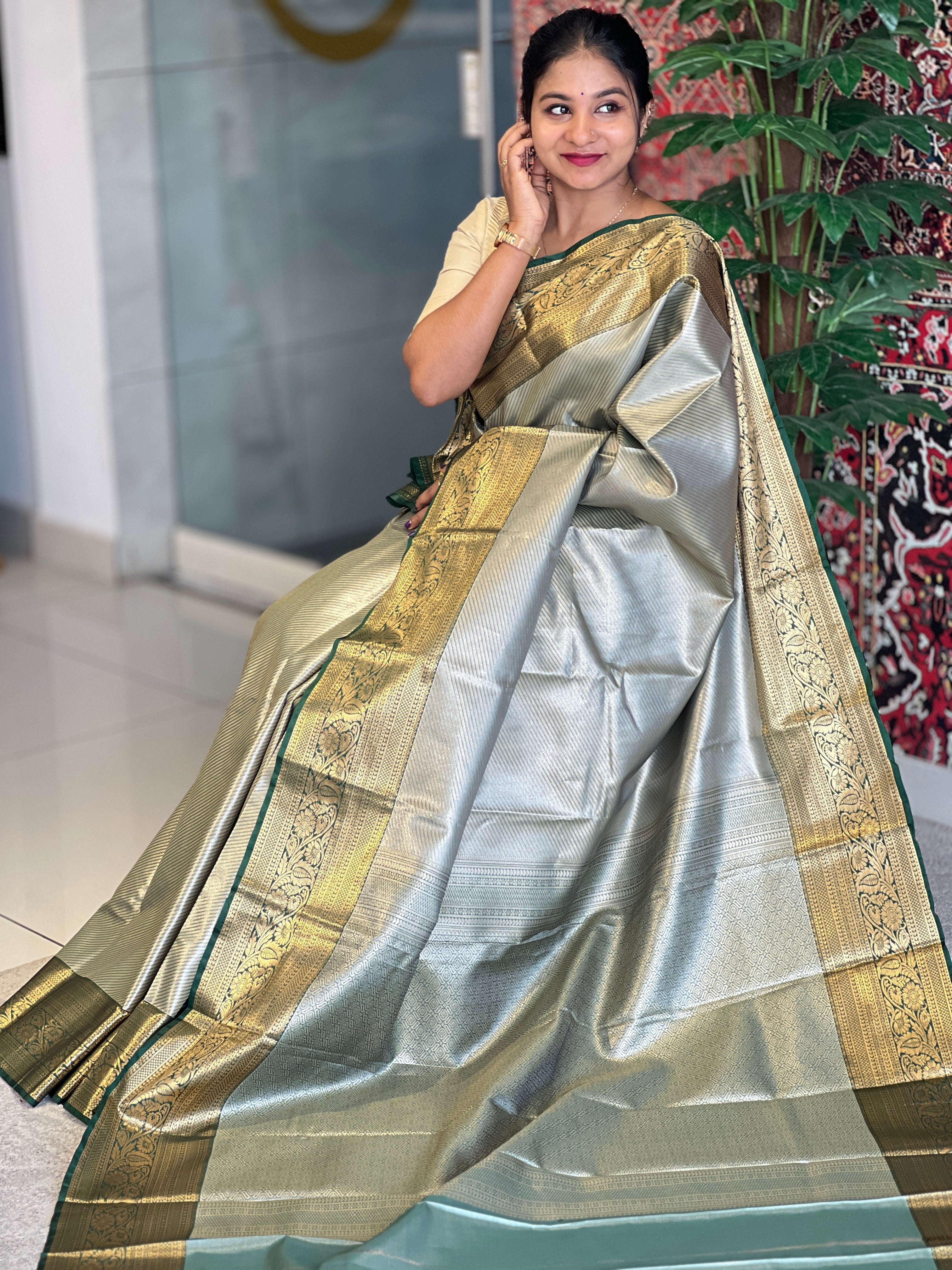 • Style: Contrast Traditional Floral Patterned Borders, Diagonal Patterned Body, Geometric Patterned Pallu, Tissue Weaved