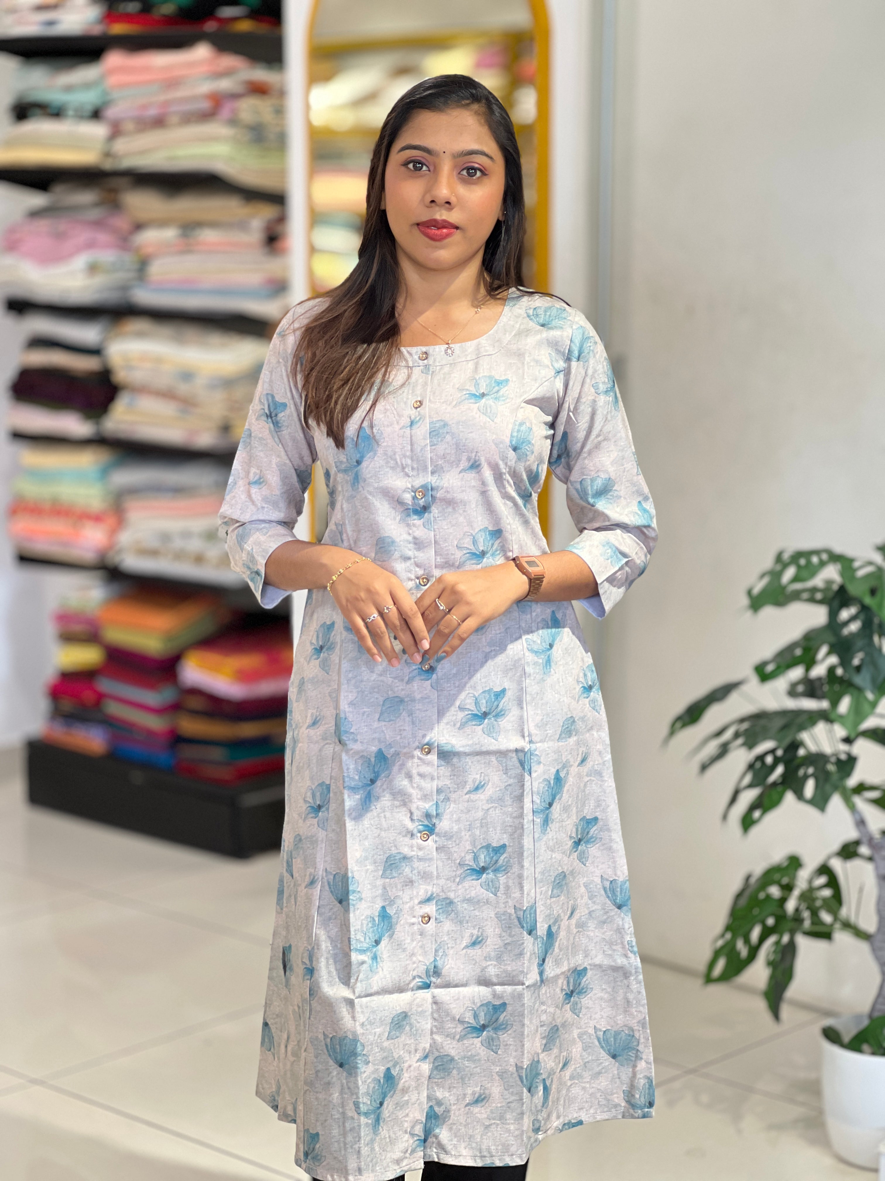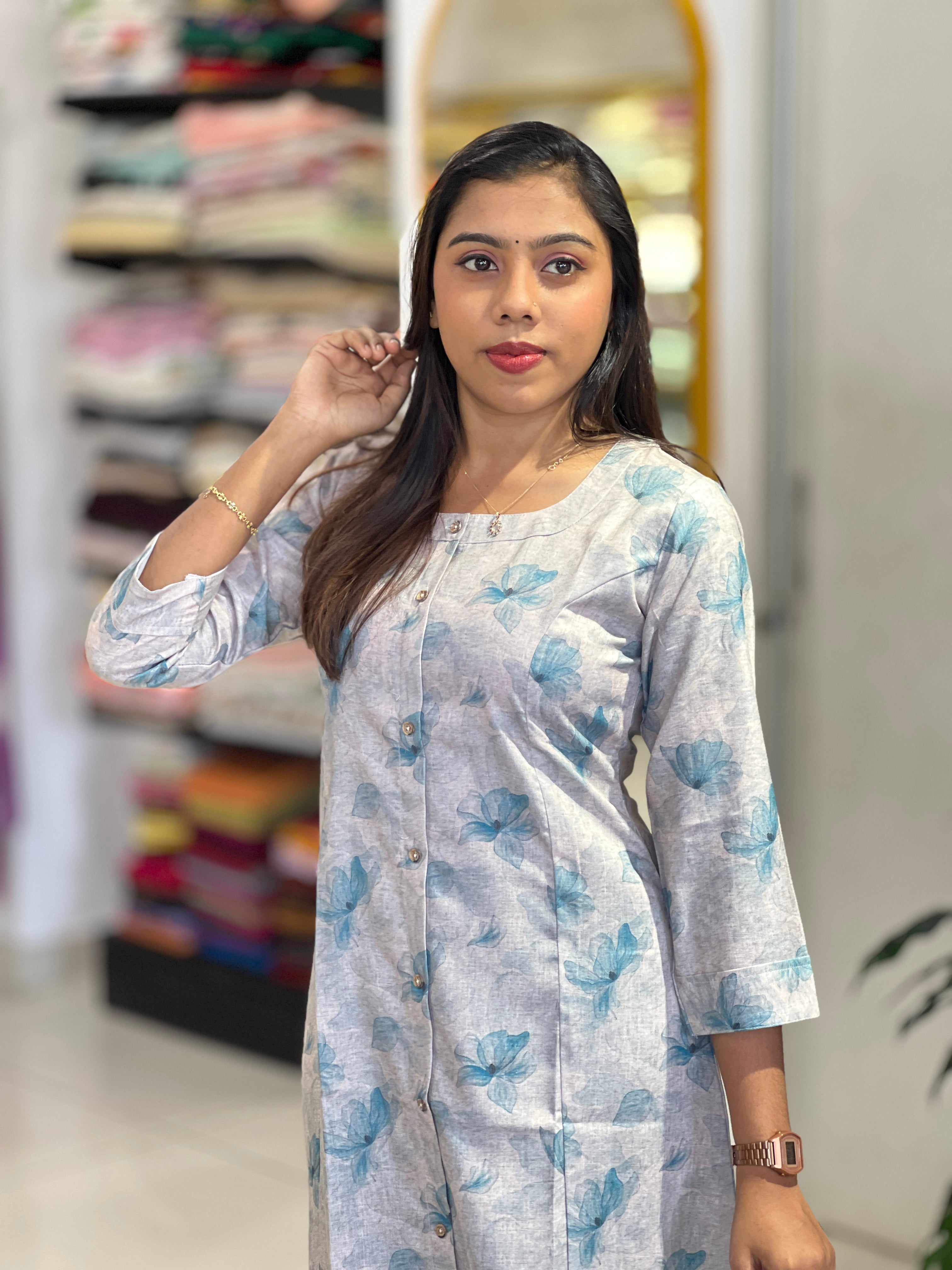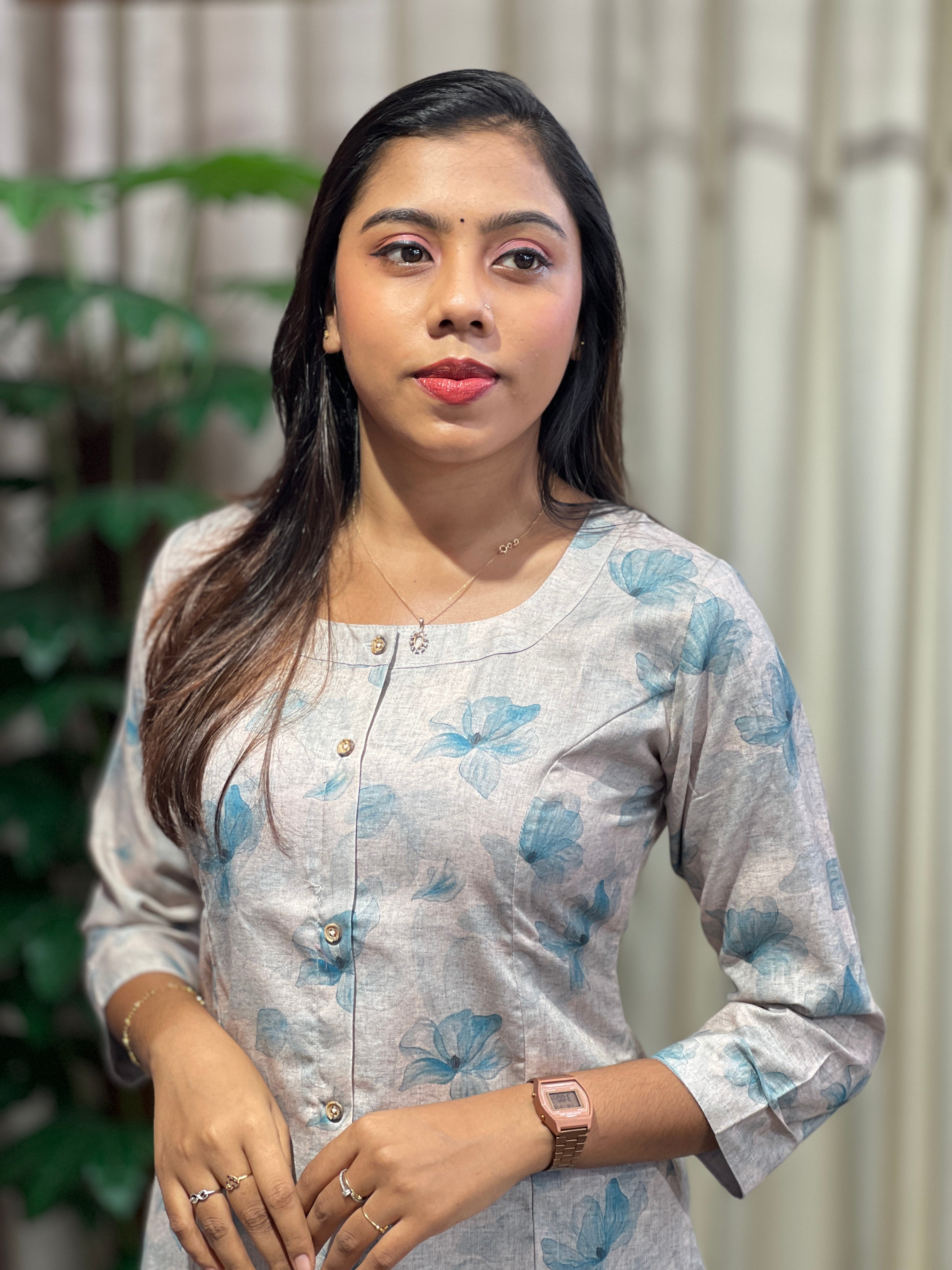 - Style: Digital Floral Printed, Negative Print Detailing, Show Button Detailing, Panel Cut, Pockets