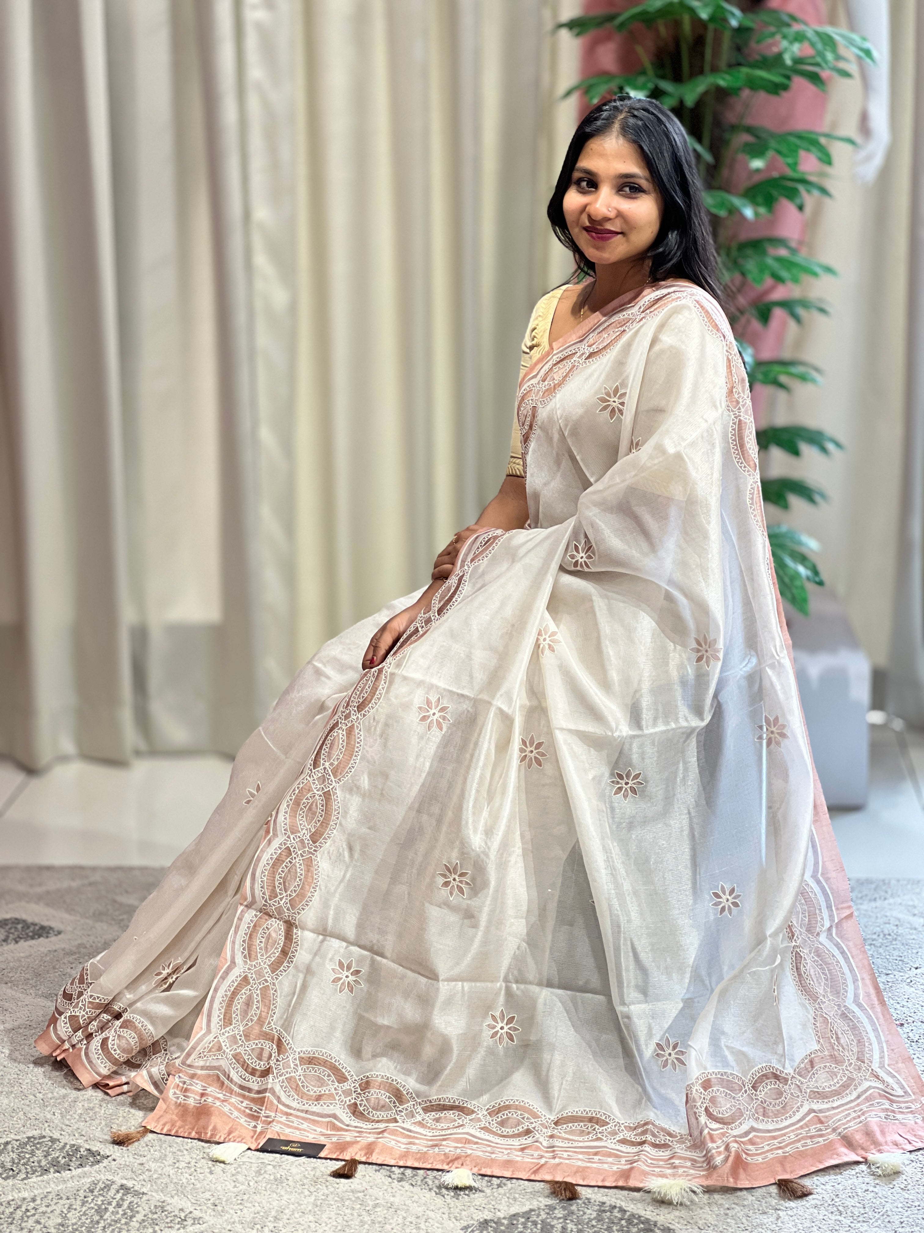 - Style: Digital Print With Machine Embroidery Highlight, Scattered Floral Motifs, Tassels Attached