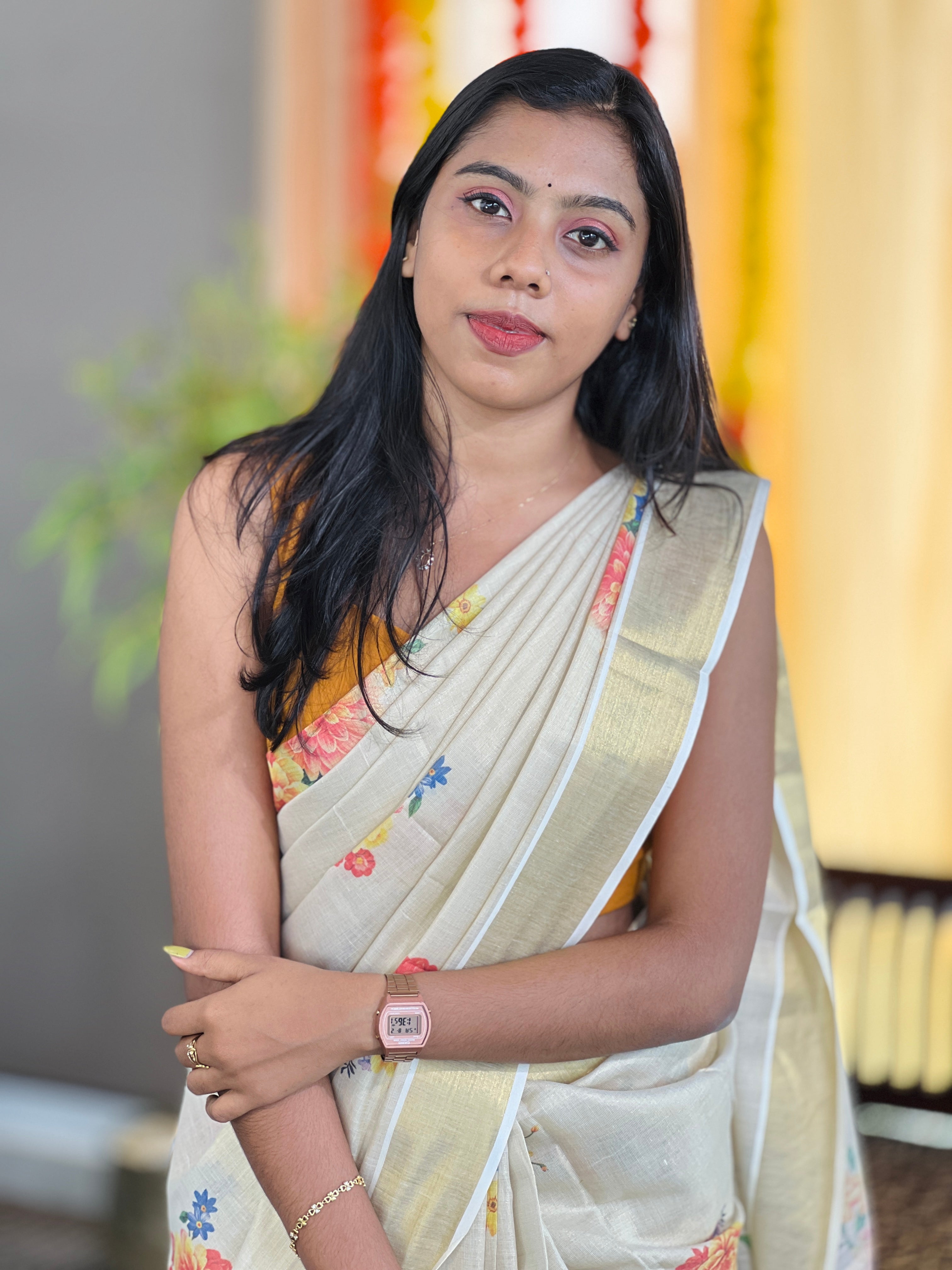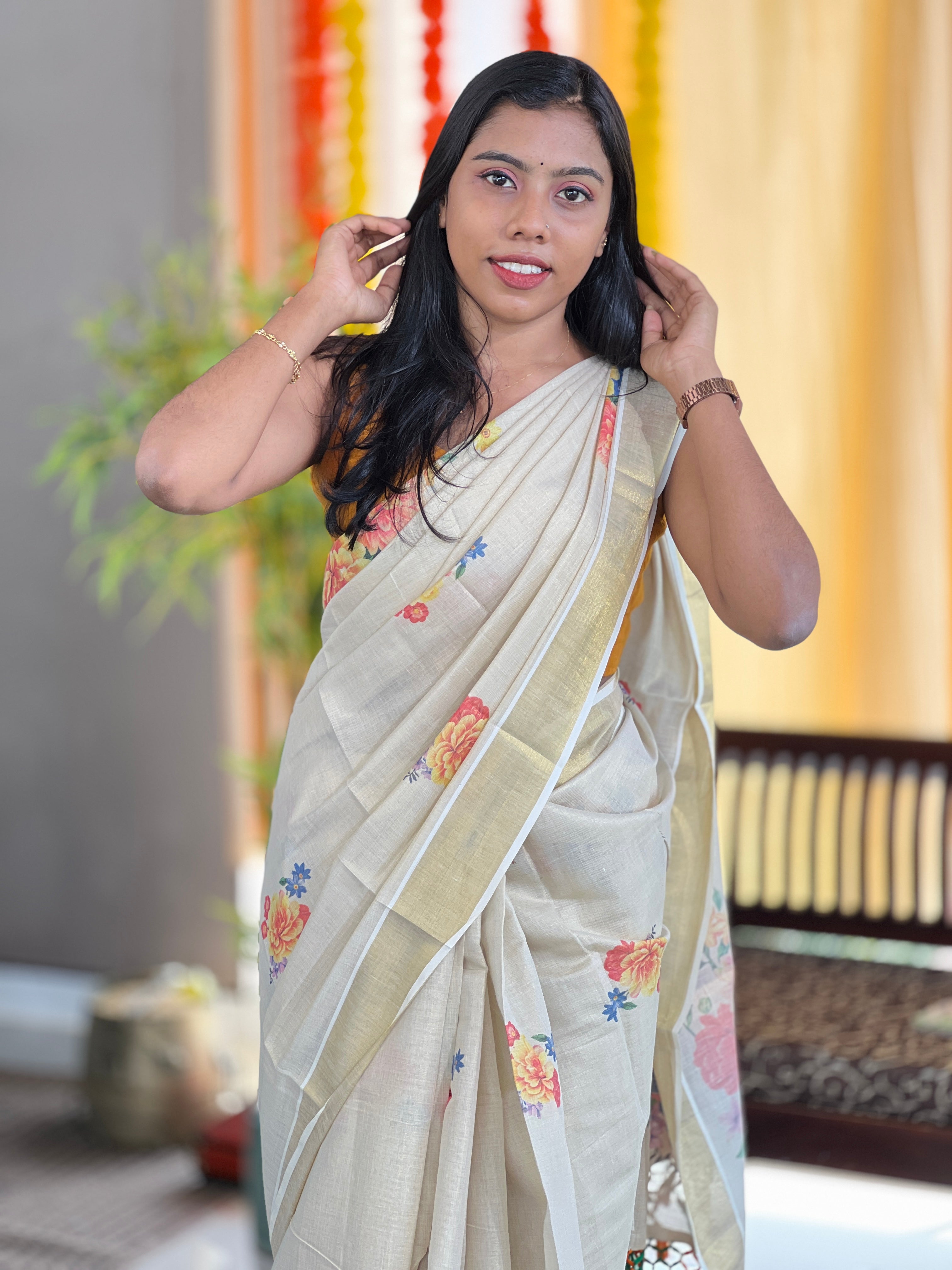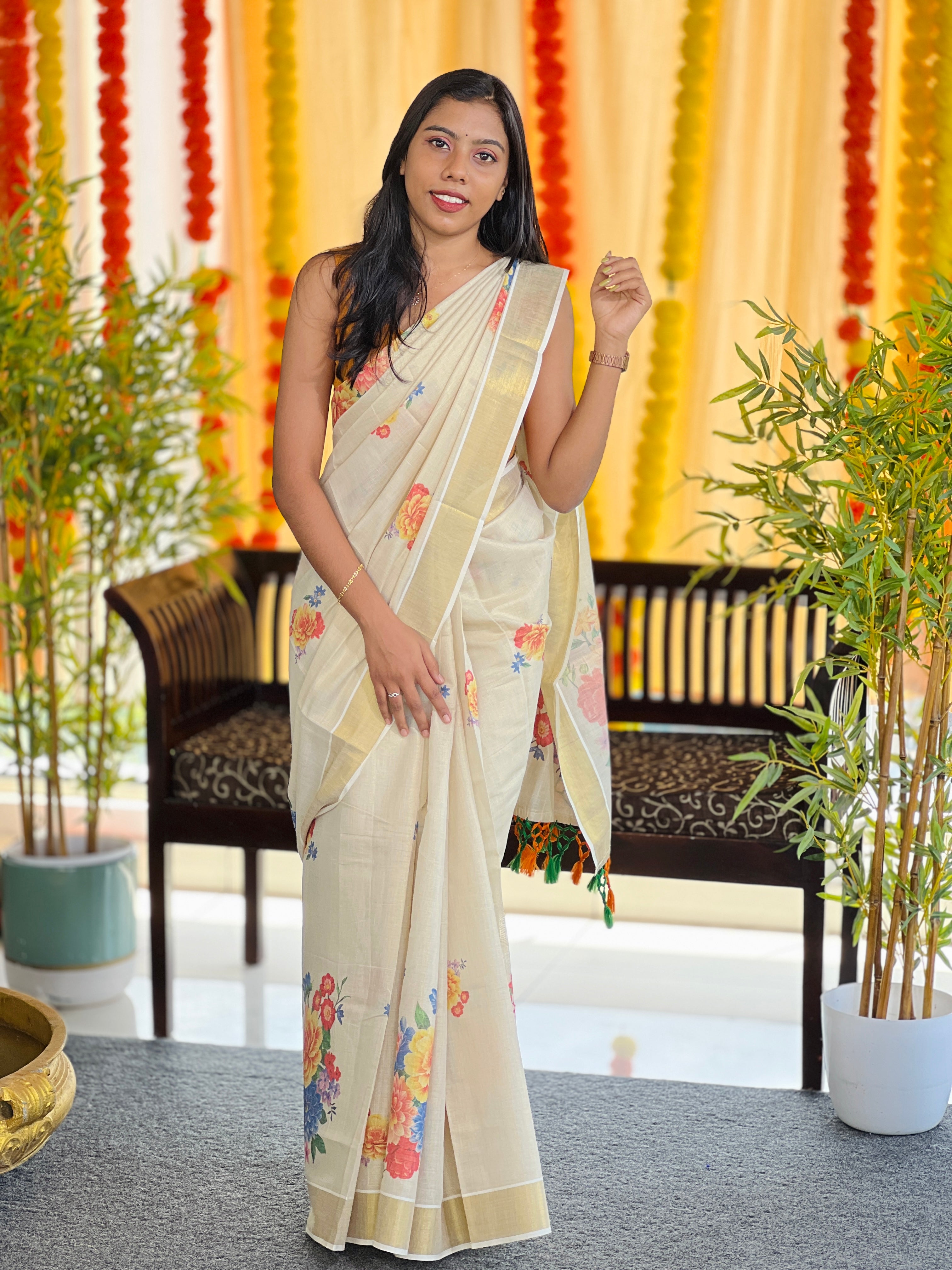 - Style: Digital Printed, Floral Print Detailing, Kasavu Detailed Borders & Pallu, Multi Knotted Tassels