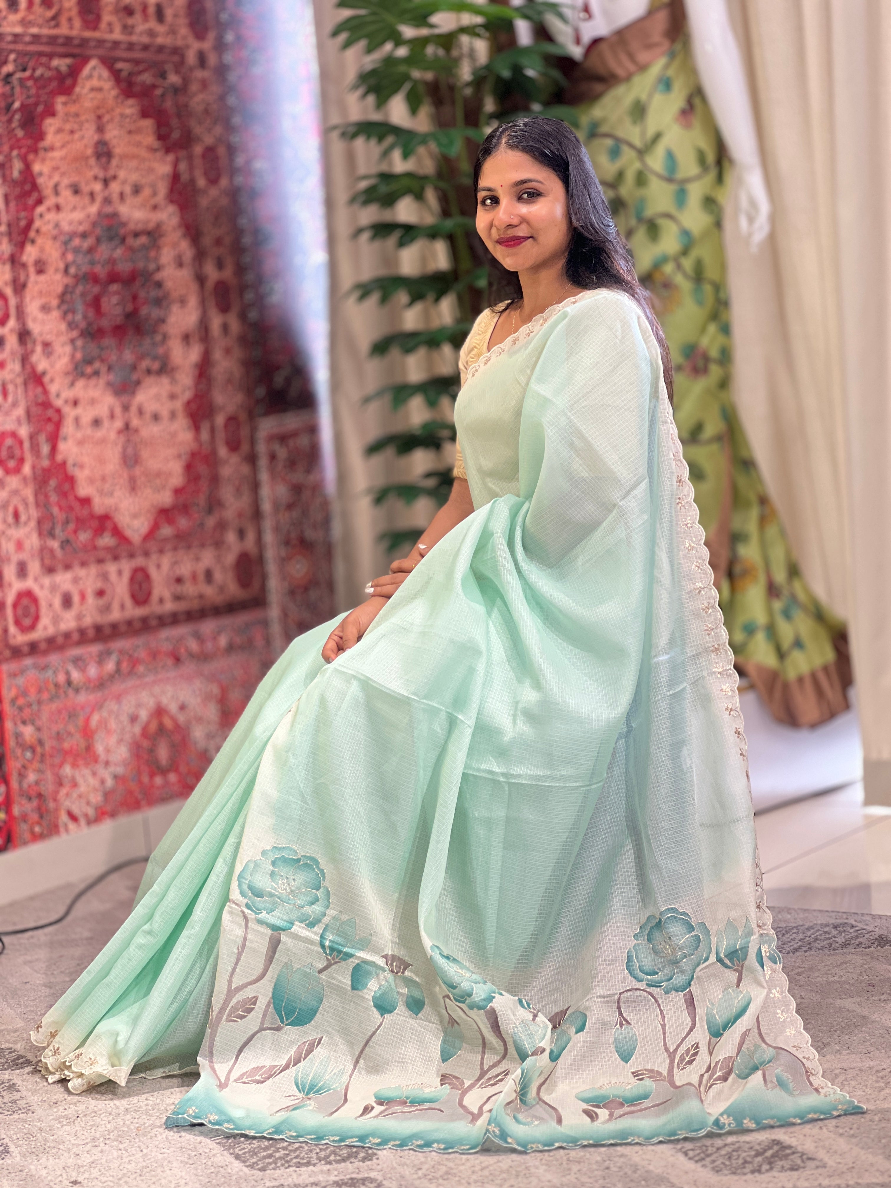 - Style: Floral Digital Printed Pallu With Pitta Work Highlight, Scallop Edges With Pitta Work Highlight,Shaded effect