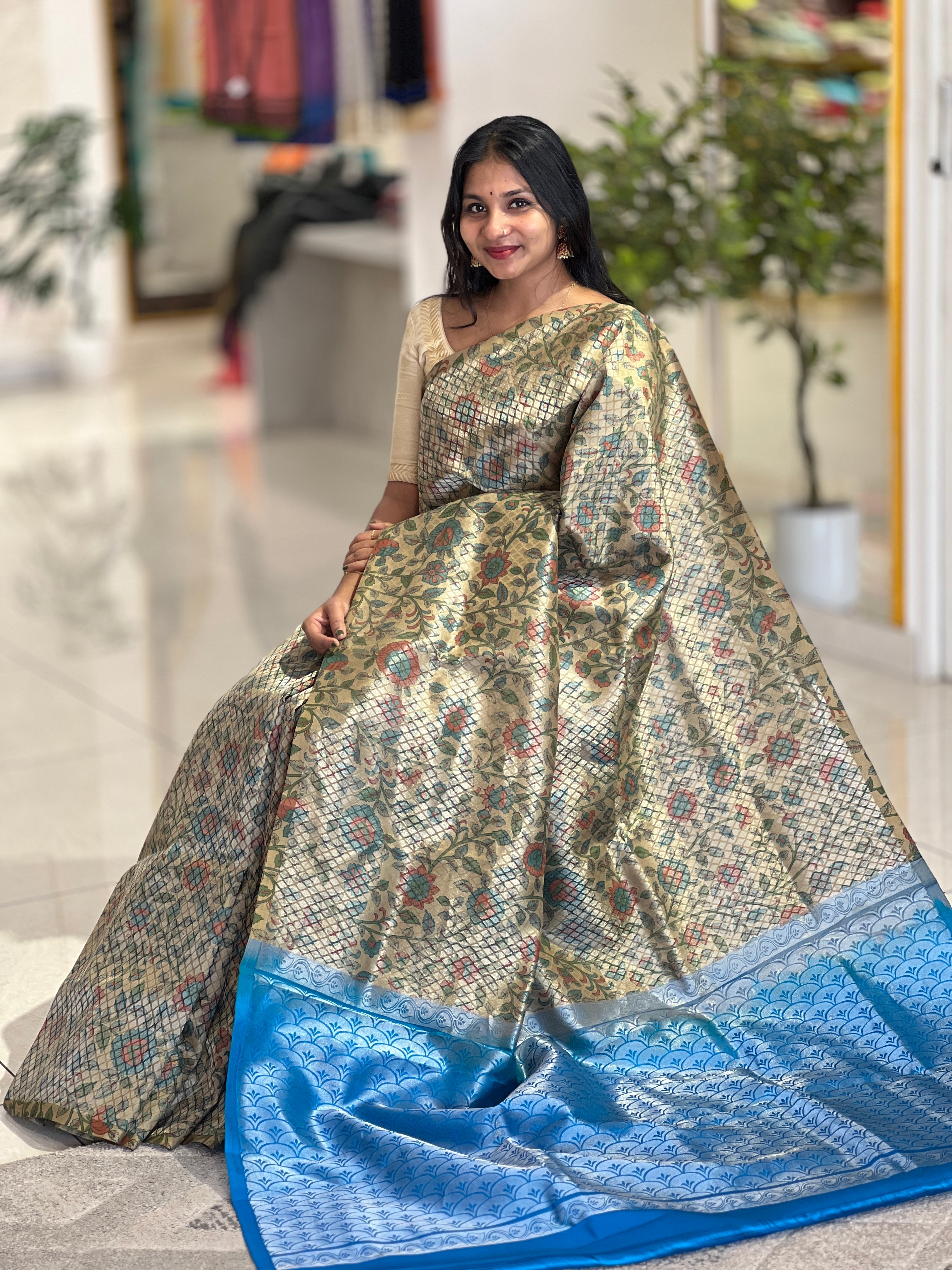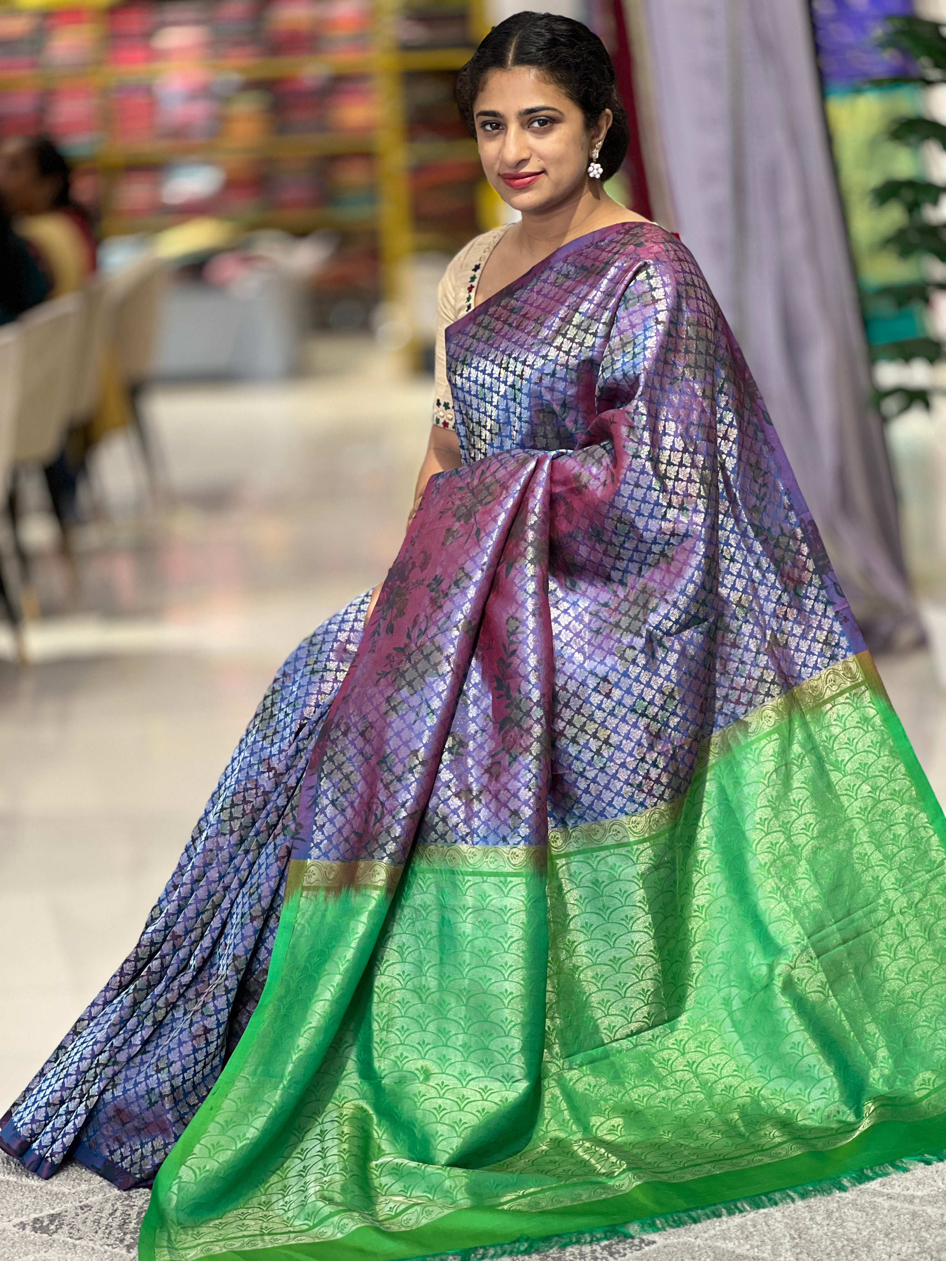 - Style: Fully Brocade Pattern, Silver Zari Woven, Digital Printed, Contrast Pallu