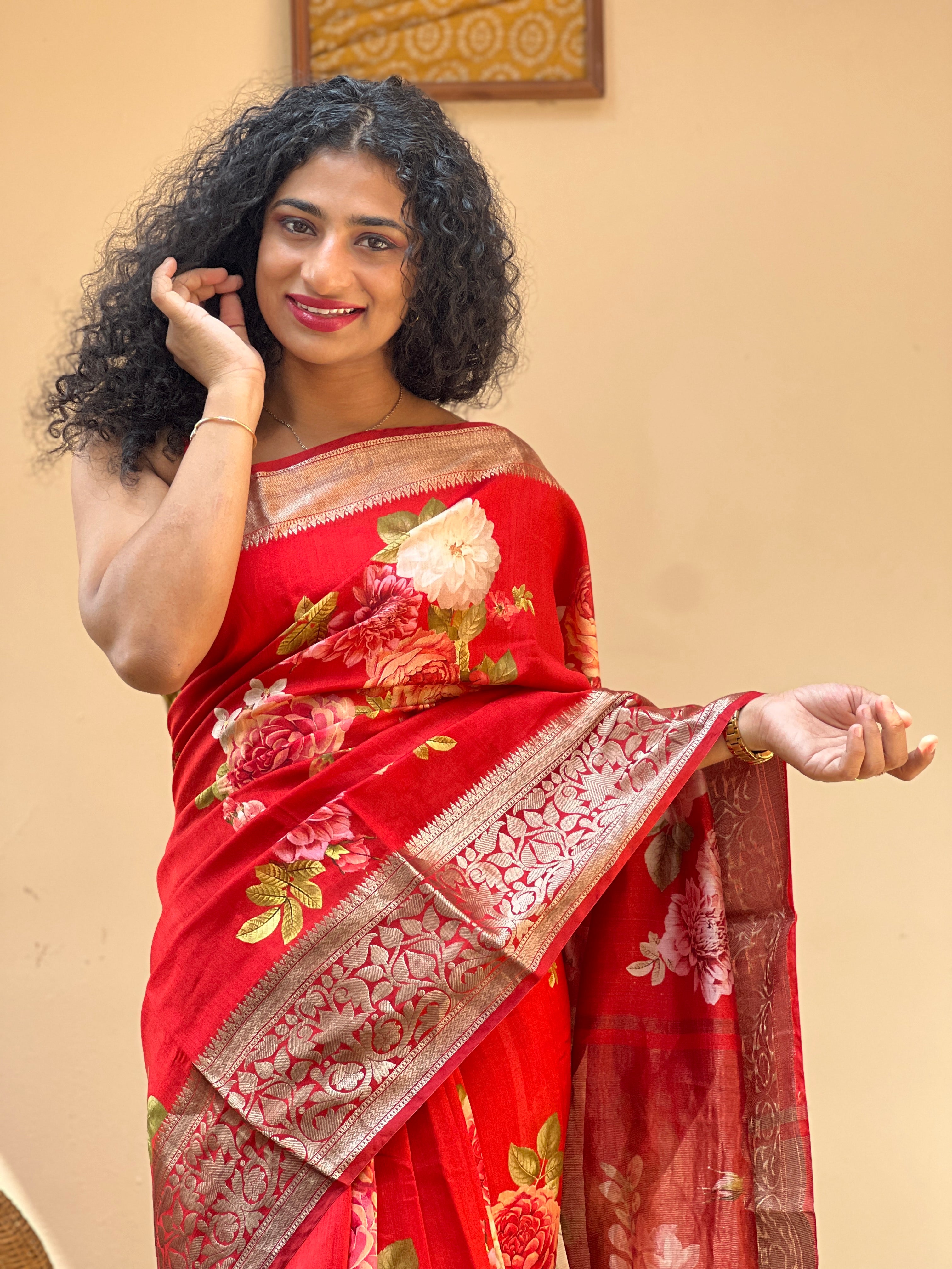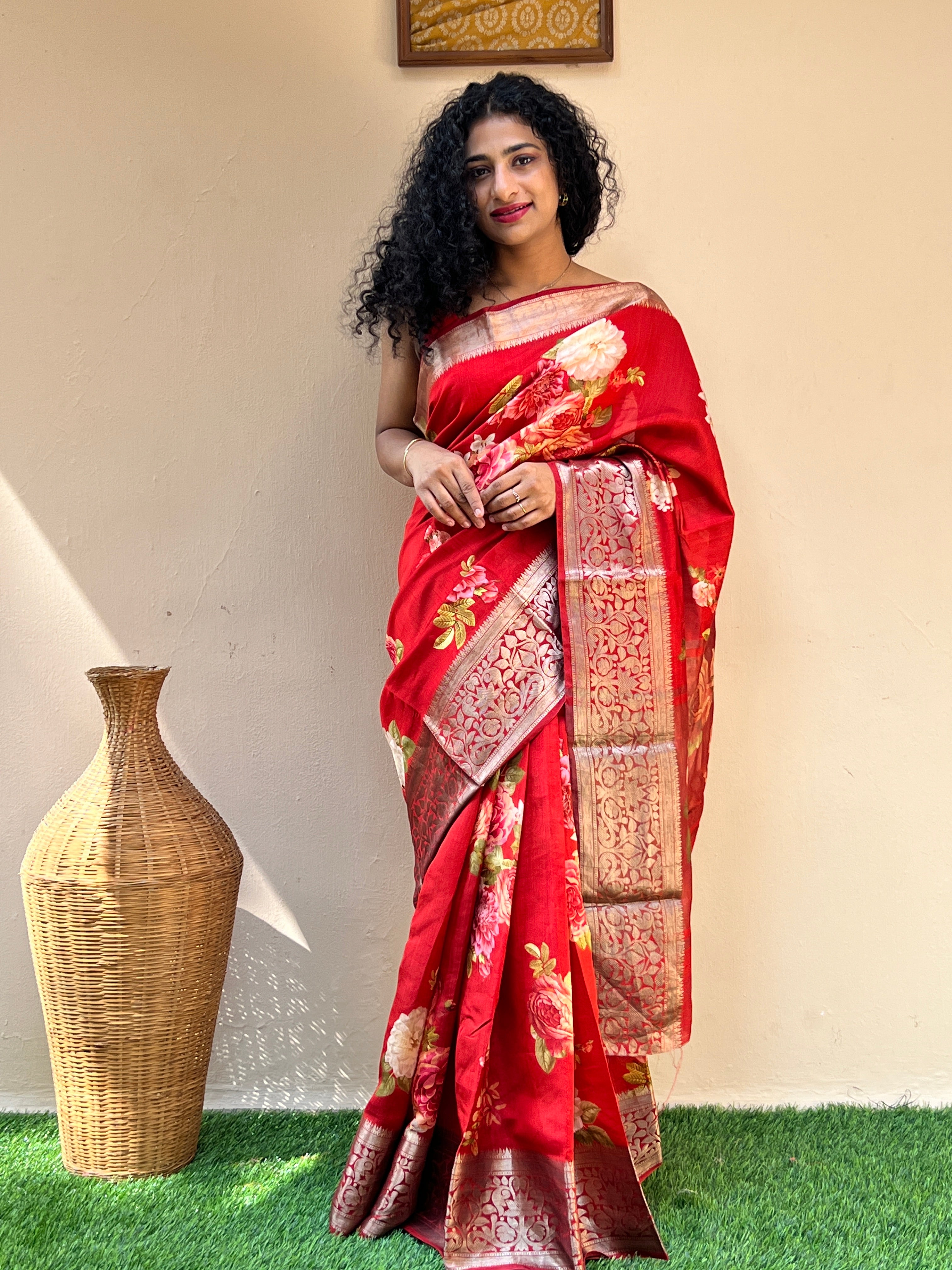 Chiniya silk saree with traditional pattern floral jal design banarasi zari upper & lower border design, floral pattern digital print design done throughout the saree. The saree is paired with negative printed blouse piece.