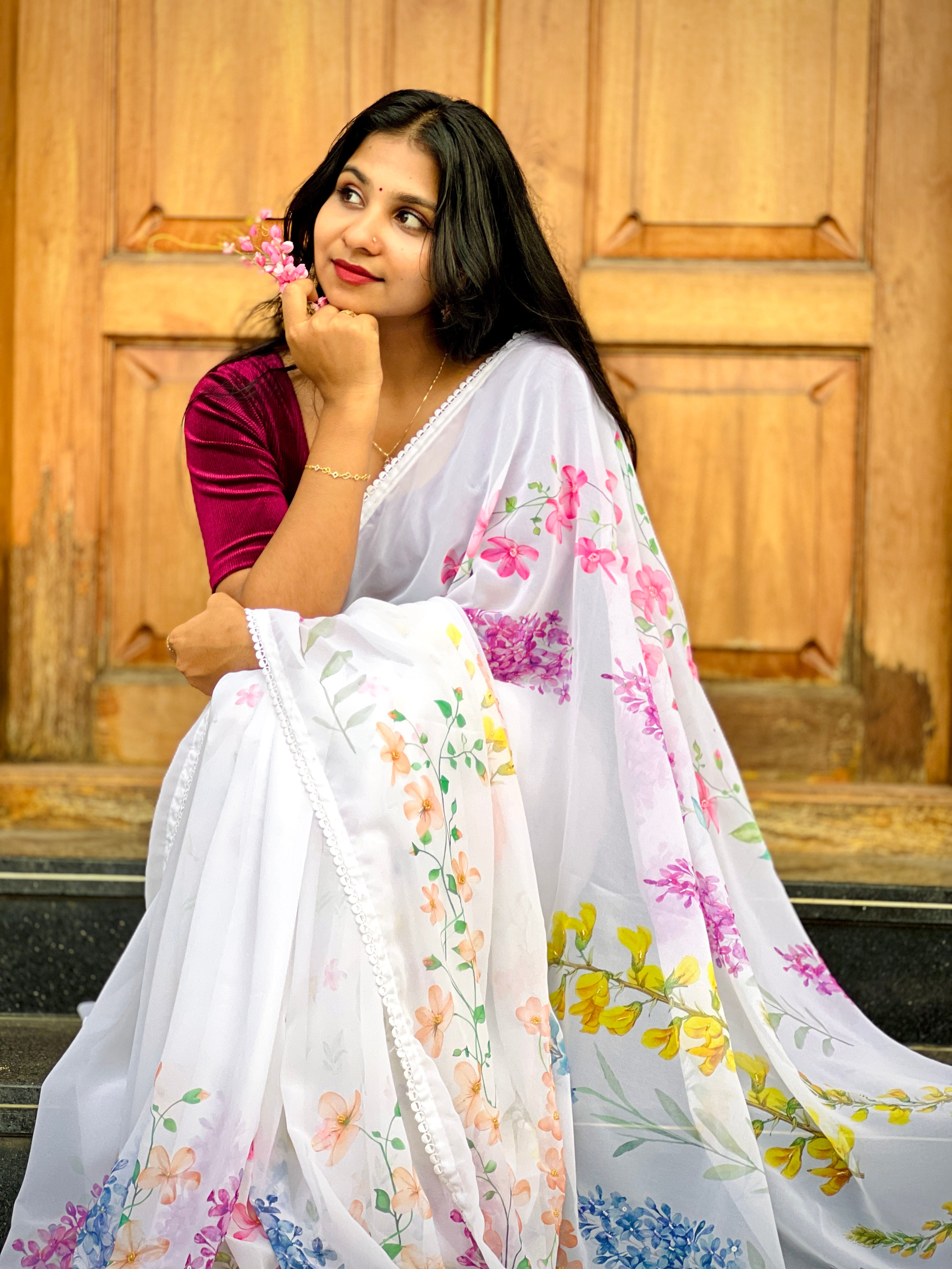 • Style: Floral Digital Print, Hand Worked Highlighted, Floral Printed Pallu, Lace Finish Edges