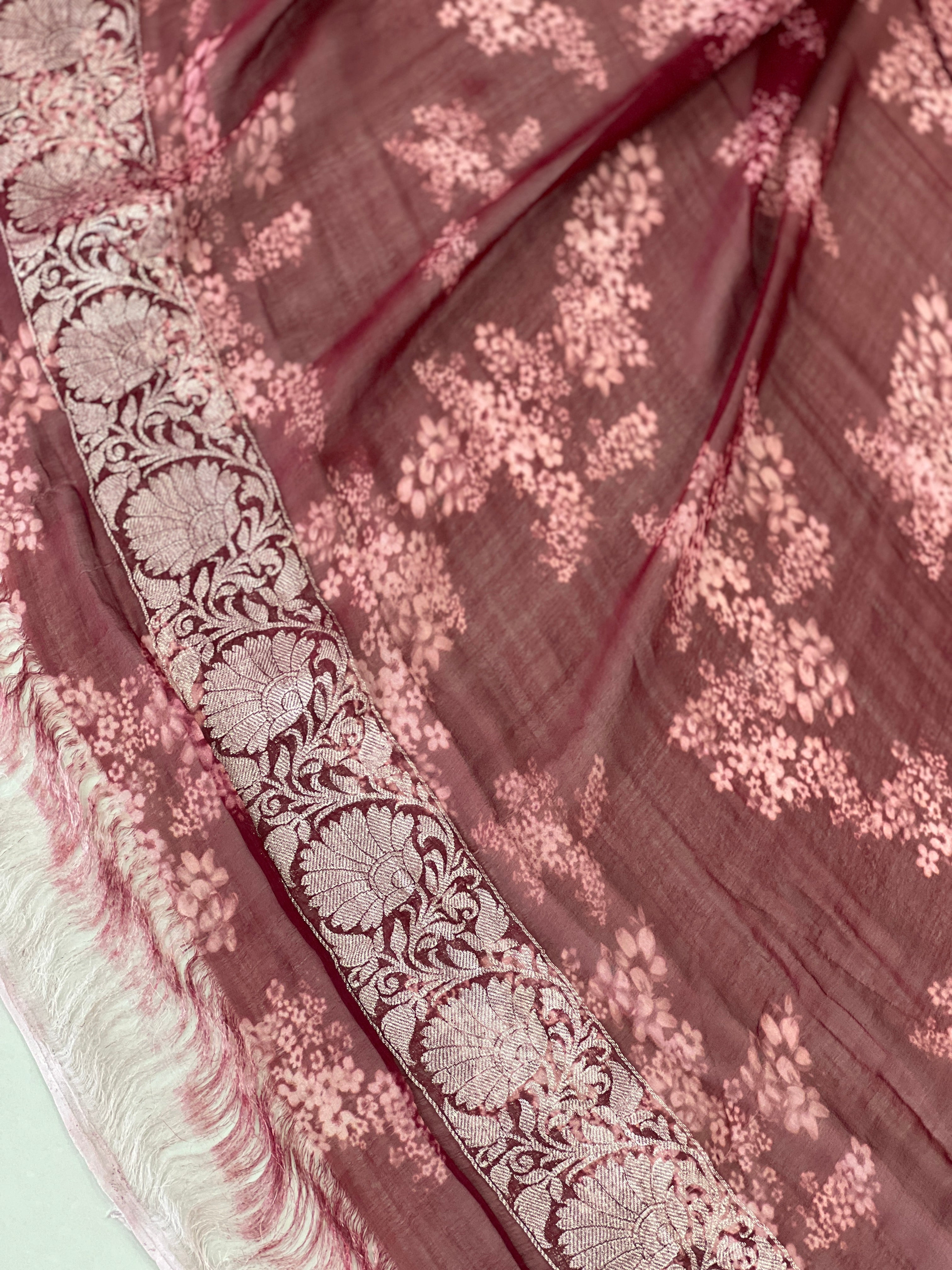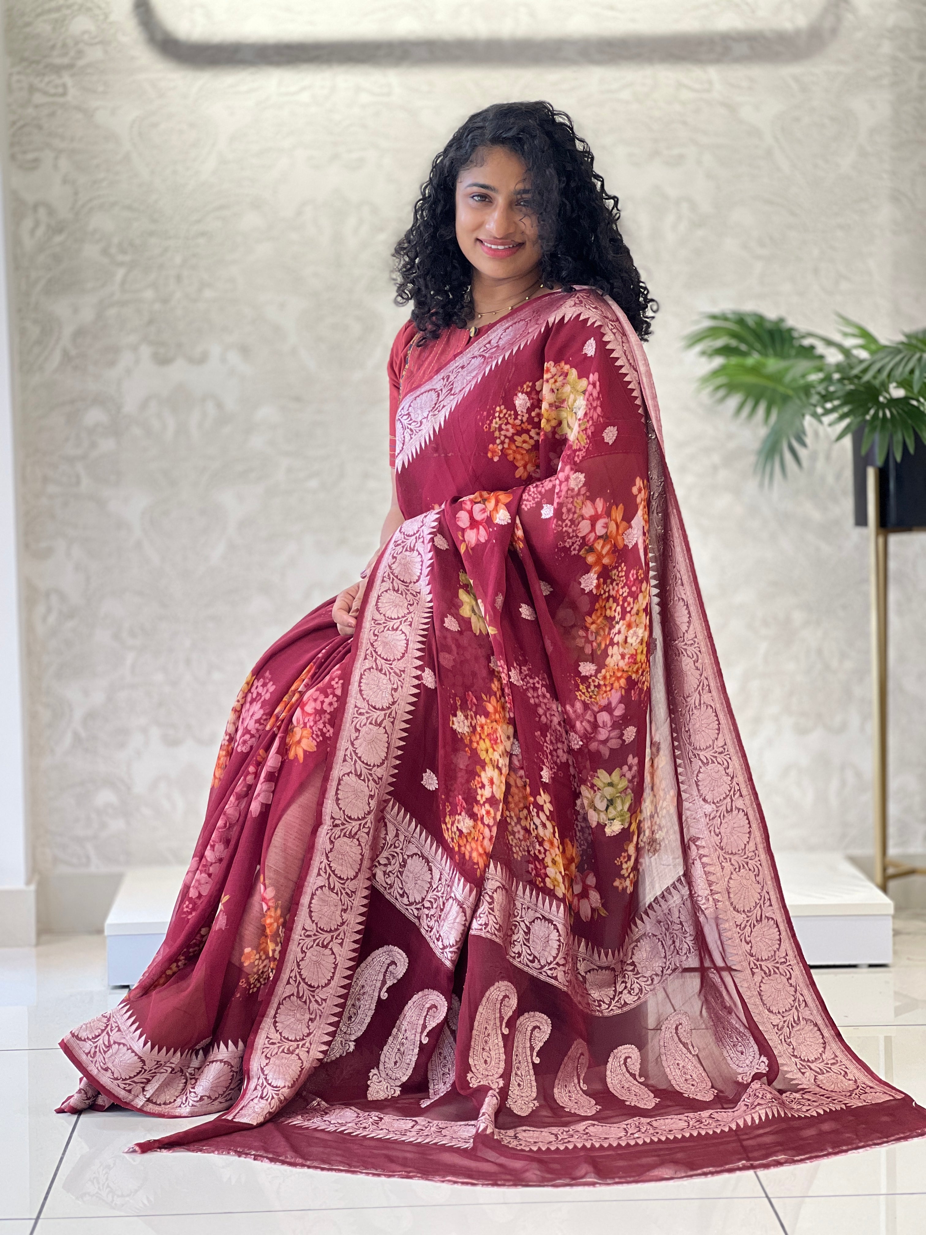 - Style: Floral Digital Print, Banarasi Weaved Silver Zari Borders And Pallu, Zari Motif, Temple Border Detailing