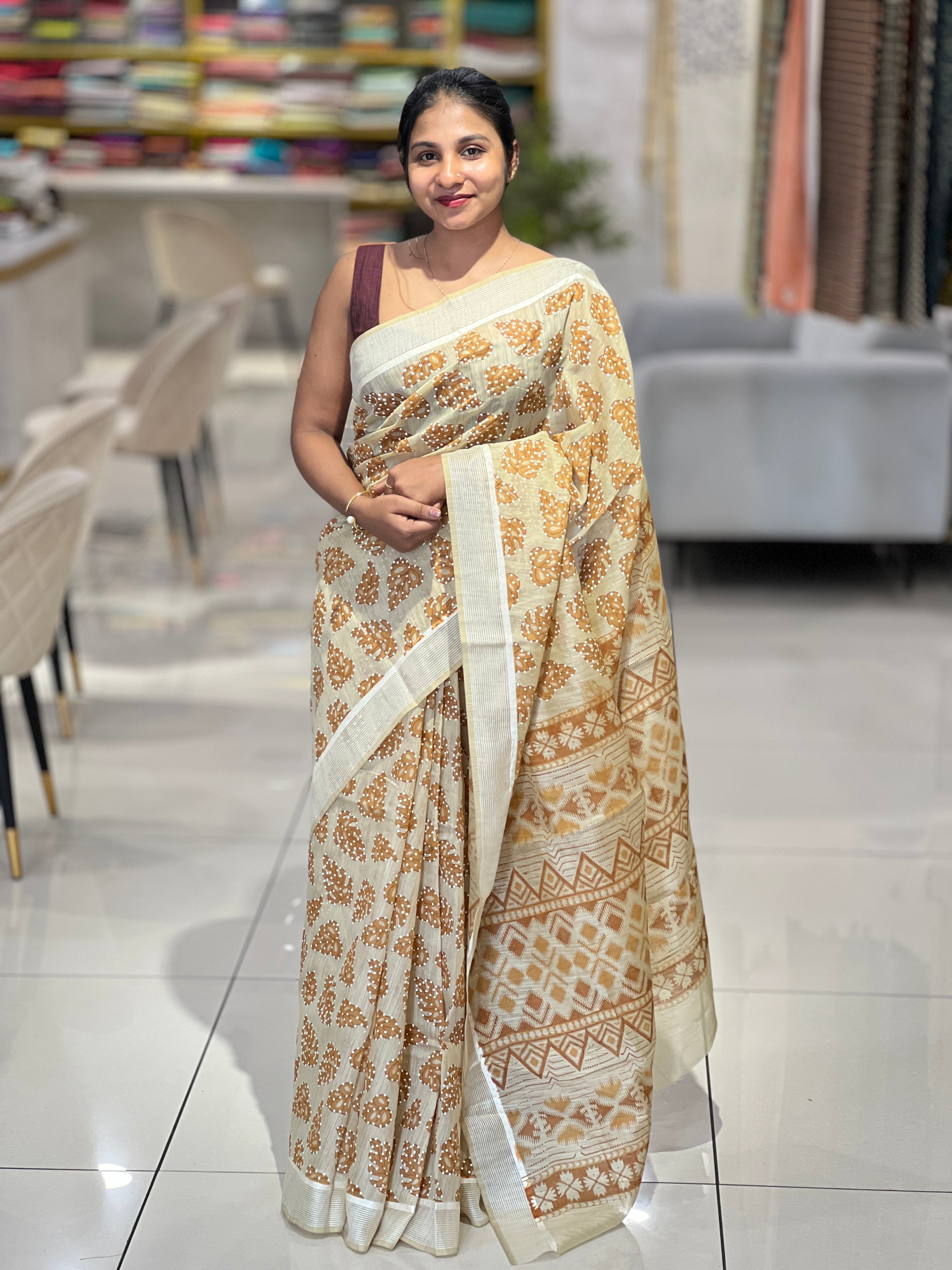 - Style: Digital Printed, Leaf Pattern, Thread Weaving On Border, Ikat Inspired Pallu Detailing