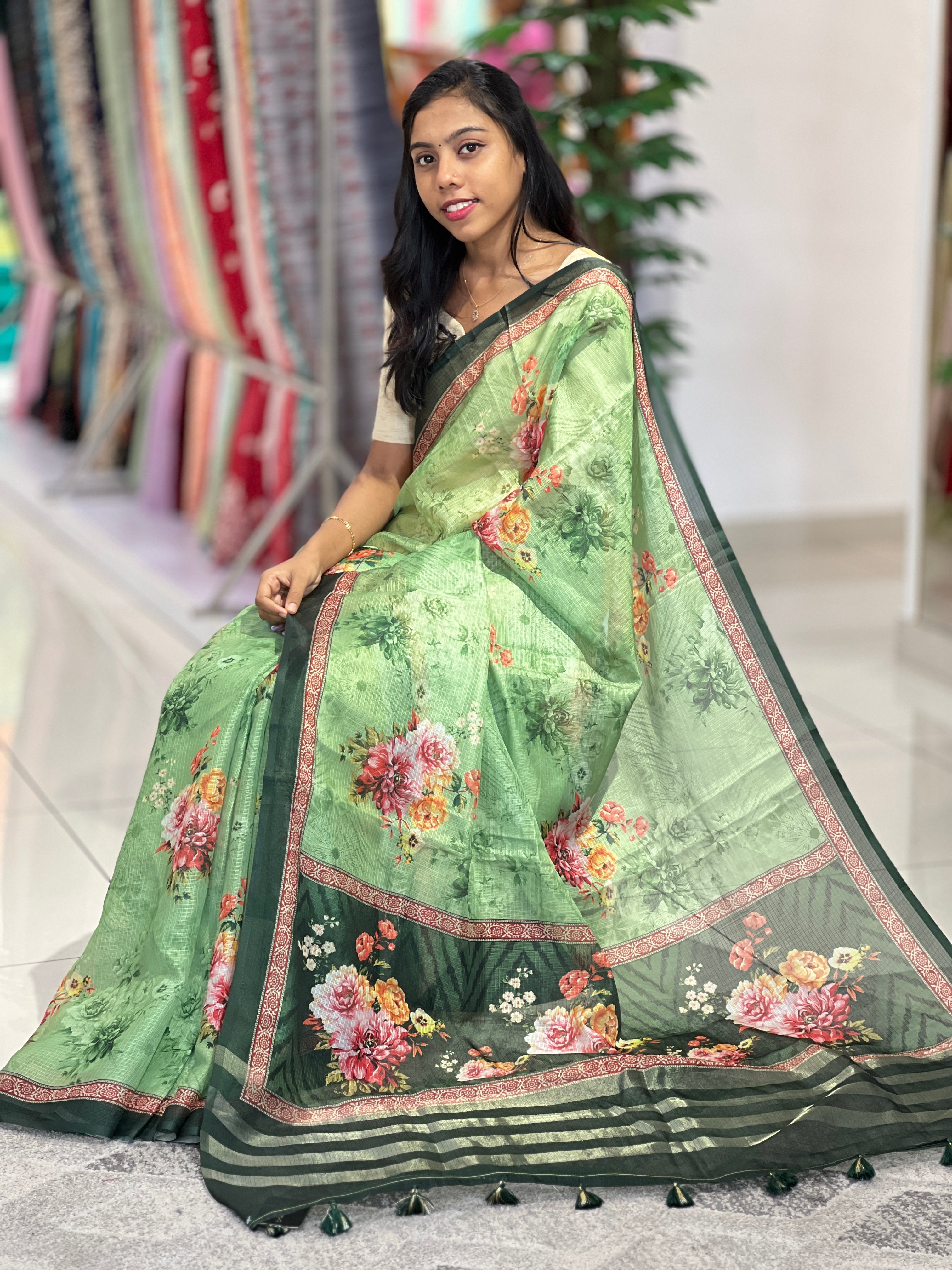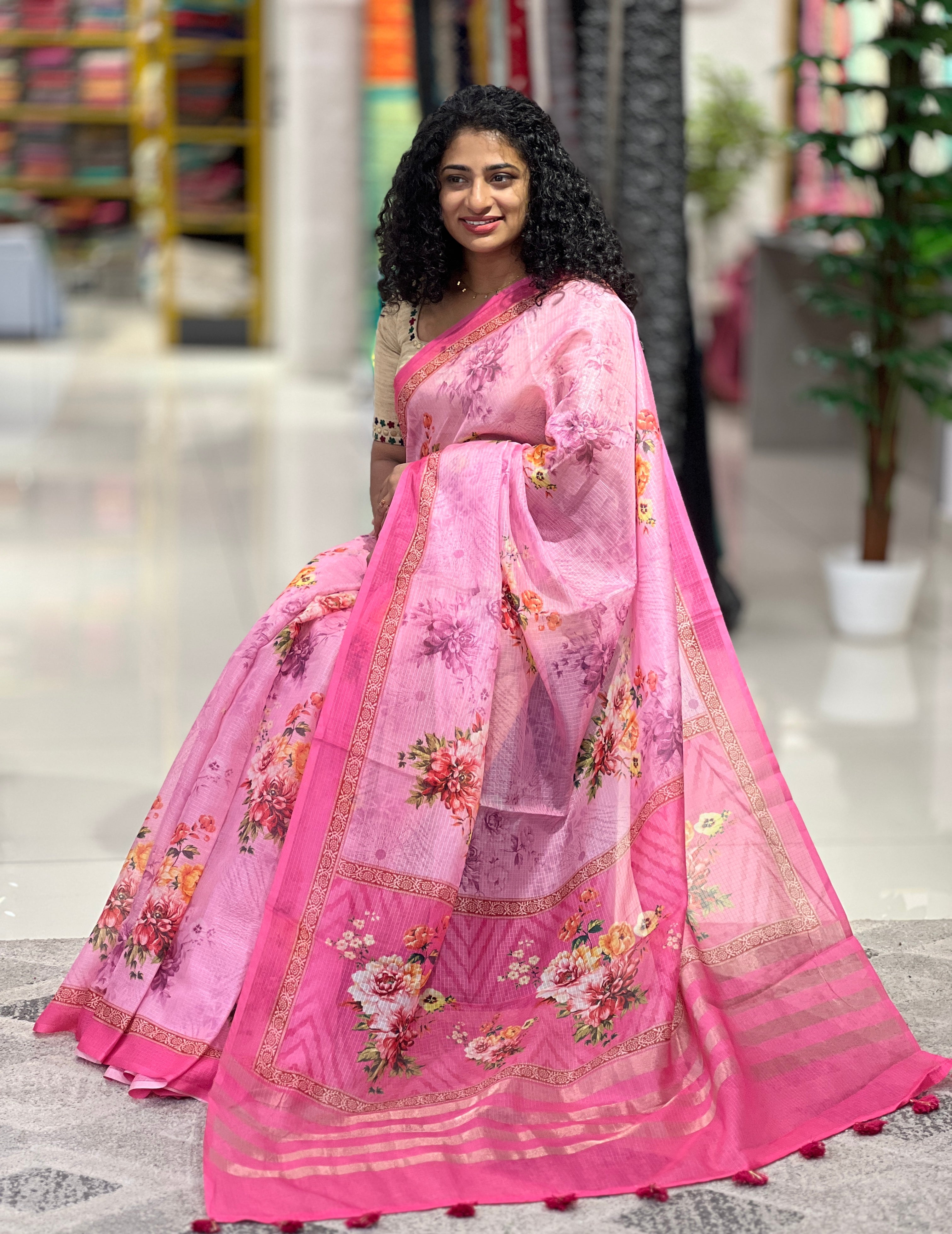 - Style: Digital Printed, Floral Pattern, Contrast Borders & Pallu, Zari Stripe Detailed Pallu, Tassels Attached