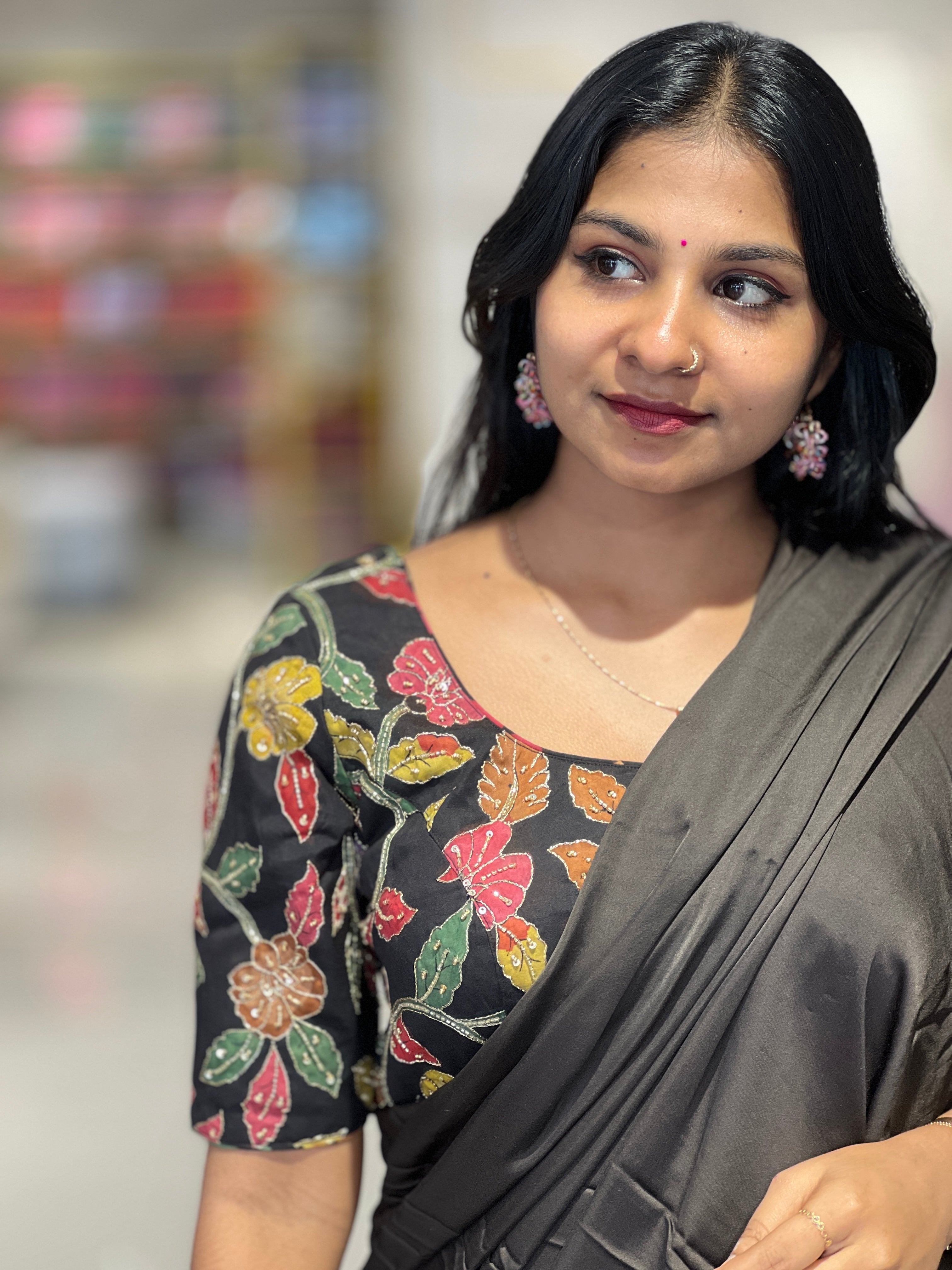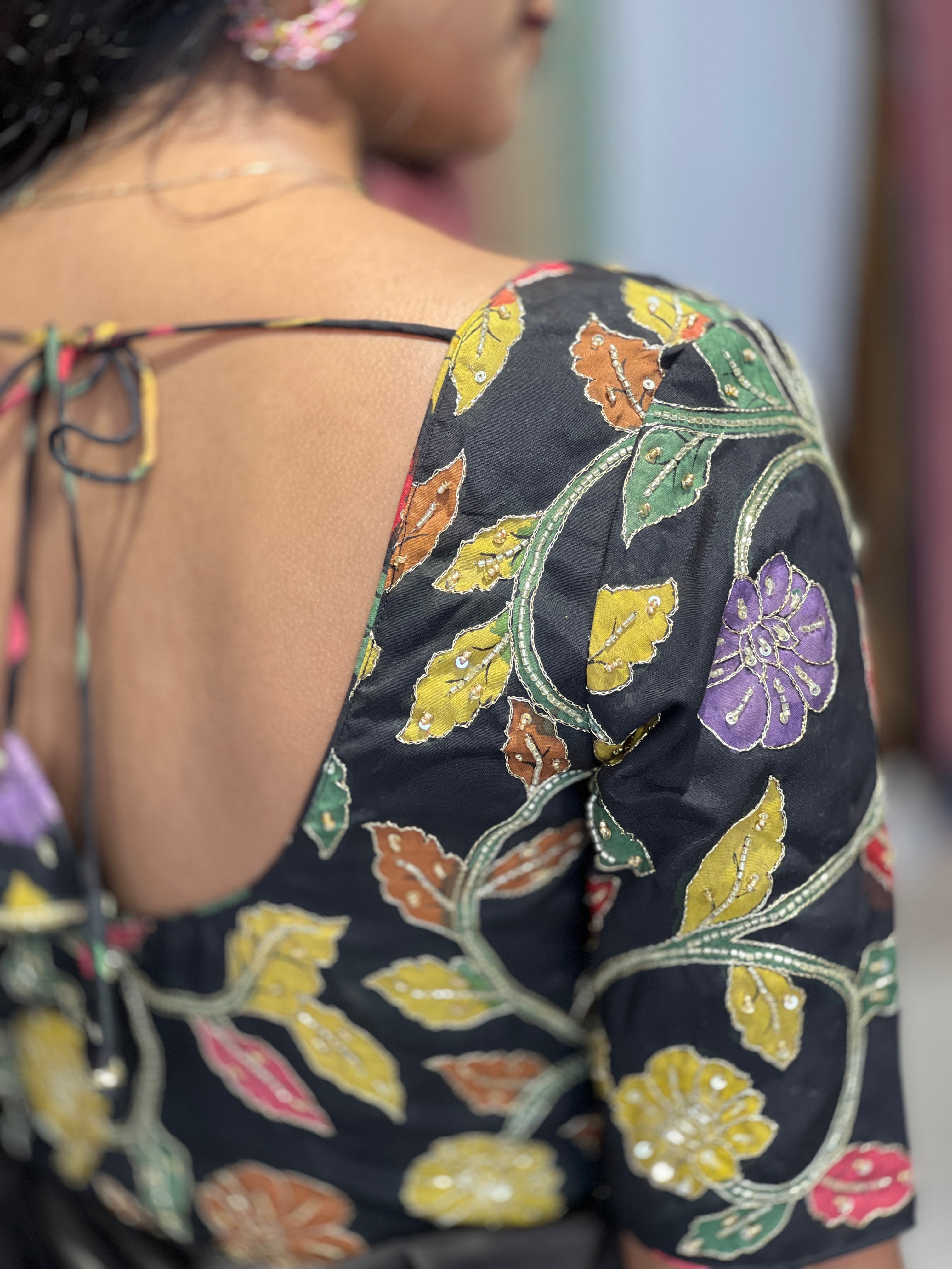 - Style: Pen Kalamkari With Sequence & Zari Highlight, Back Tie Detailing, Princess Cut, Padded, Cotton Lining.