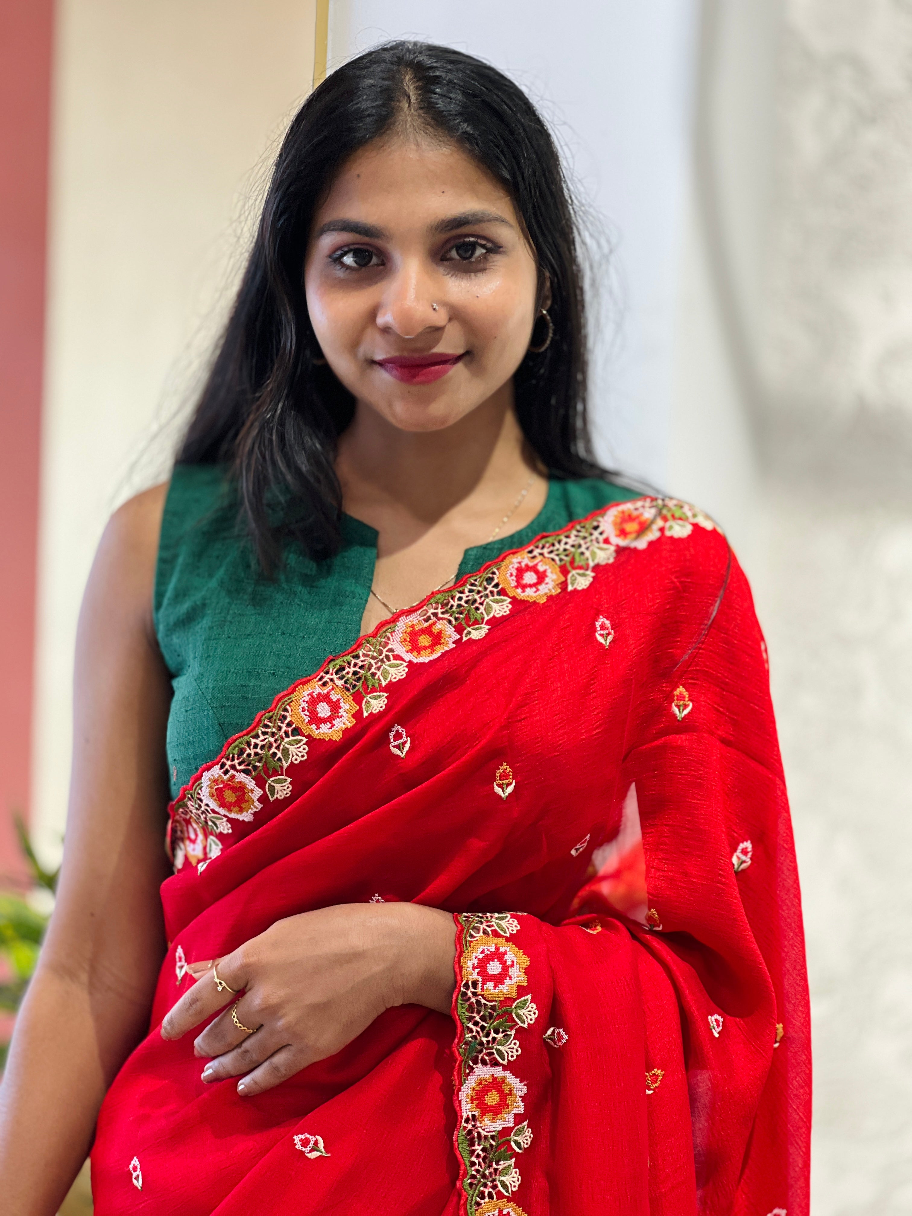 - Style: Cut Work & Cross Stitch Embroidery Borders & Pallu, Scattered Floral Motifs