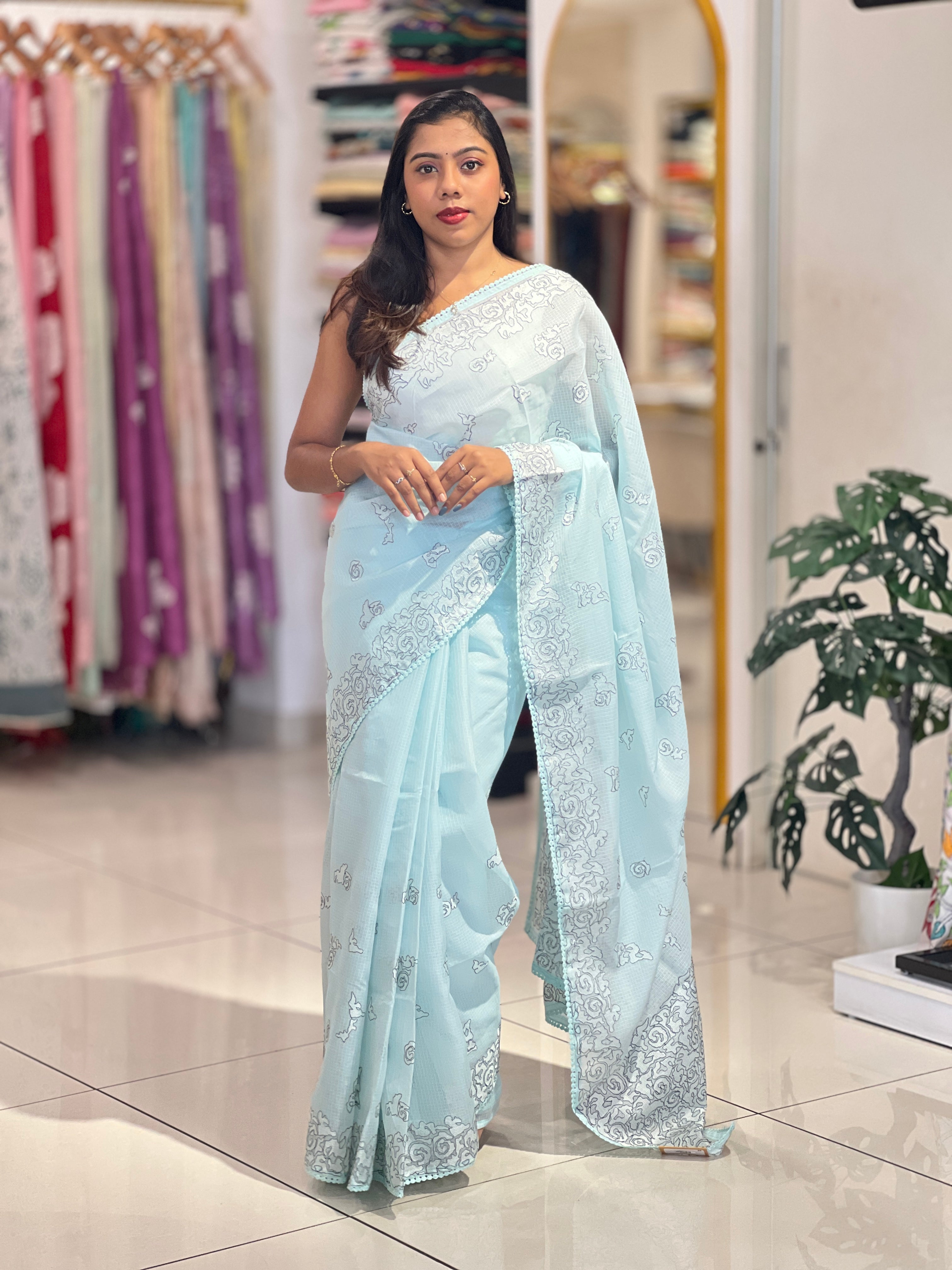 • Style: Scattered Butta, Embroidery Detailed Borders & Pallu, Lace Finished Edges
