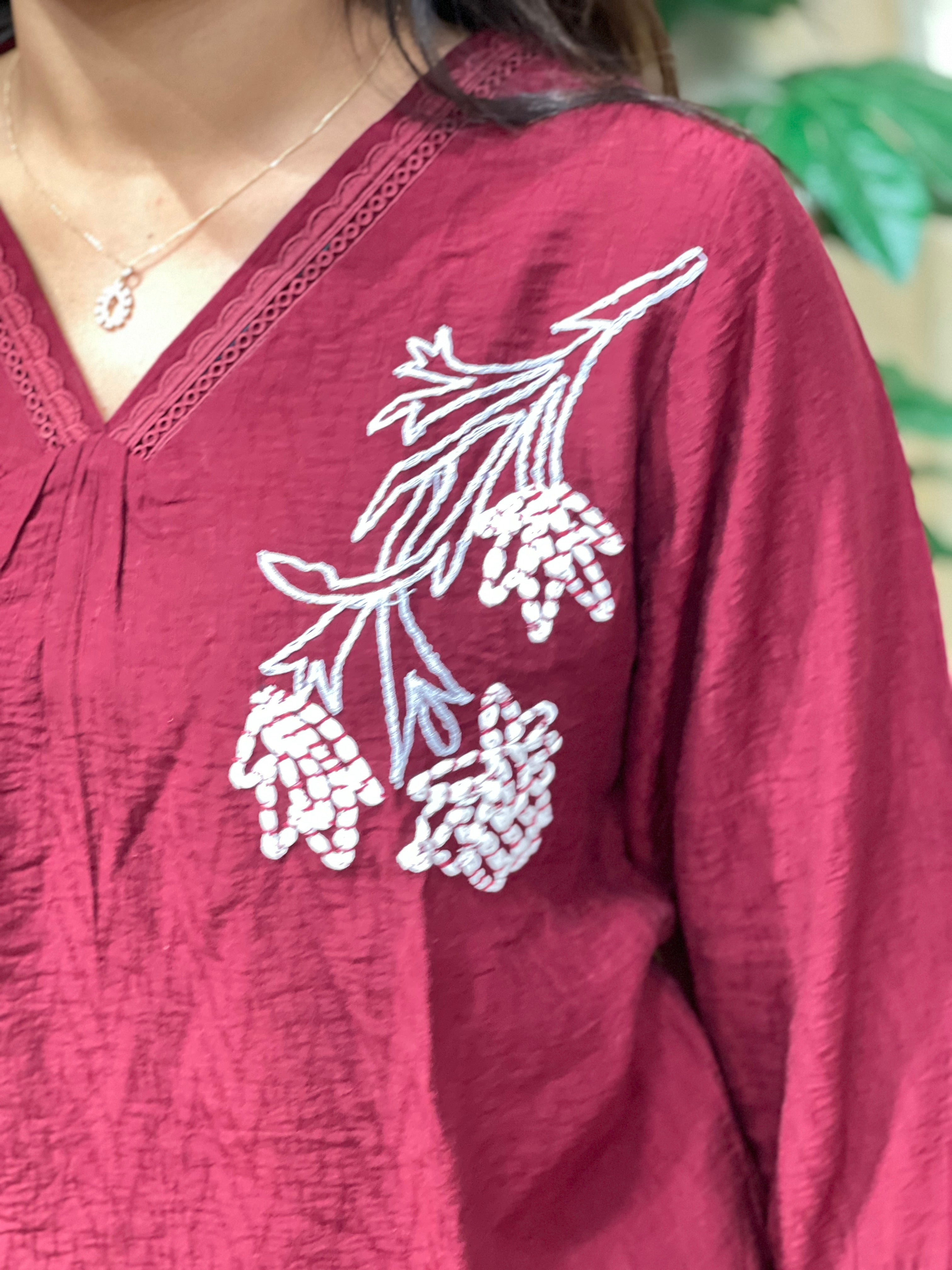 • Style: Machine Embroidery Detailing, Lace Detailing On Neck & Sleeves