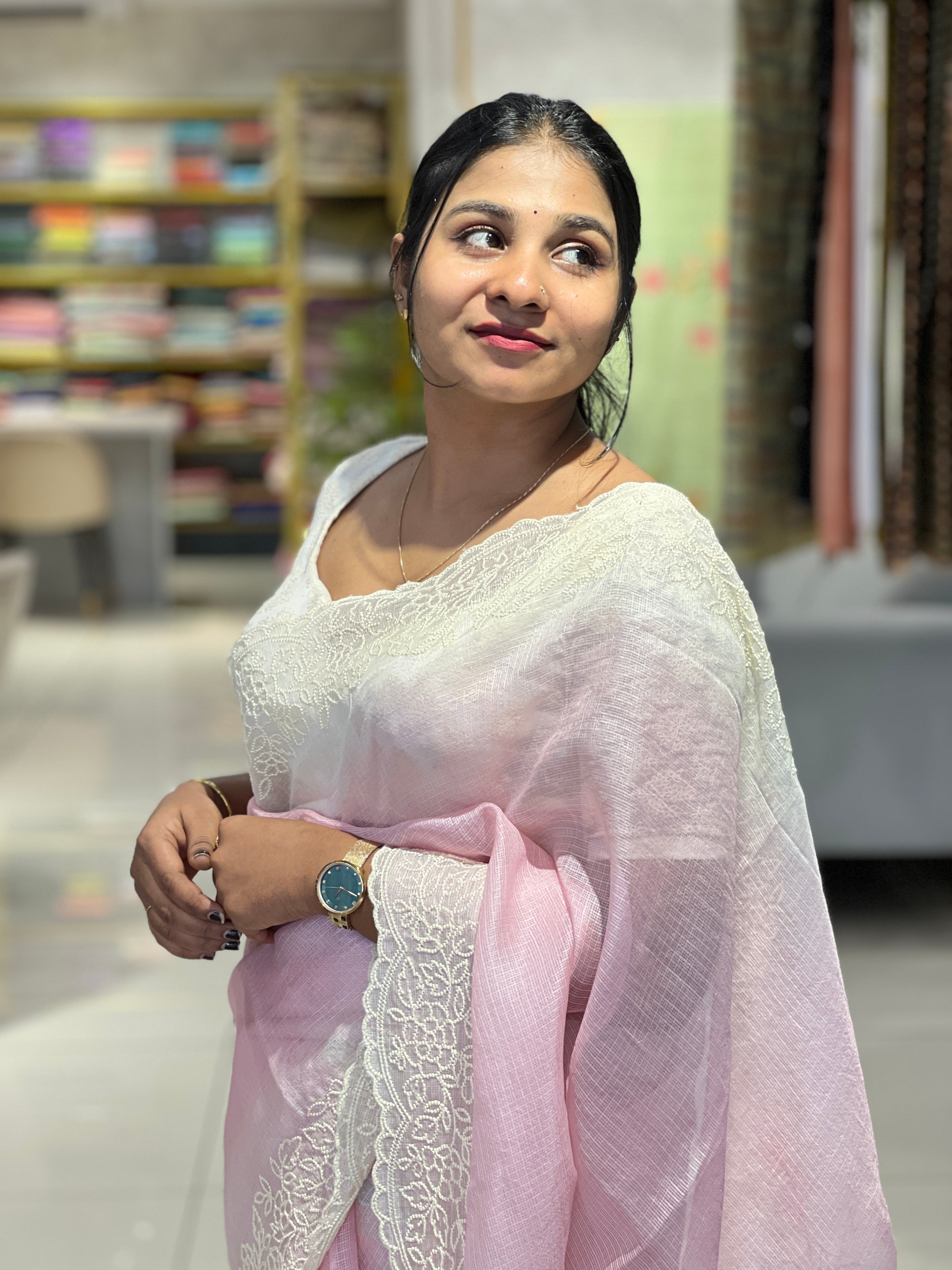 - Style: Shaded Border With Point Embroidery & Scallop Detailing, Multi Colour Organza Floral Applique Detailing