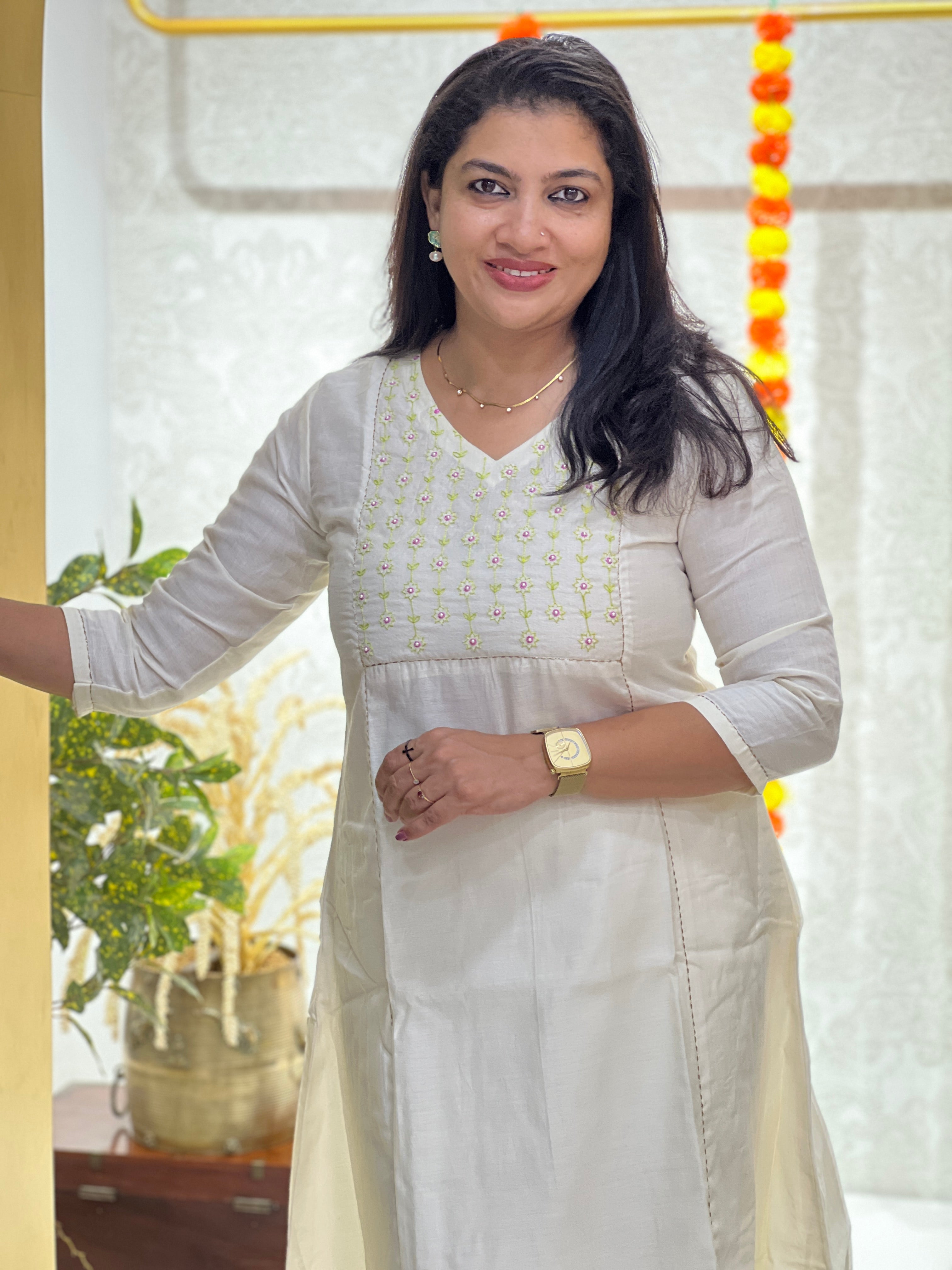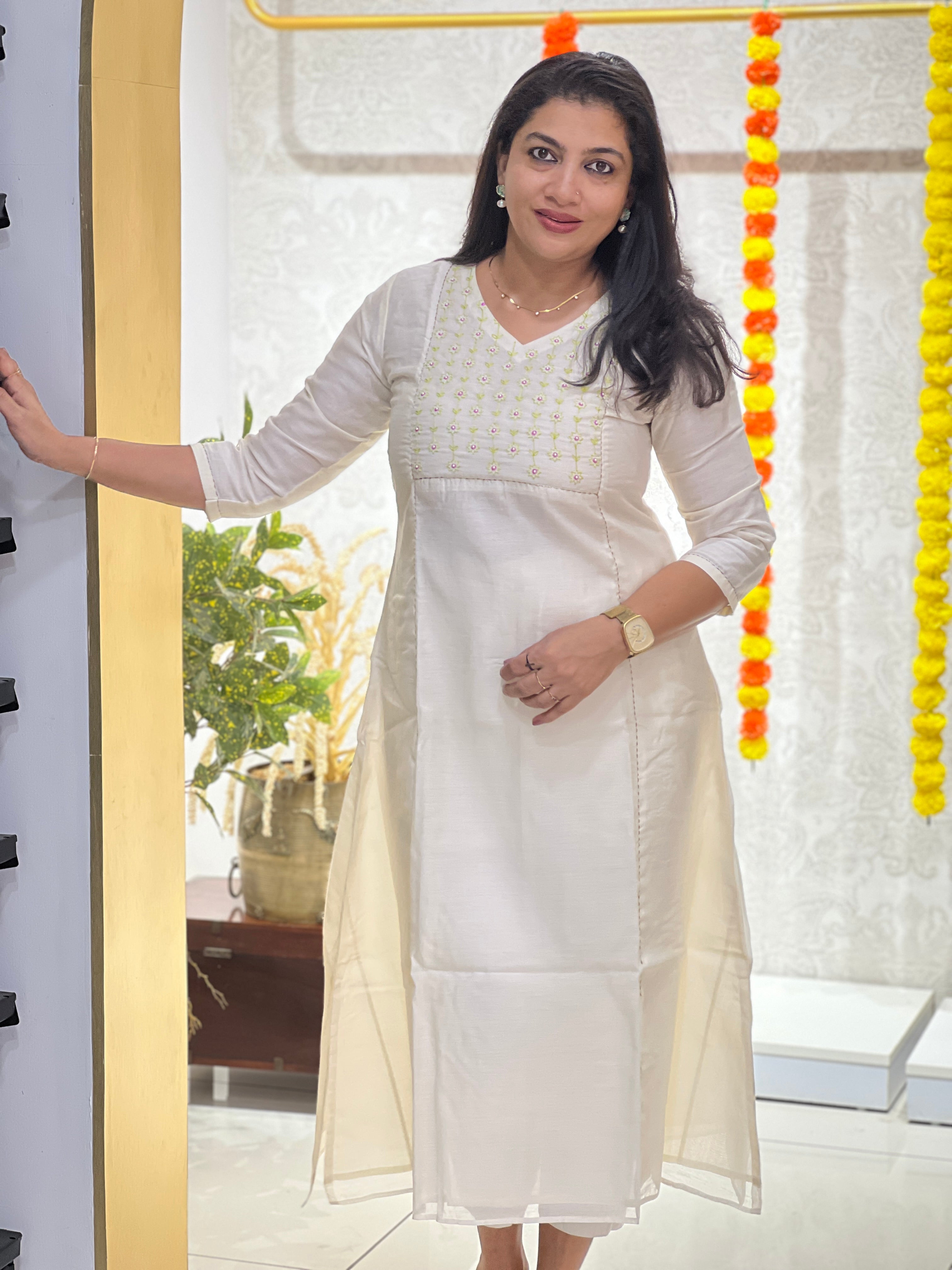 - Style - Embroidery With Sequence Highlighted Yoke Portion, Zari Kantha Detailing, Jamdani Weaved, Panel Detailing, With Lining, A-Line Pattern