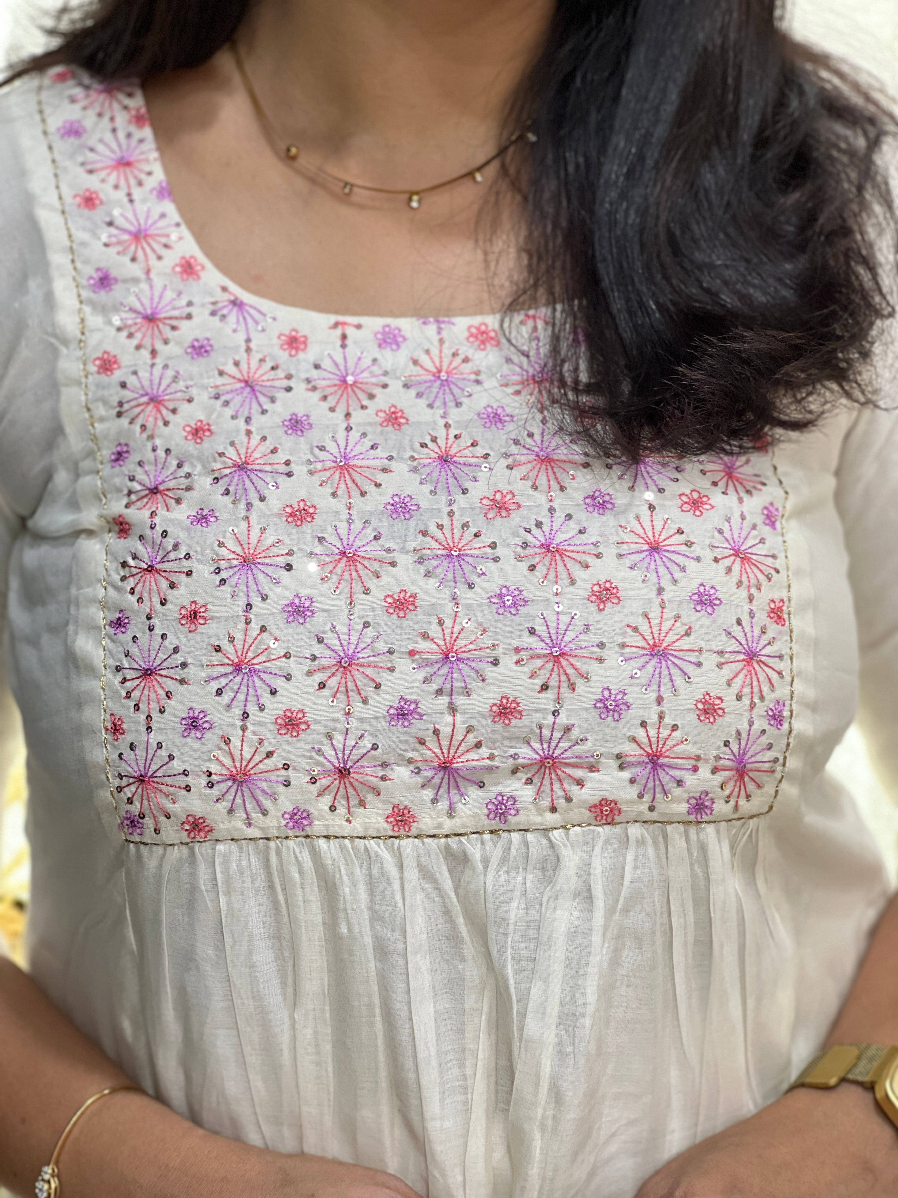 - Style - Machine Embroidery With Sequence Highlighted Yoke Portion, Jamdani Weaved Yoke, A-Line Pattern, Gathering Detailing, Kantha Detailing