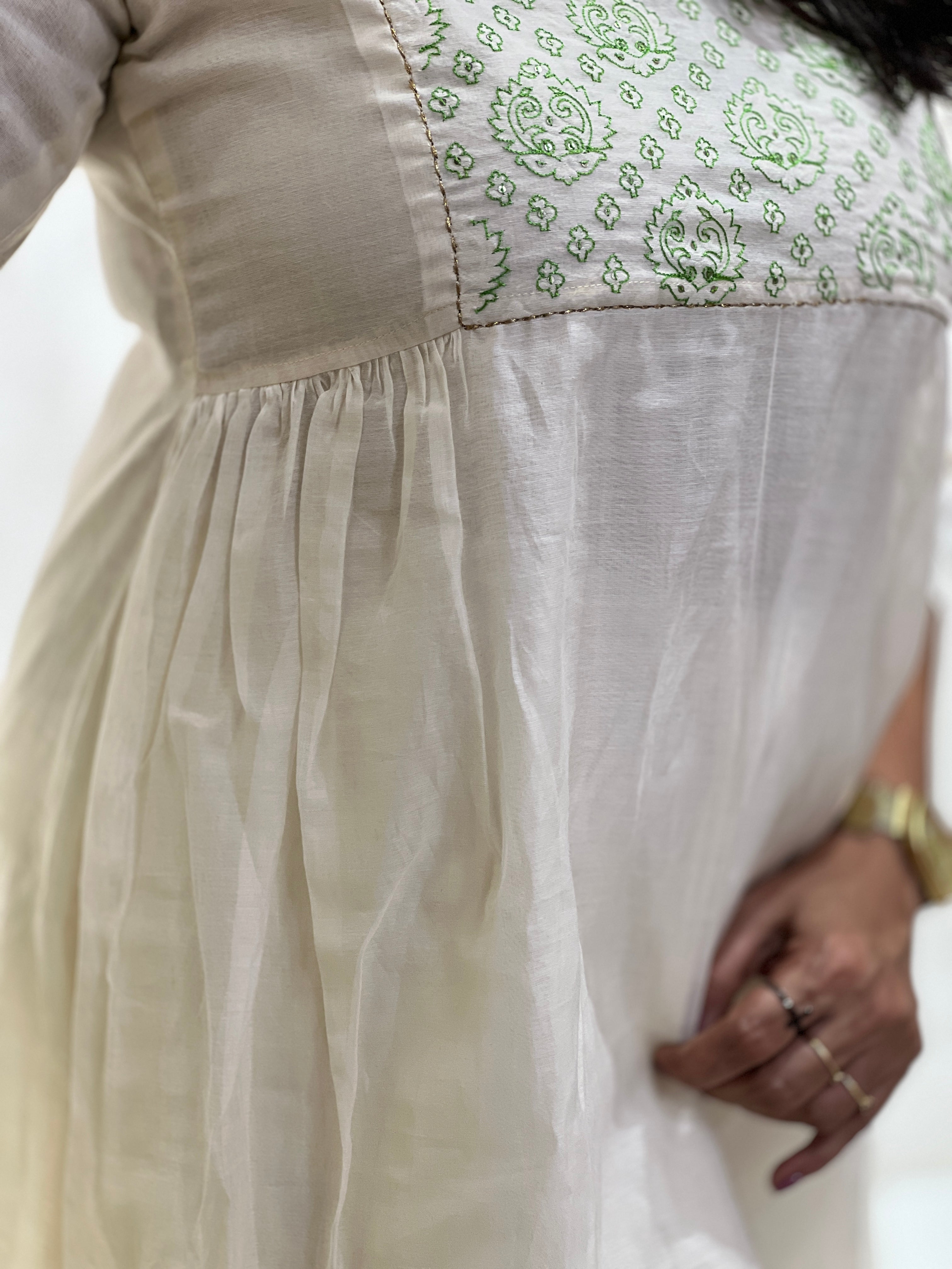 - Style - Machine Embroidery With Sequence Detailed Yoke Portion, Jamdani Weaved Yoke Portion, Kantha Detailing, With Lining, Side Pleated, A-Line Pattern