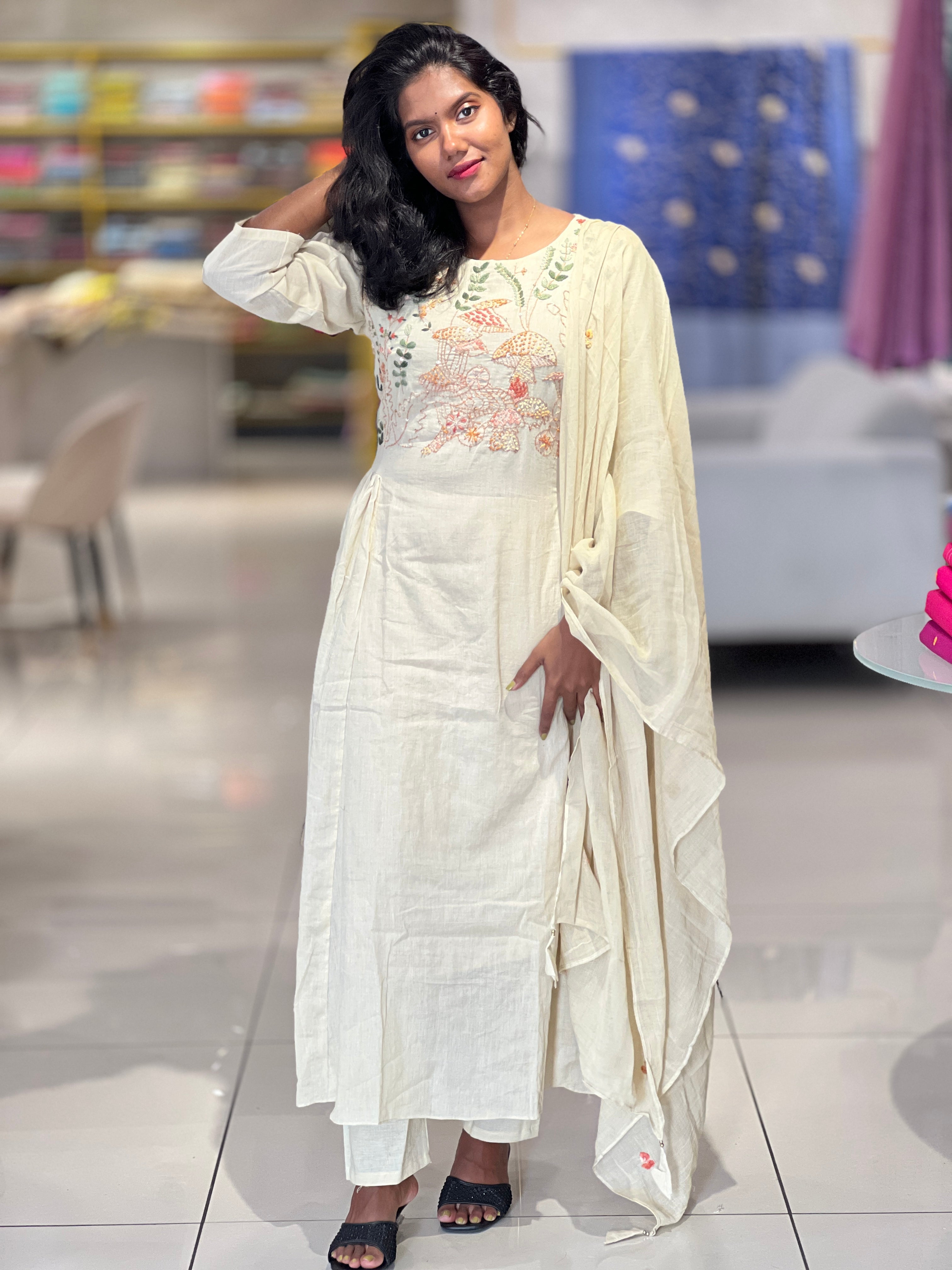 - Style: Multi-Colour Thread Embroidery With Sequence Highlighted Yoke Portion, Gathering Detailed Side Panels, A-Line Pattern.