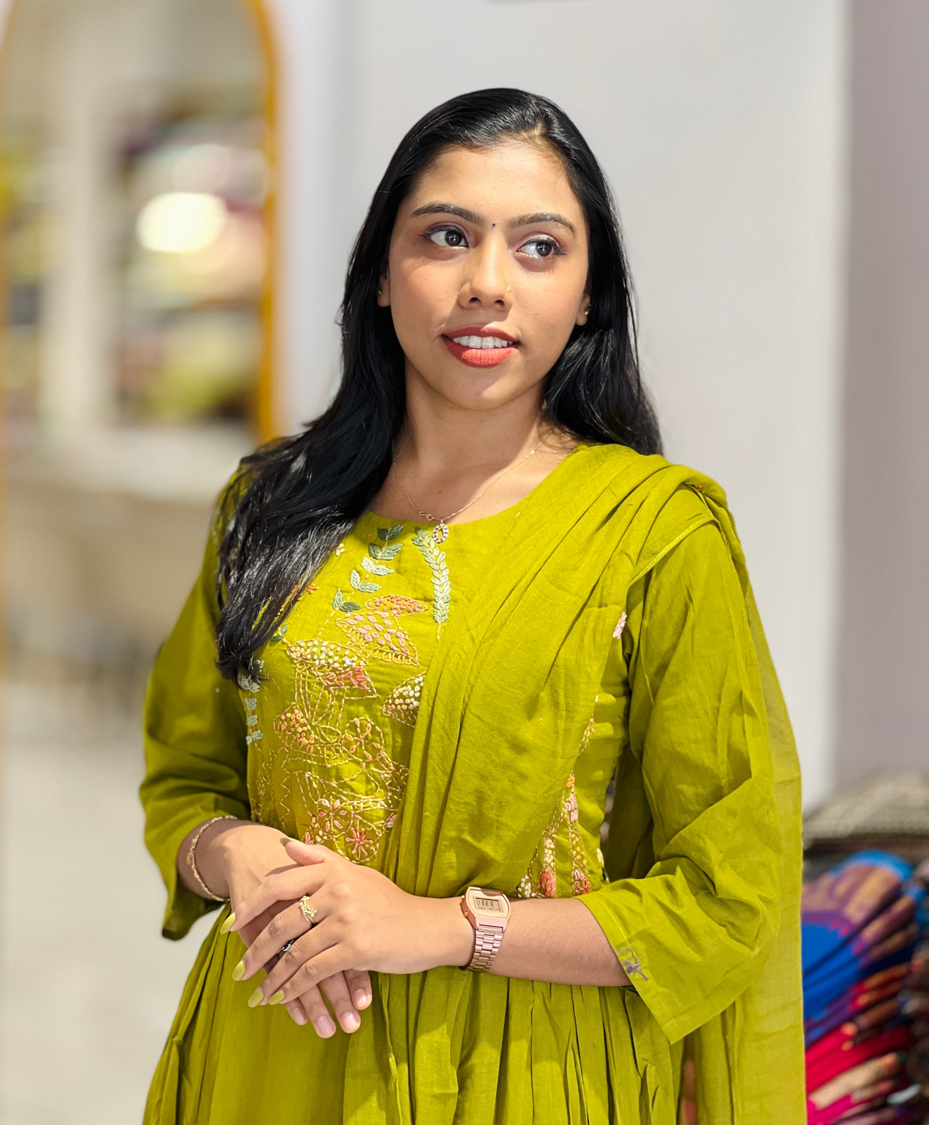 • Style: Multi-Colour Thread Embroidery With Sequence Highlighted Yoke Portion, Gathering Detailed Side Panels, A-Line Pattern.