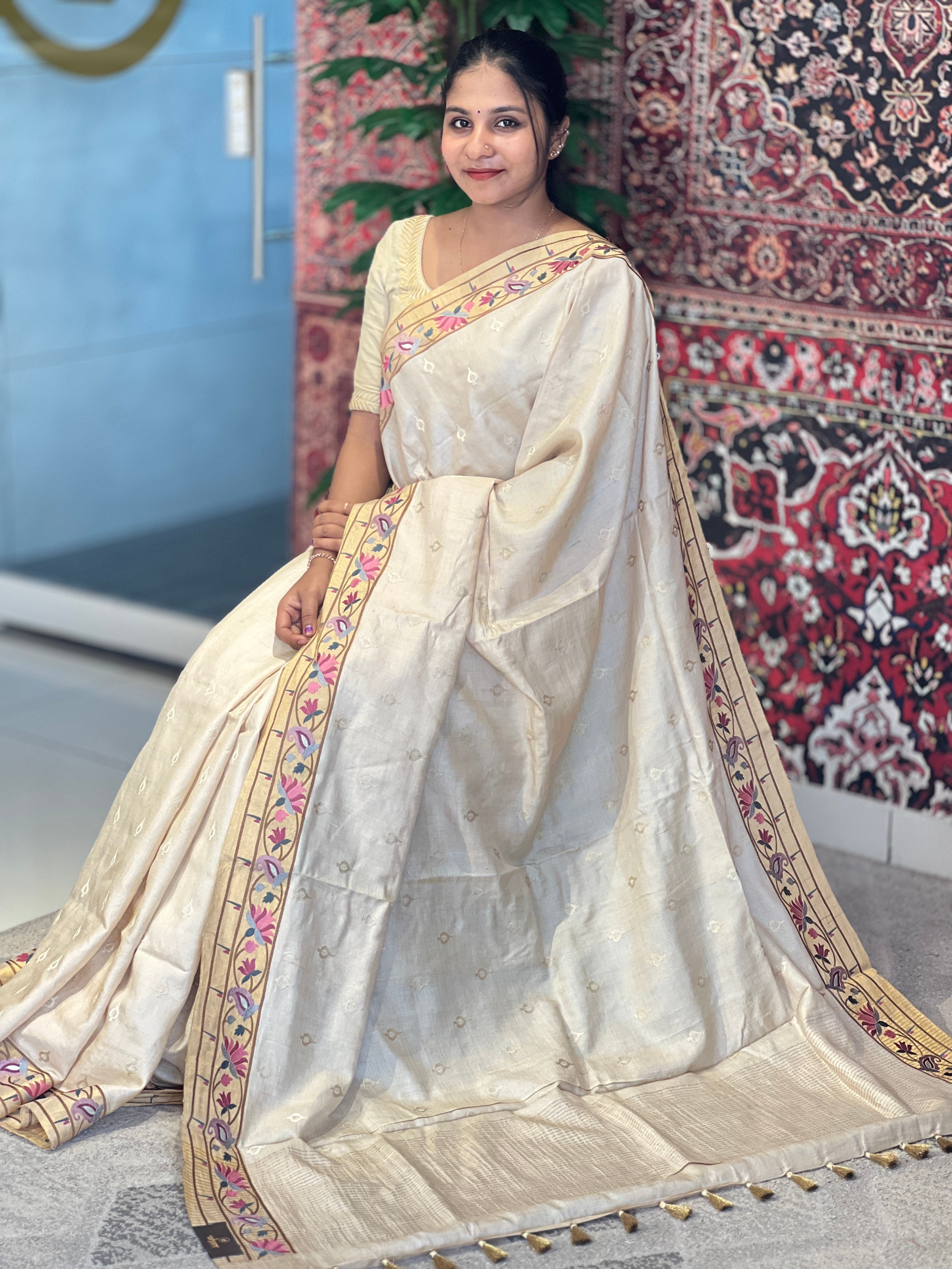 - Style: Machine Embroidery Detailed Borders, Scattered Butta, Golden Zari Stripe Patterned Pallu, Tassels Attached