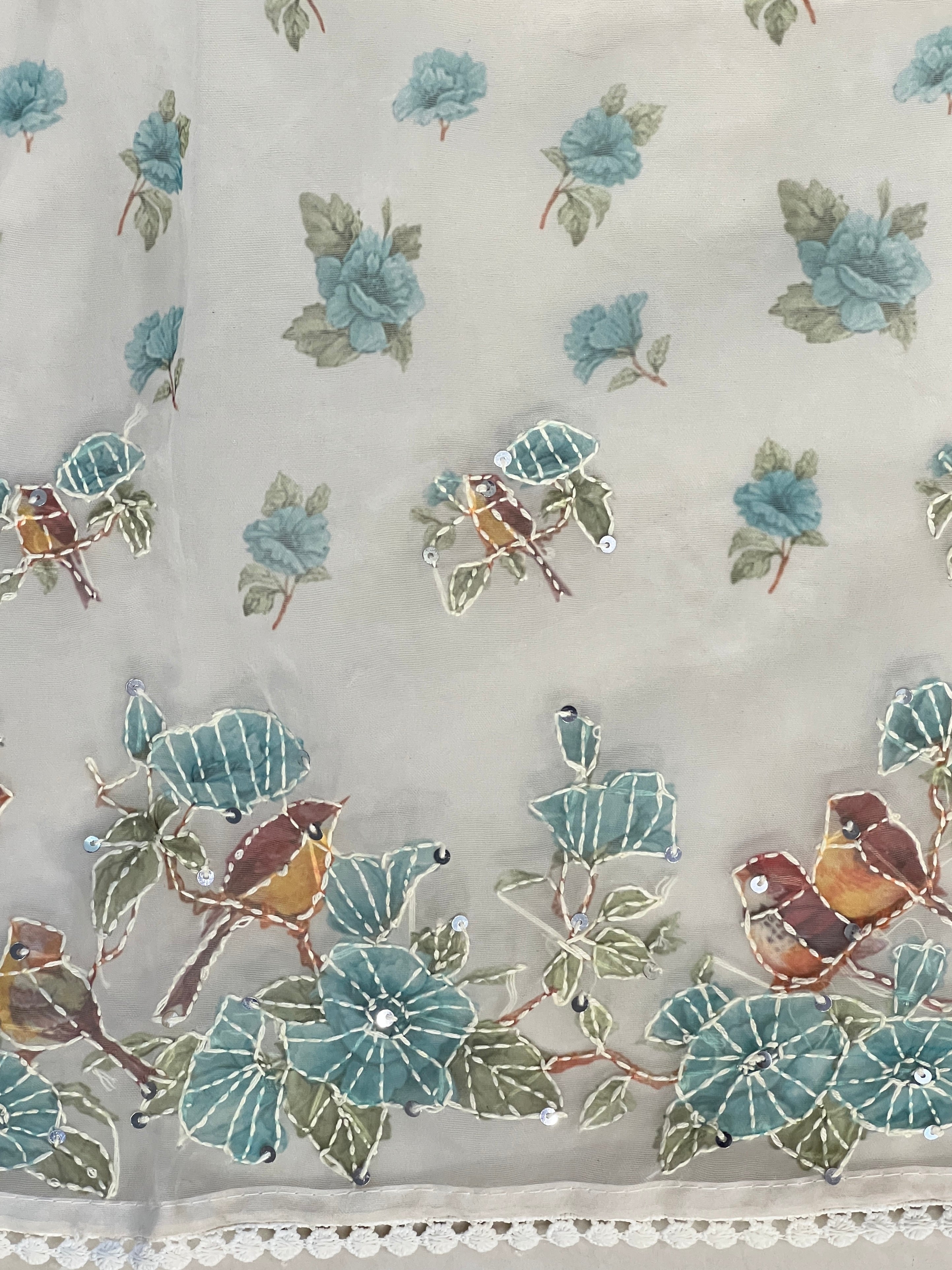 • Style: Floral and Bird Digital Print With Kantha Highlight, Scattered Motifs, Lace Finish