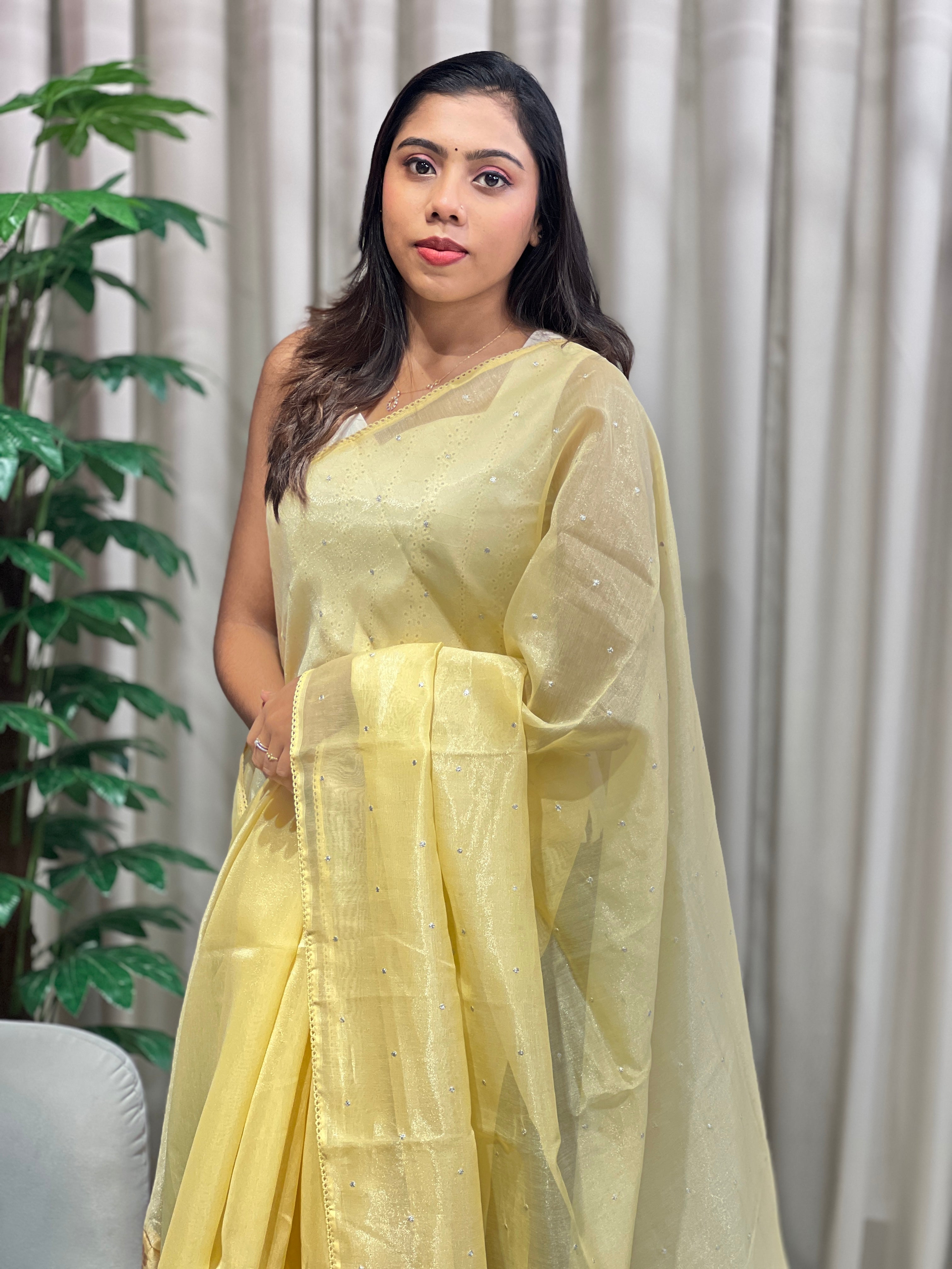 - Style: Scattered Silver Zari Polka Detailing, Floral Applique Detailed Pallu, Crochet Lace Edges