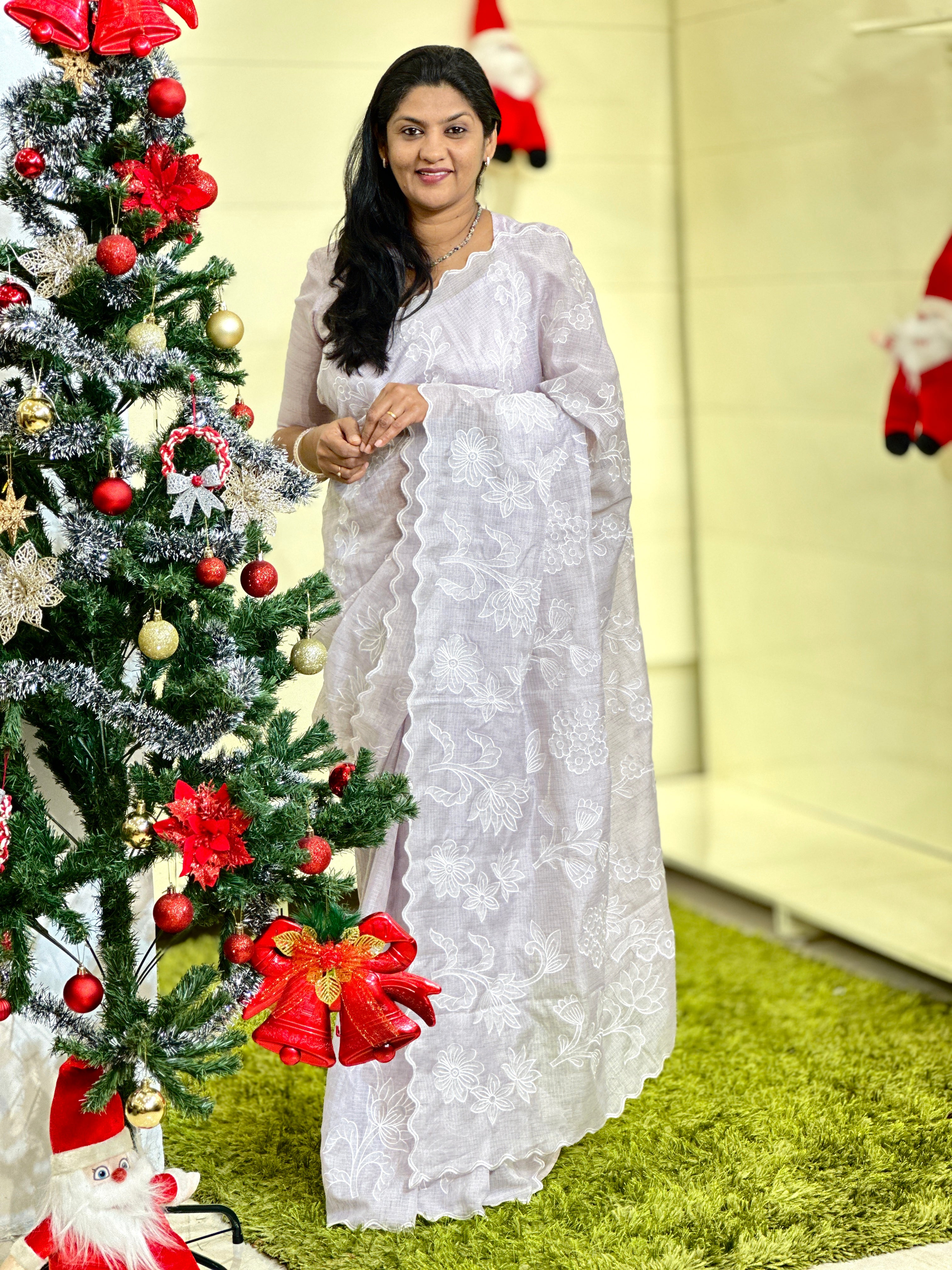 - Style: Floral Applique Work Detailing, Checking Weaving Pattern, Scallop Edges