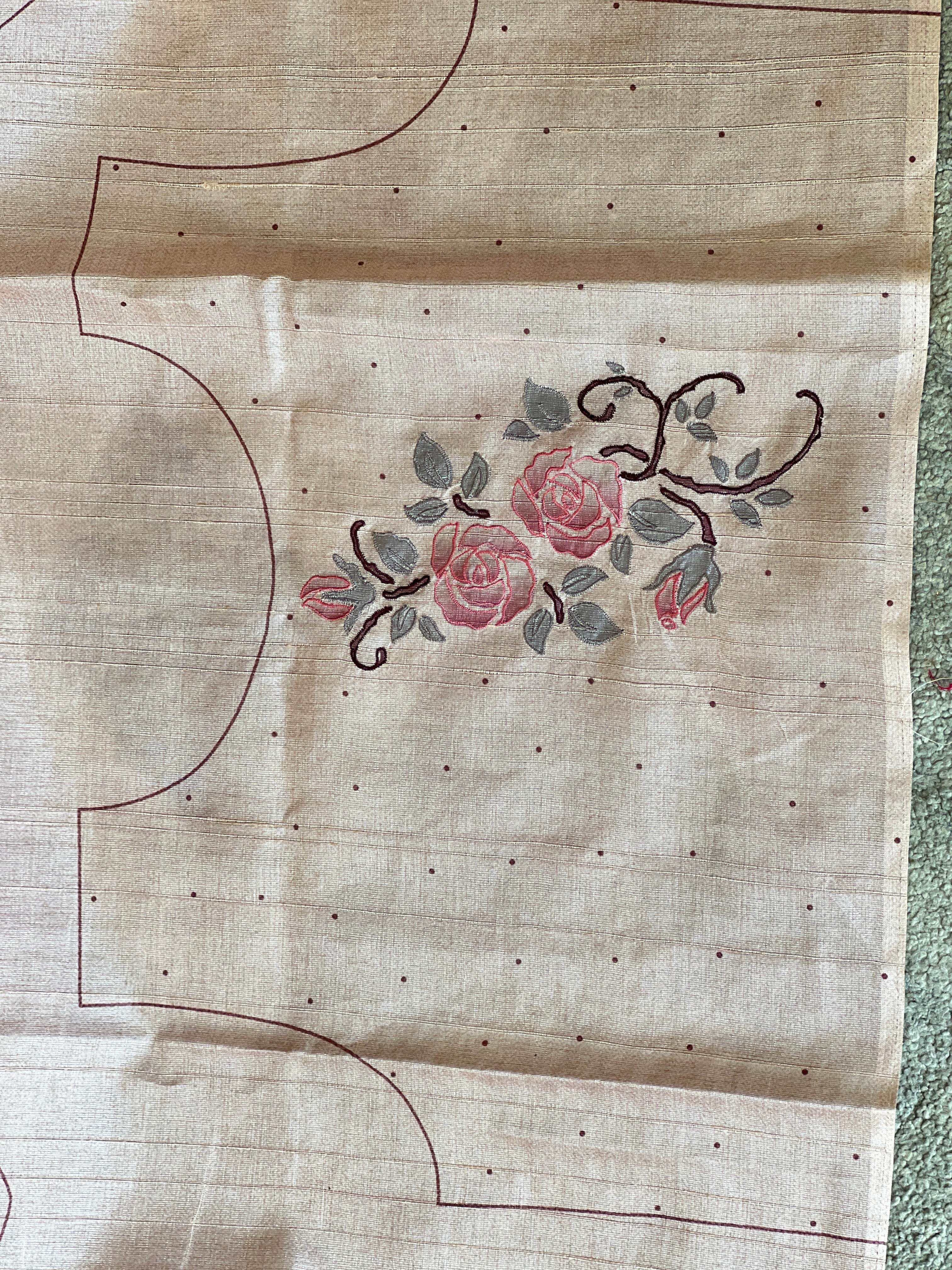 - Style: Scattered Floral Applique With Machine Embroidery Detailing, Line Patterned Borders, Tassels Attached