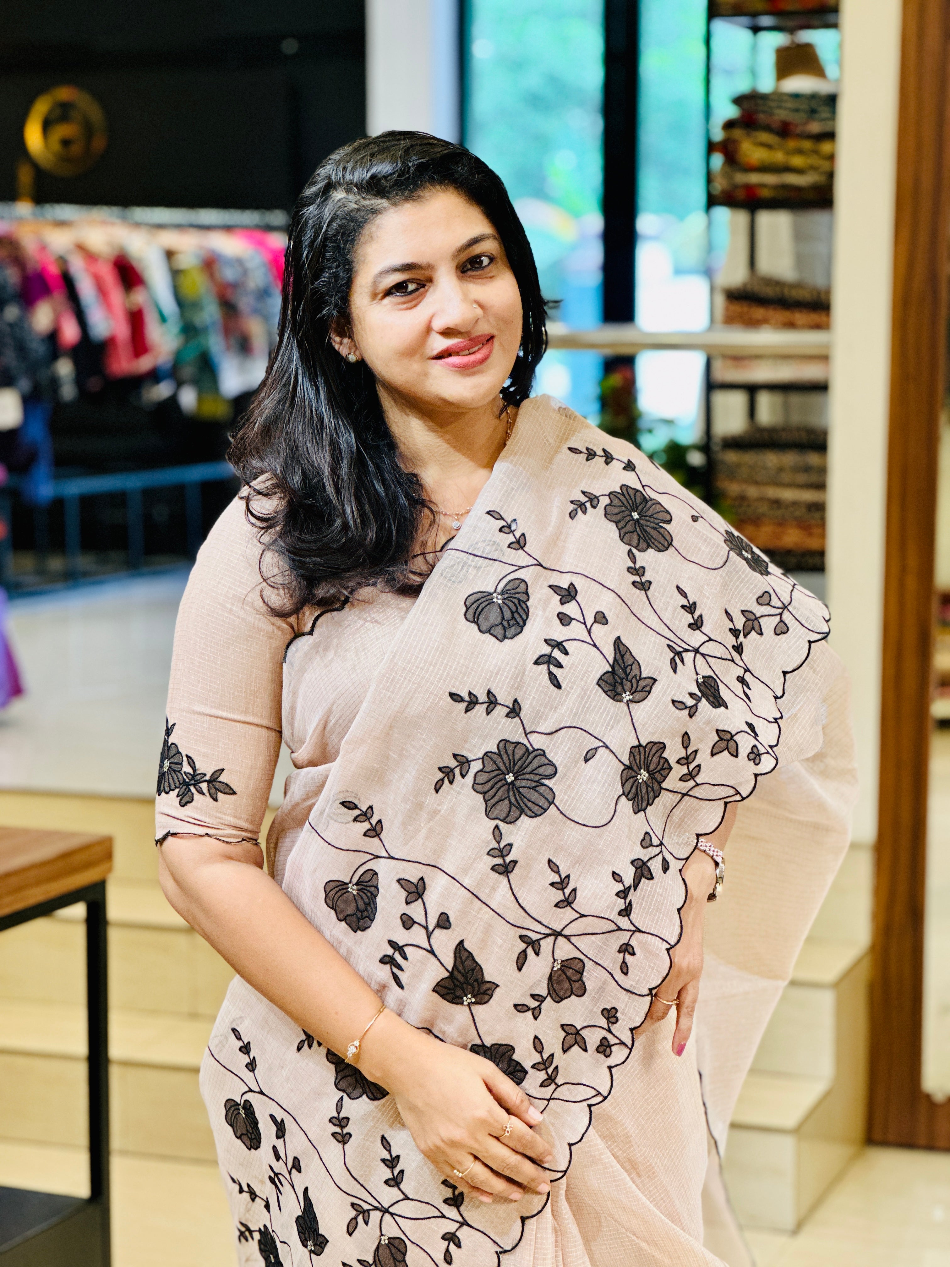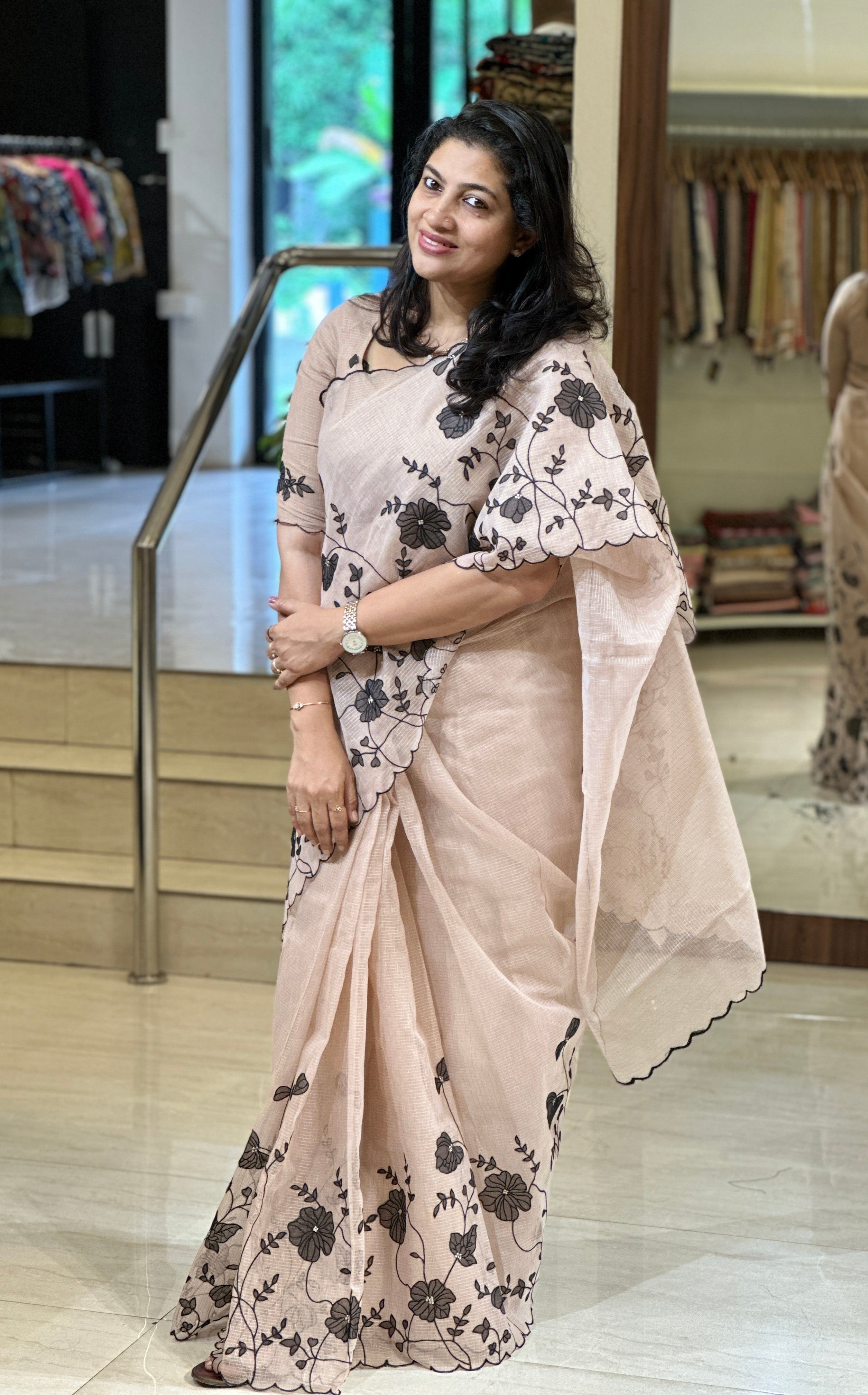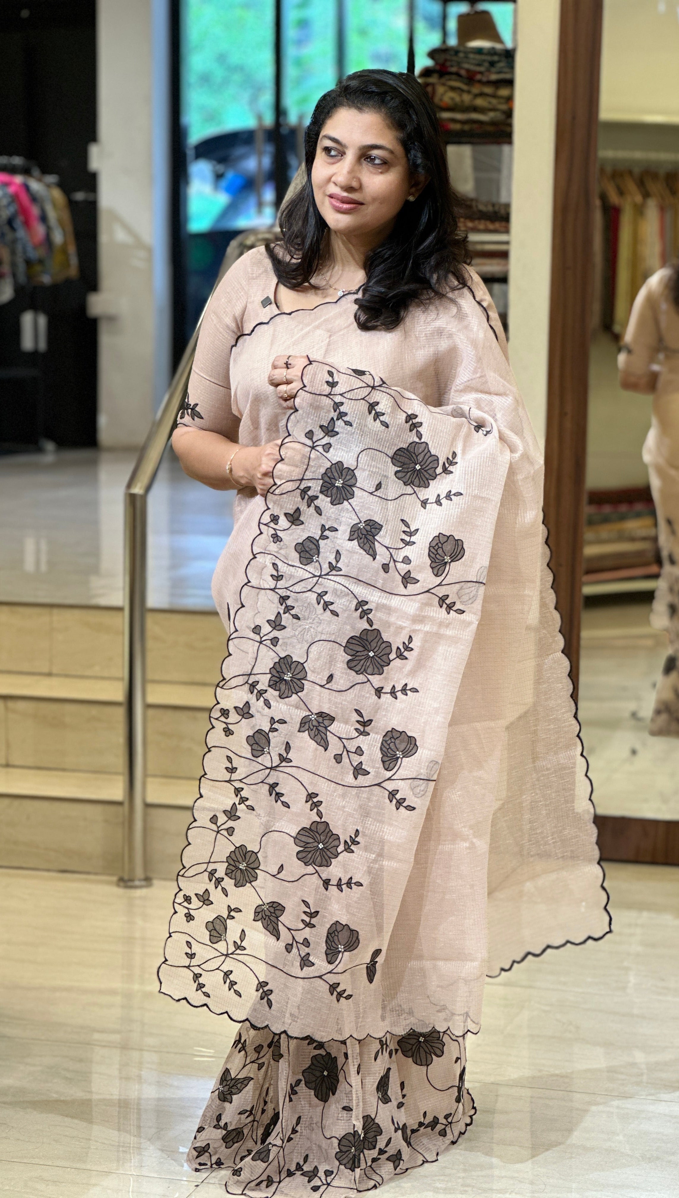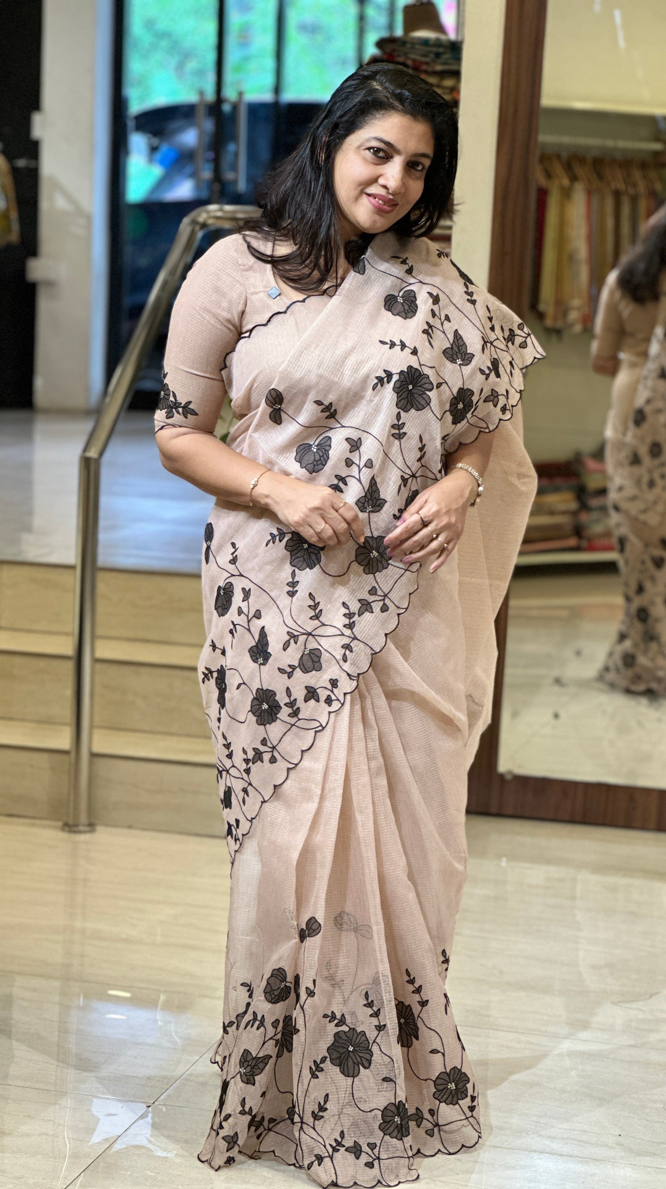 - Style: Floral Applique With Machine Embroidery Detailed Lower Border, Scallop Finished Edges, Zari Stripe Pattern