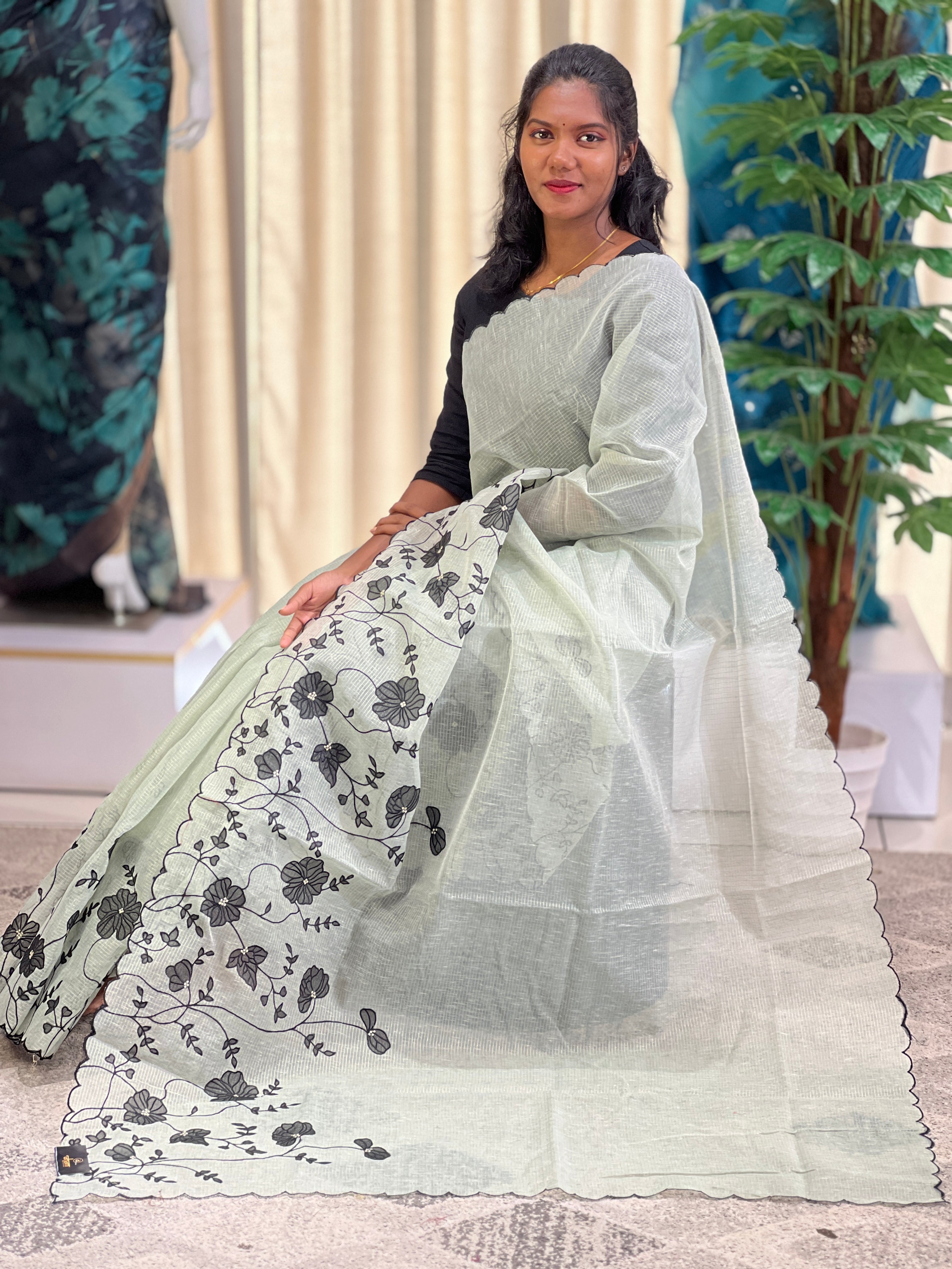 • Style: Floral Applique With Machine Embroidery Detailed Lower Border, Scallop Finished Edges, Zari Stripe Pattern