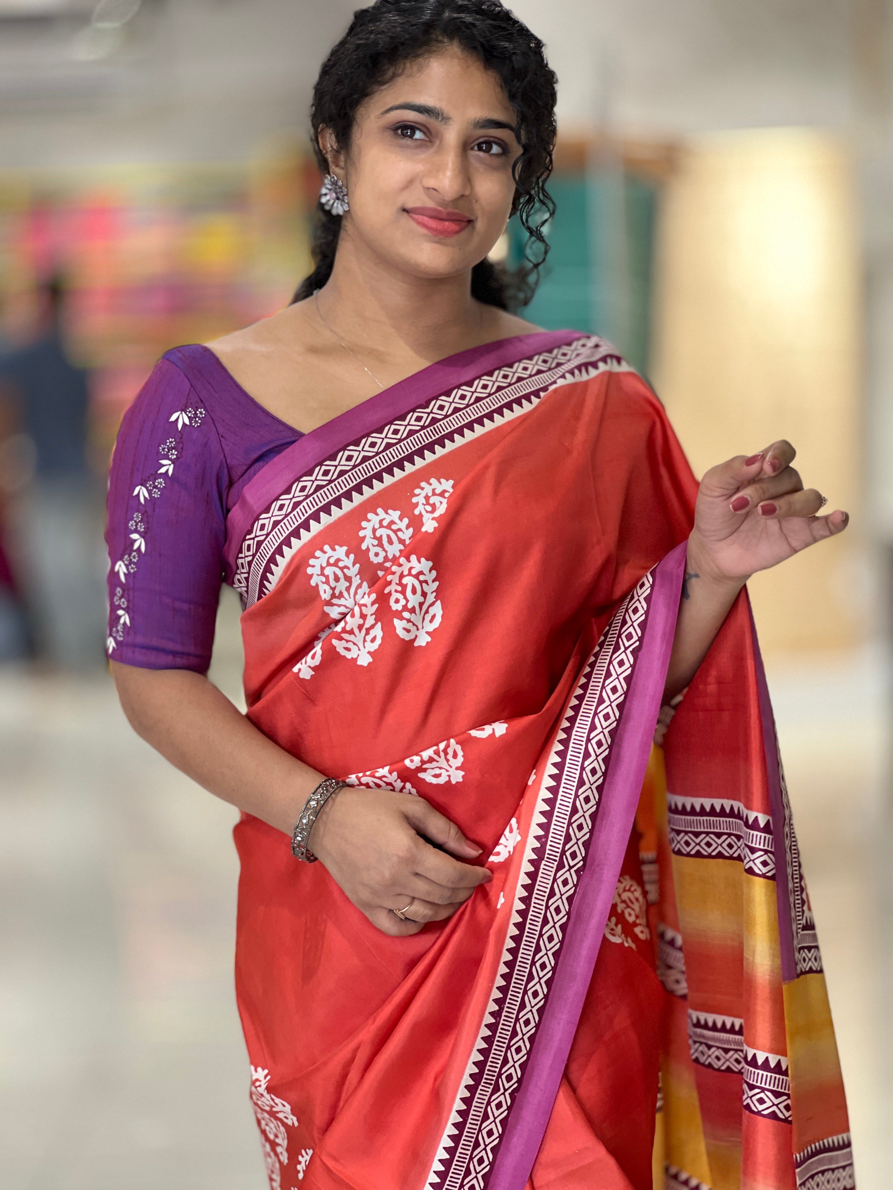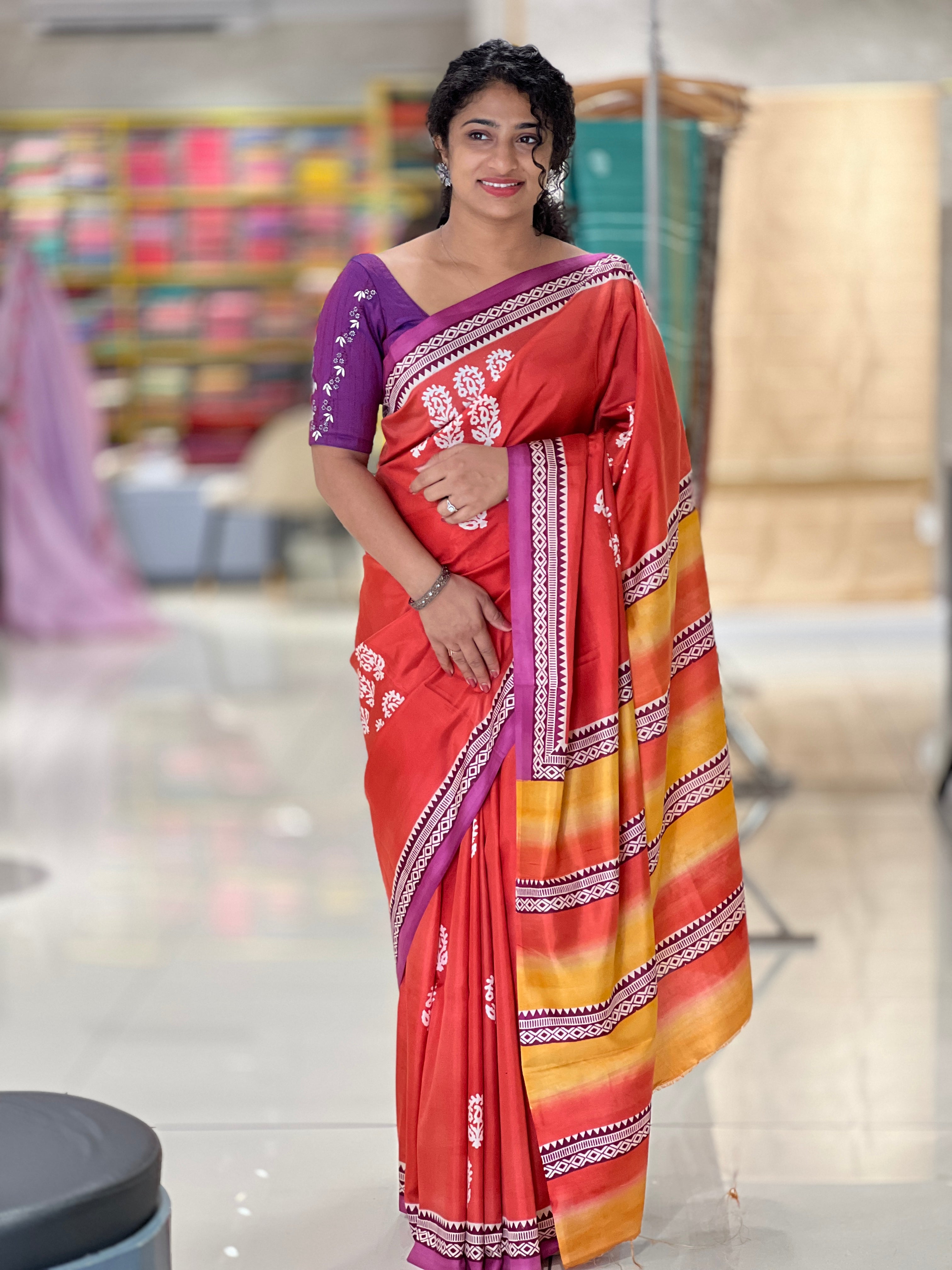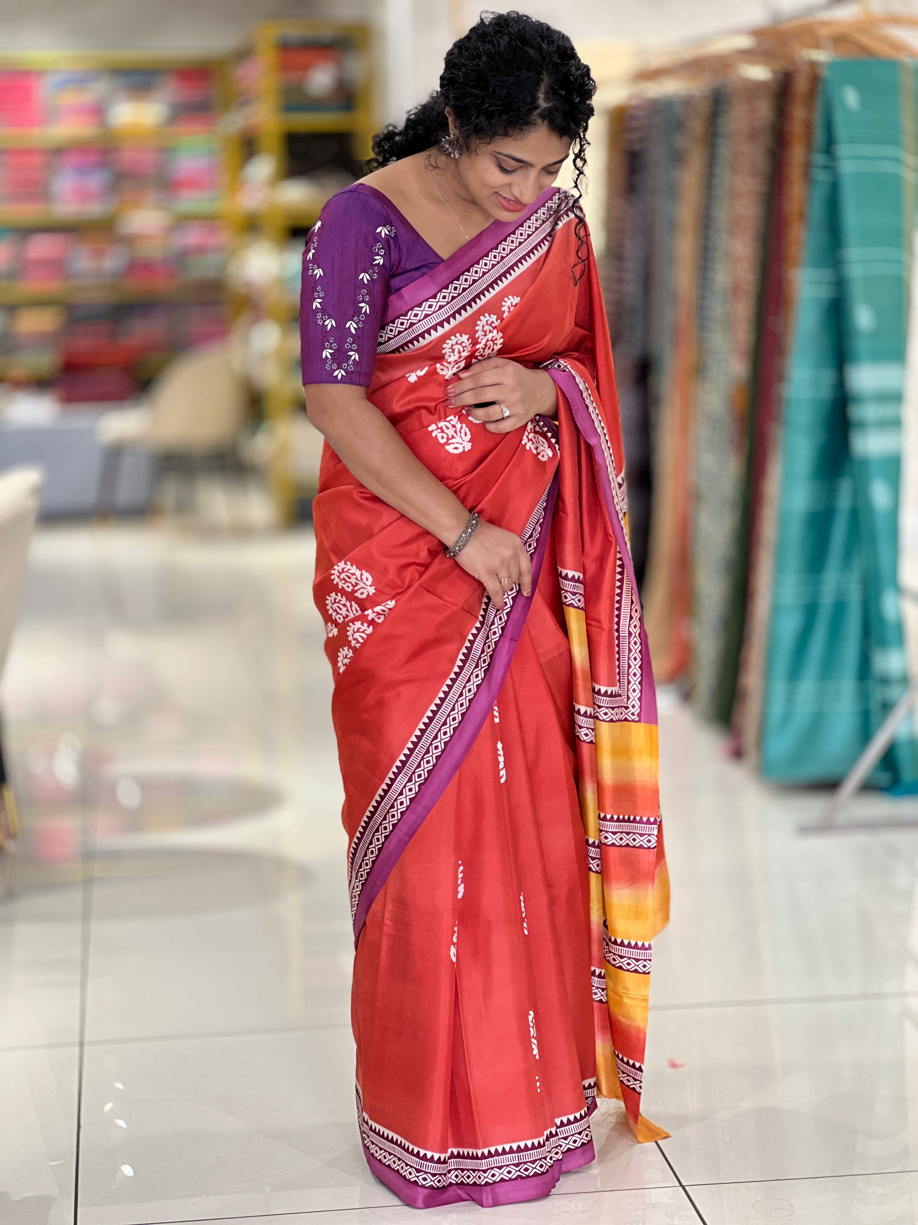 - Style: Block Printed, Floral Pattern, Double Shaded Pallu, Contrast Borders