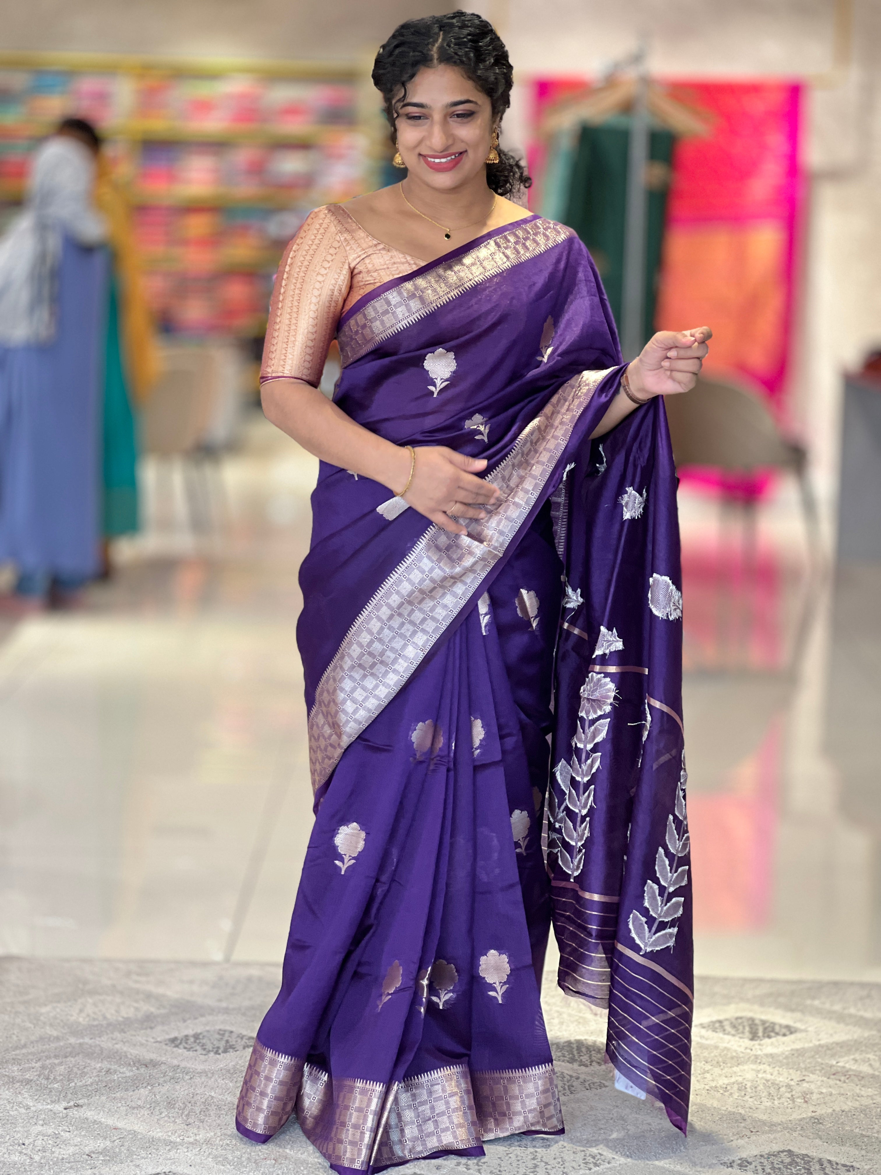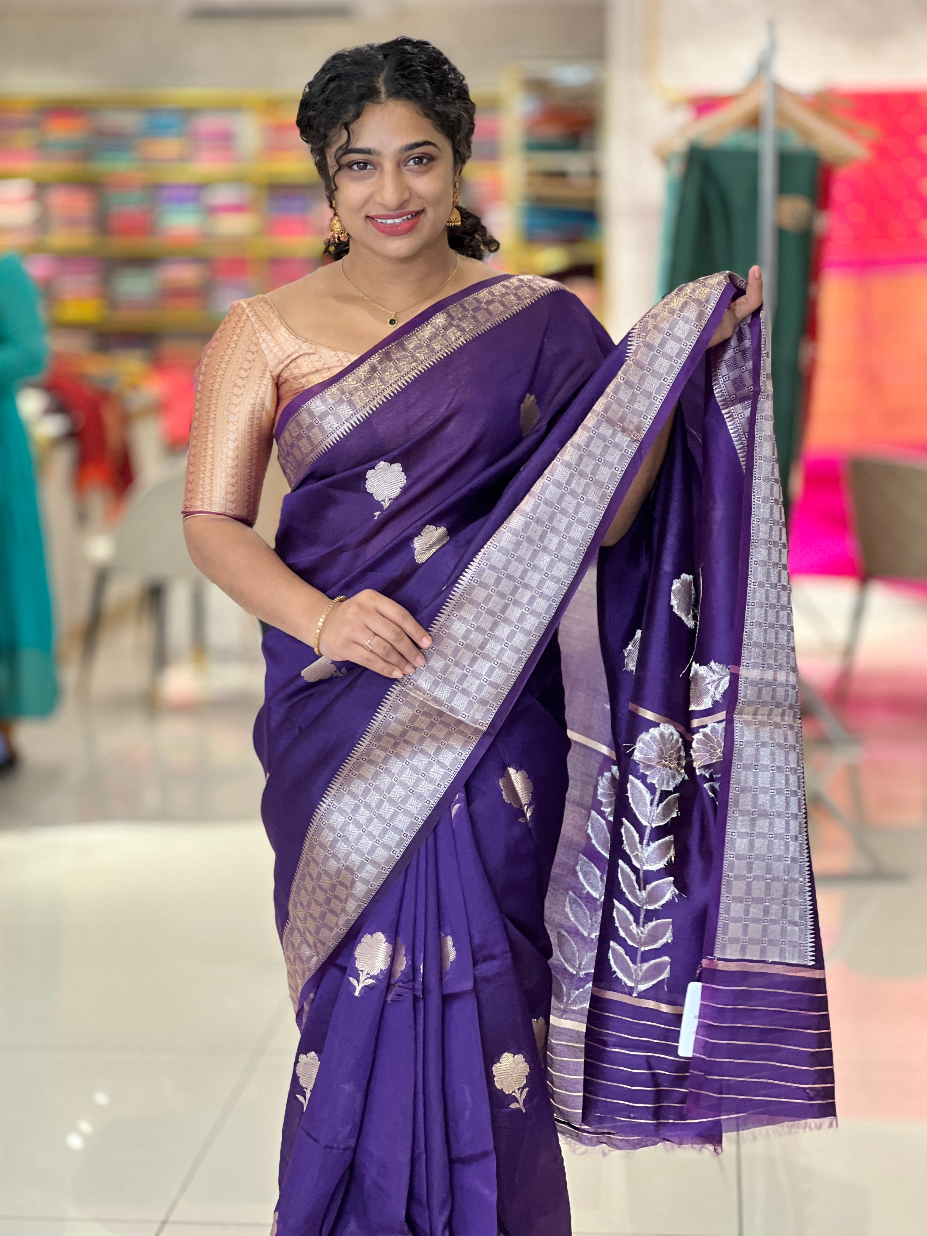 - Style: Zari Woven Scattered Floral Buta Detailing, Floral Patterned Pallu, Box Patterned Borders, Temple Border Detailing
