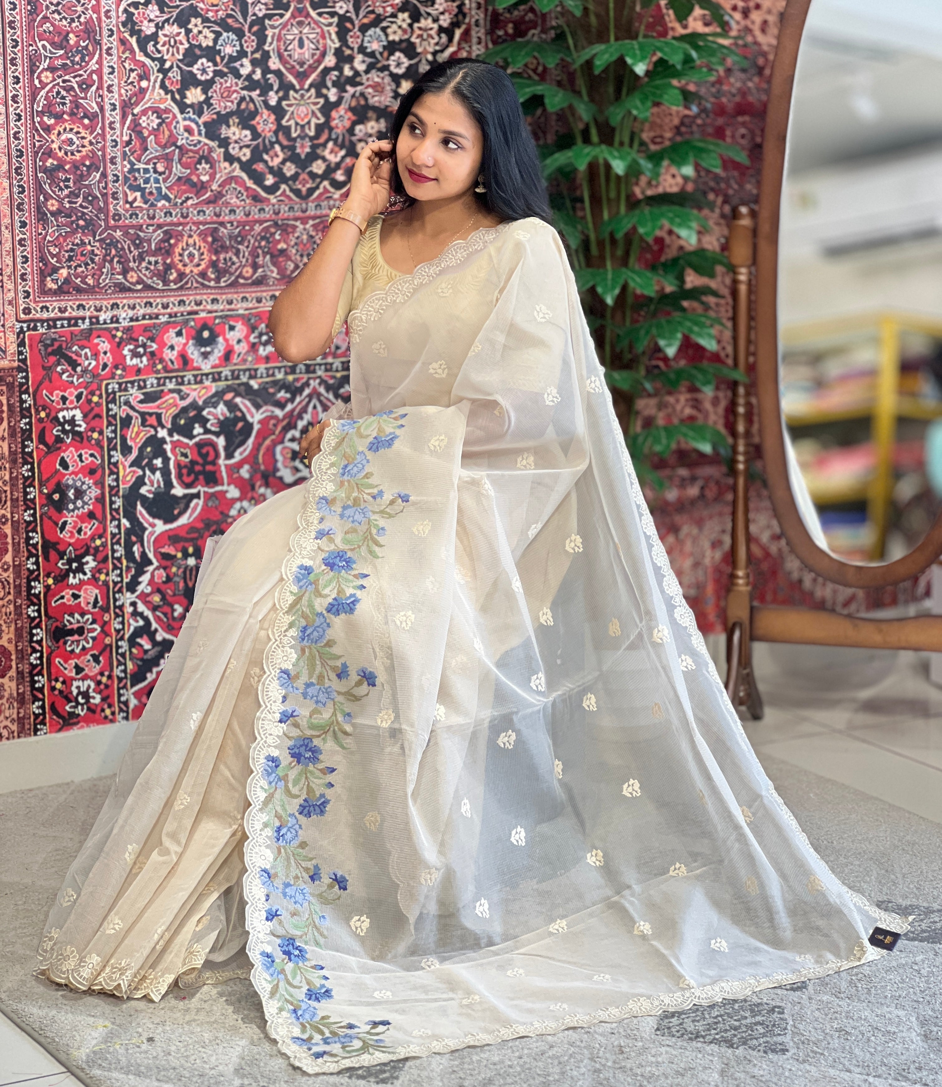 - Style: Self Check Pattern, Multi-Color Floral Cross Stitch Embroidery, Scallop Edges, Scattered Butta Detailing