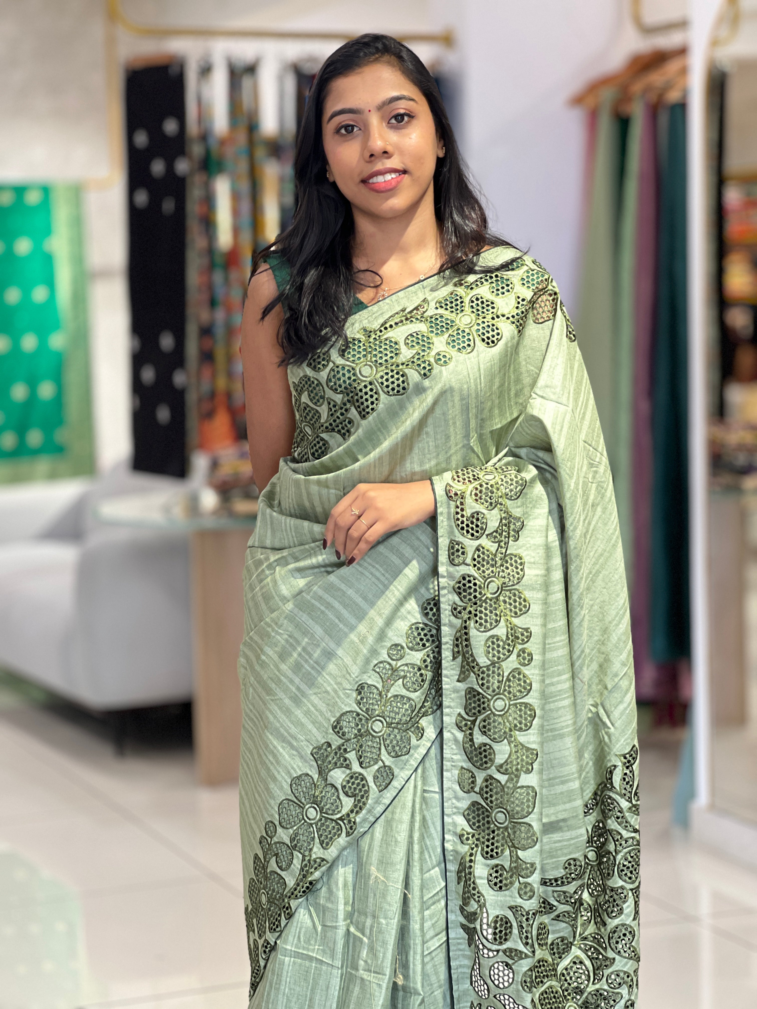 • Floral Cut-Work Embroidery Semi Tussar Saree | SUN327