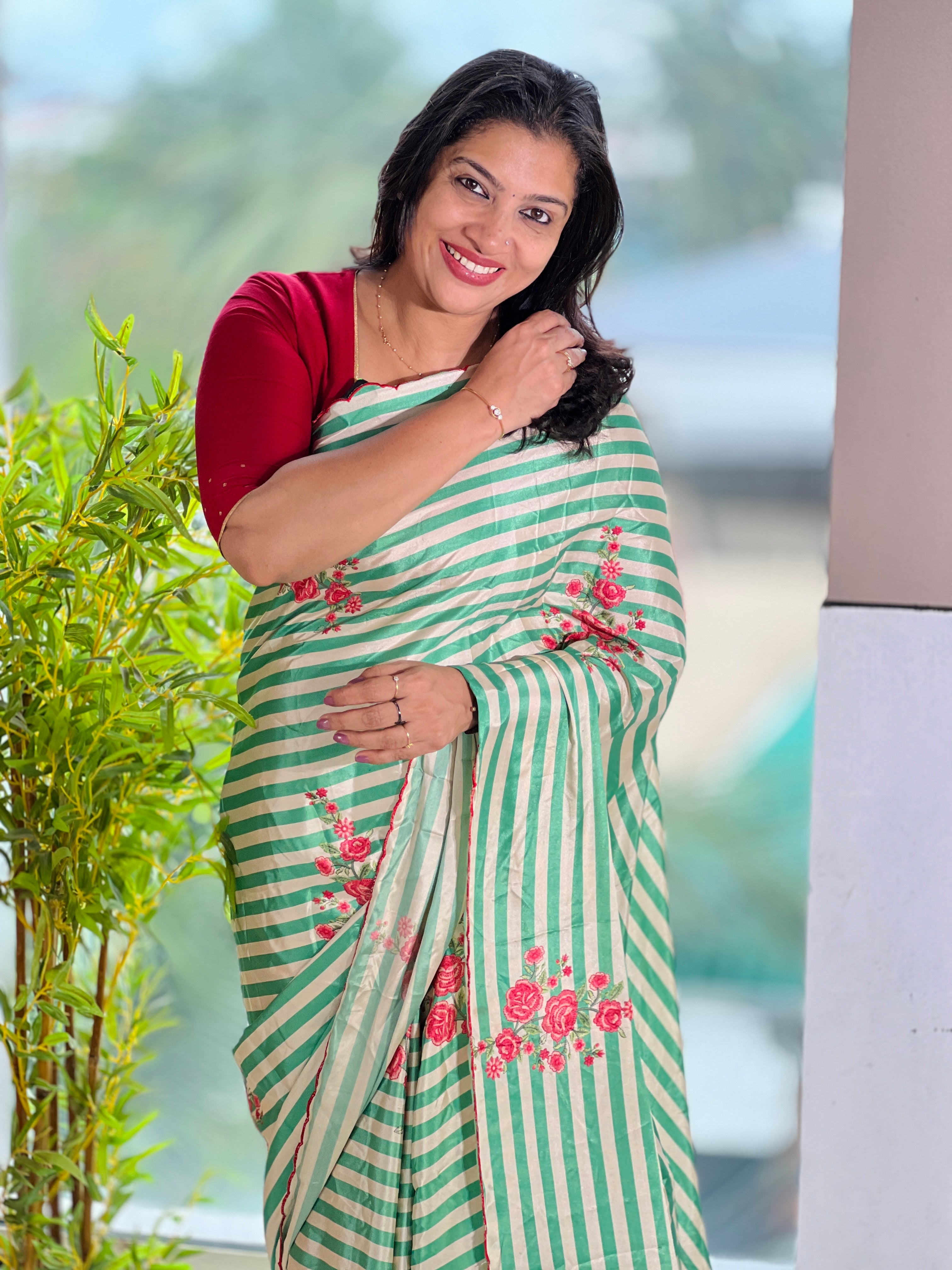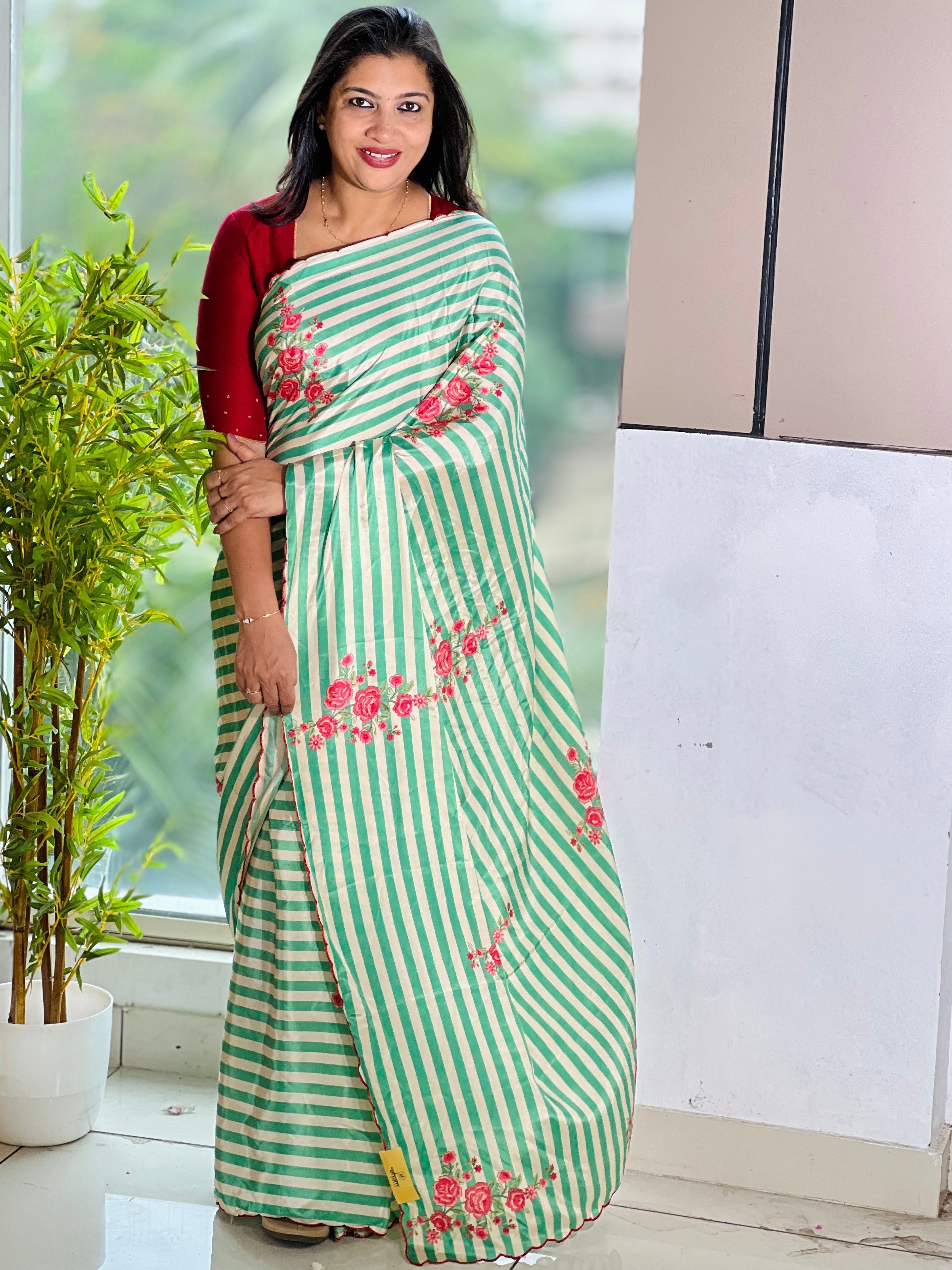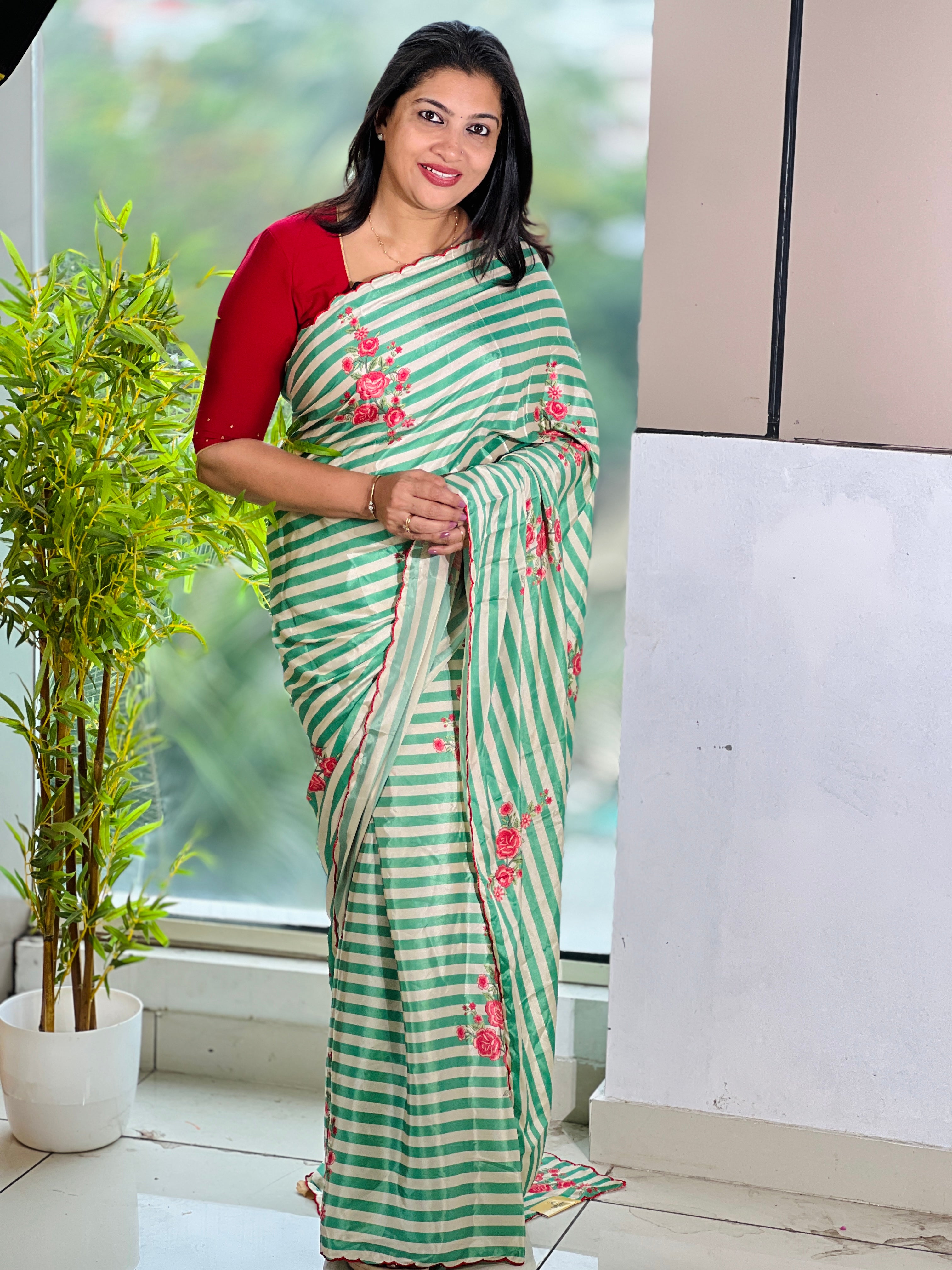 - Style: Stripe Pattern With Floral Digital Print Detailing, Scallop Edges
