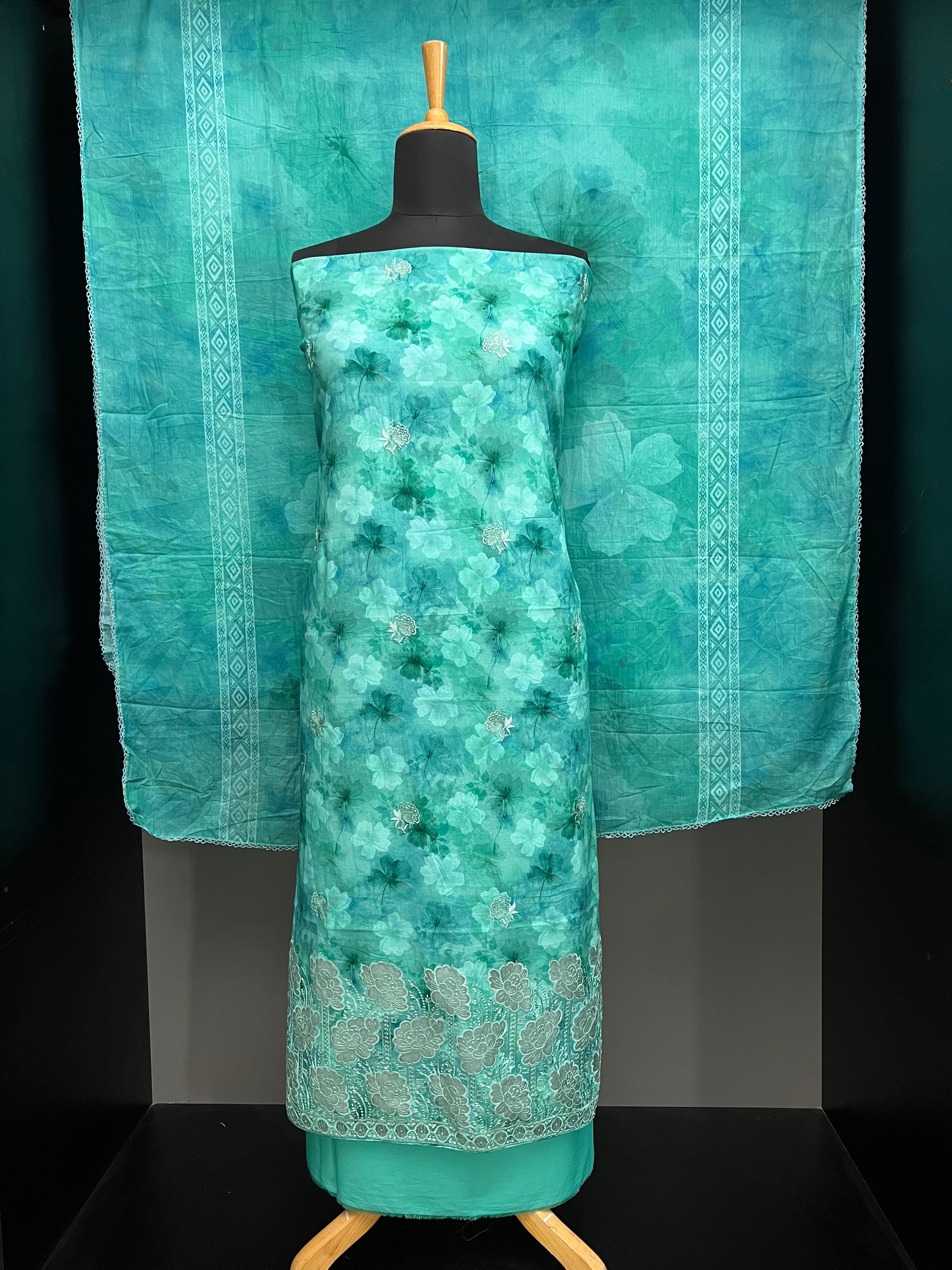 - Style: Floral Digital Print Pattern, Lower End Portion Sequence And Applique Work Highlighted, Scattered Machine Embroidery Detailed, Pipping Finish