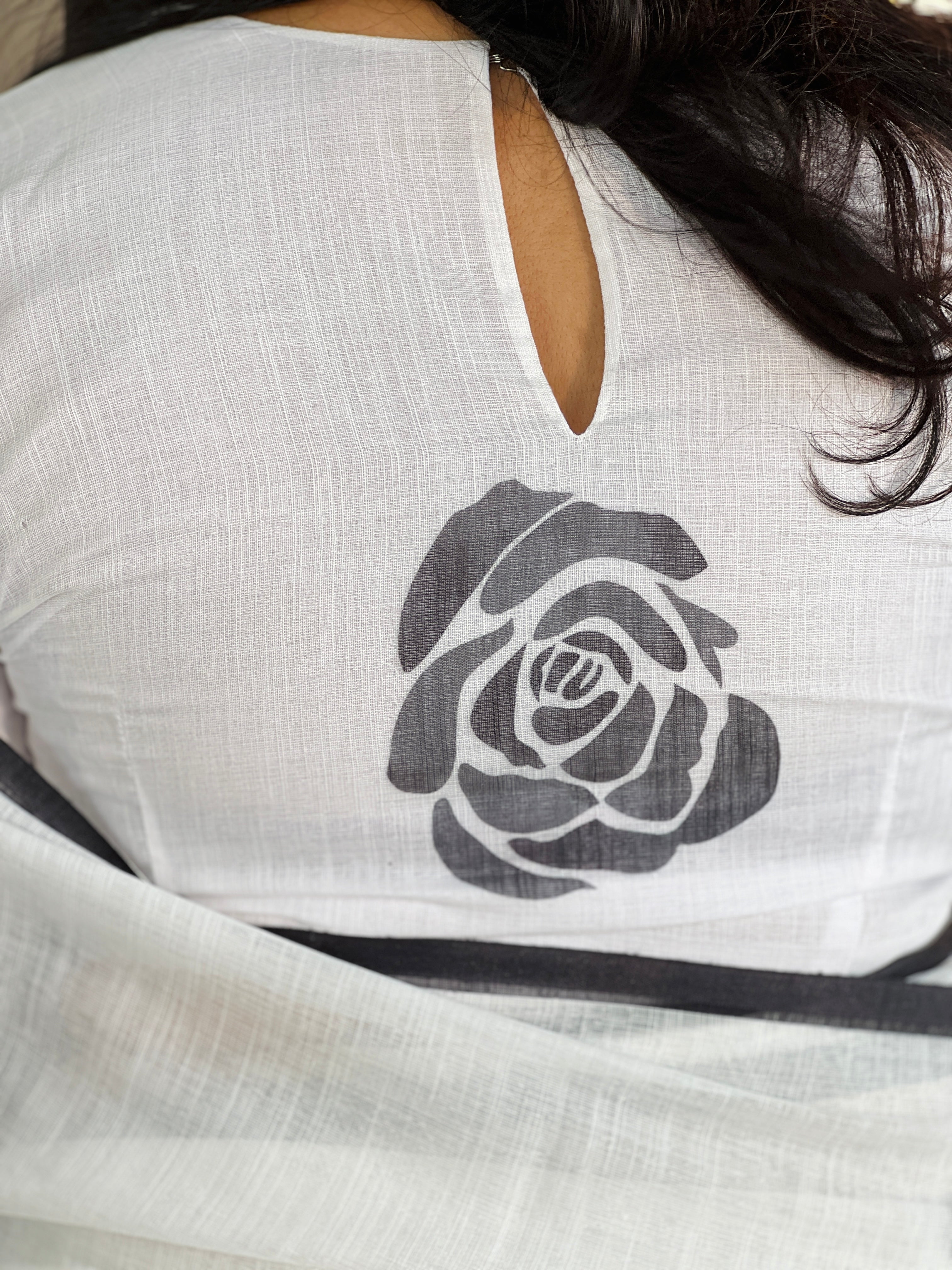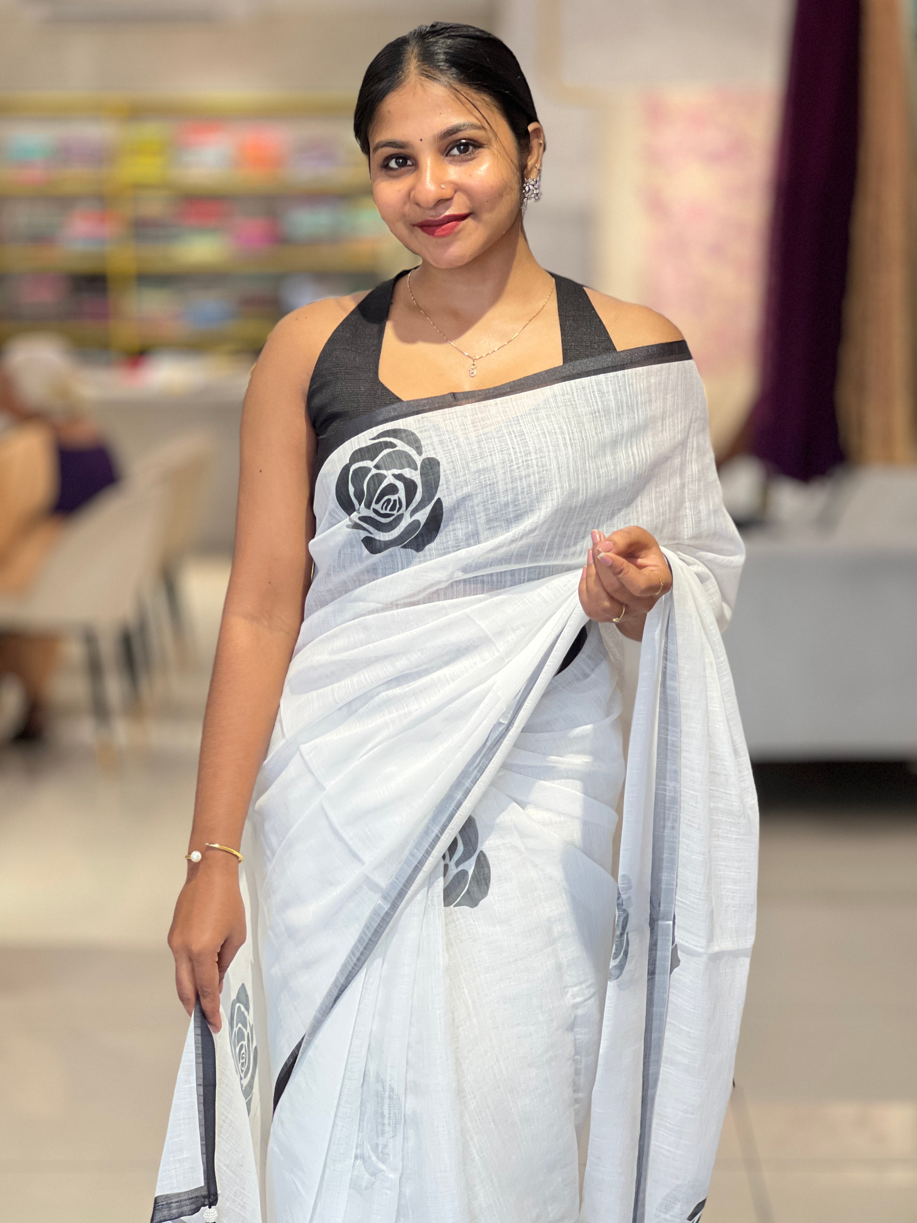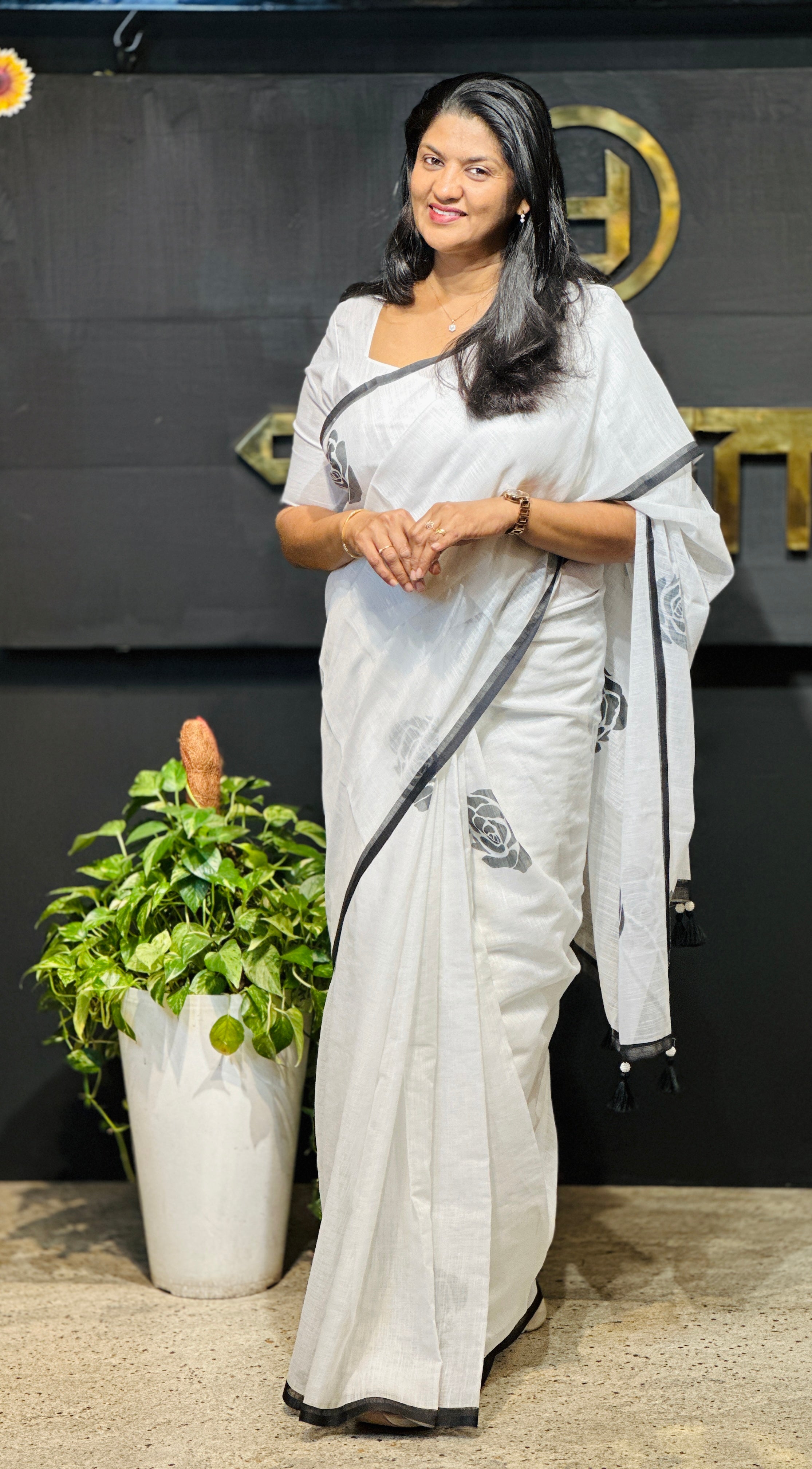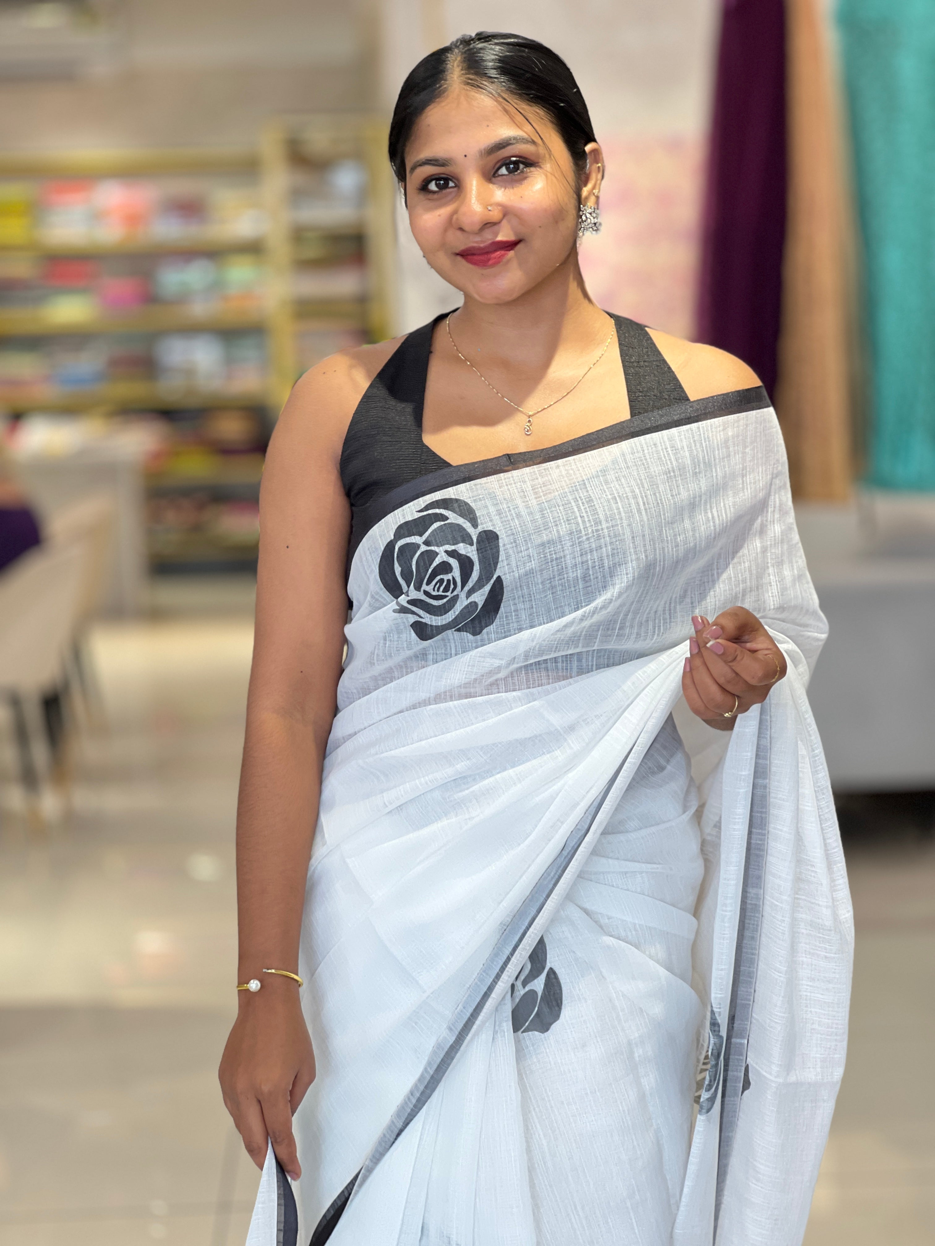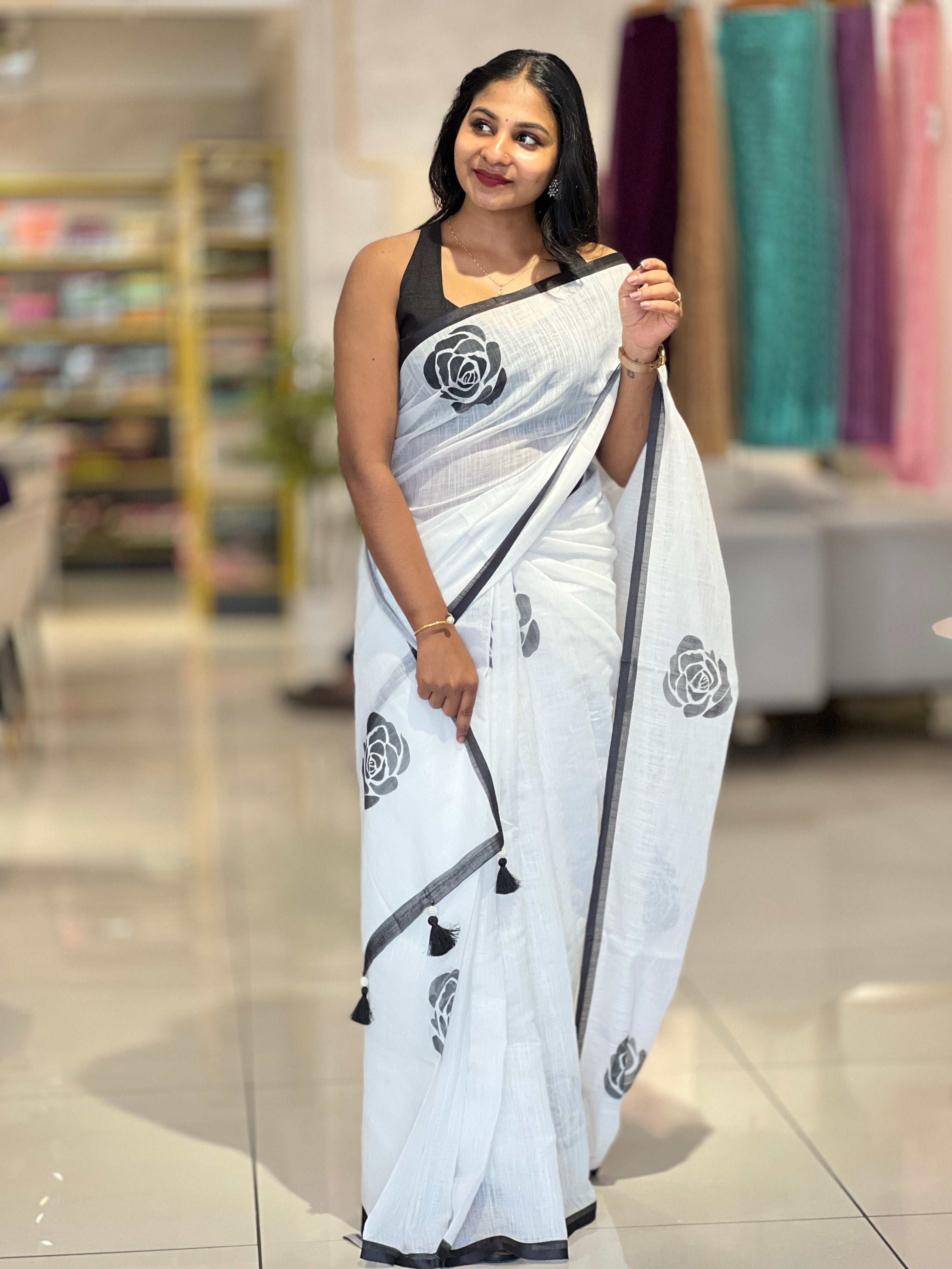 - Style: Scattered Rose Flower Digital Print Pattern, Black Kara Border Detailing, Tassels Attached